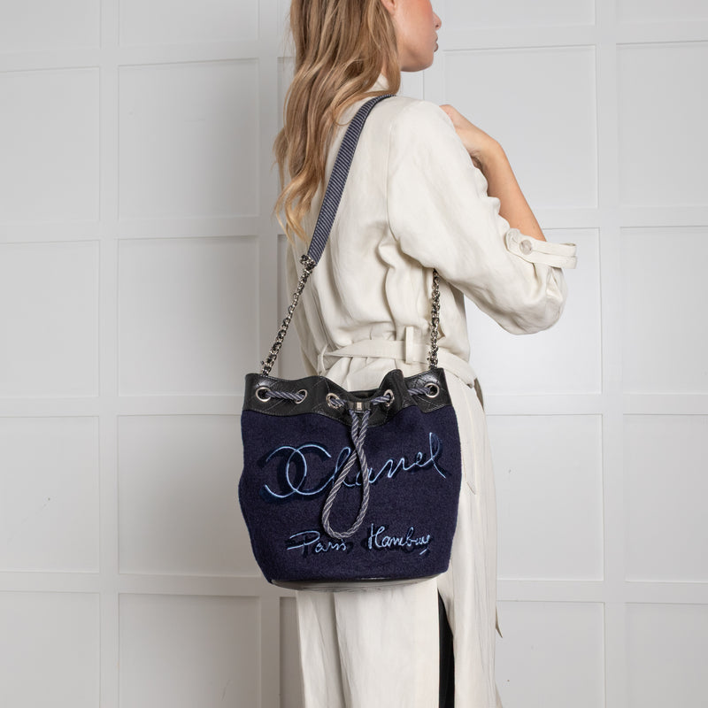 Chanel Navy Felt Black Leather Trim Paris Hamburg Bucket Bag
