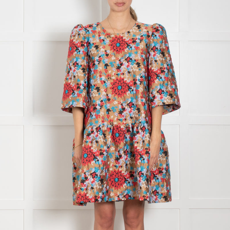 Essentiel Antwerp Tan Red Blue Floral Peplum Short Dress