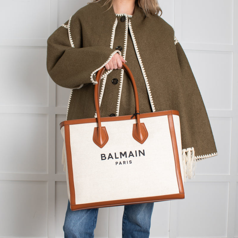 Balmain Tan and Canvas Leather Logo Tote Bag