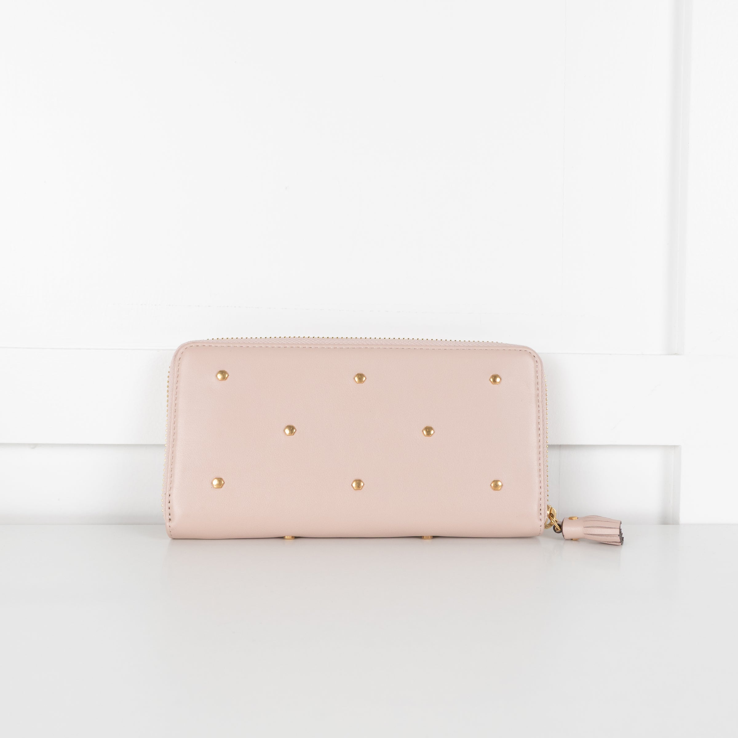 Anya Hindmarch pink leather wallet with gold-tone studs and top zip closure with tassel detailing. This purse features 12 internal card slots, one middle zip compartment and four side slip compartments.