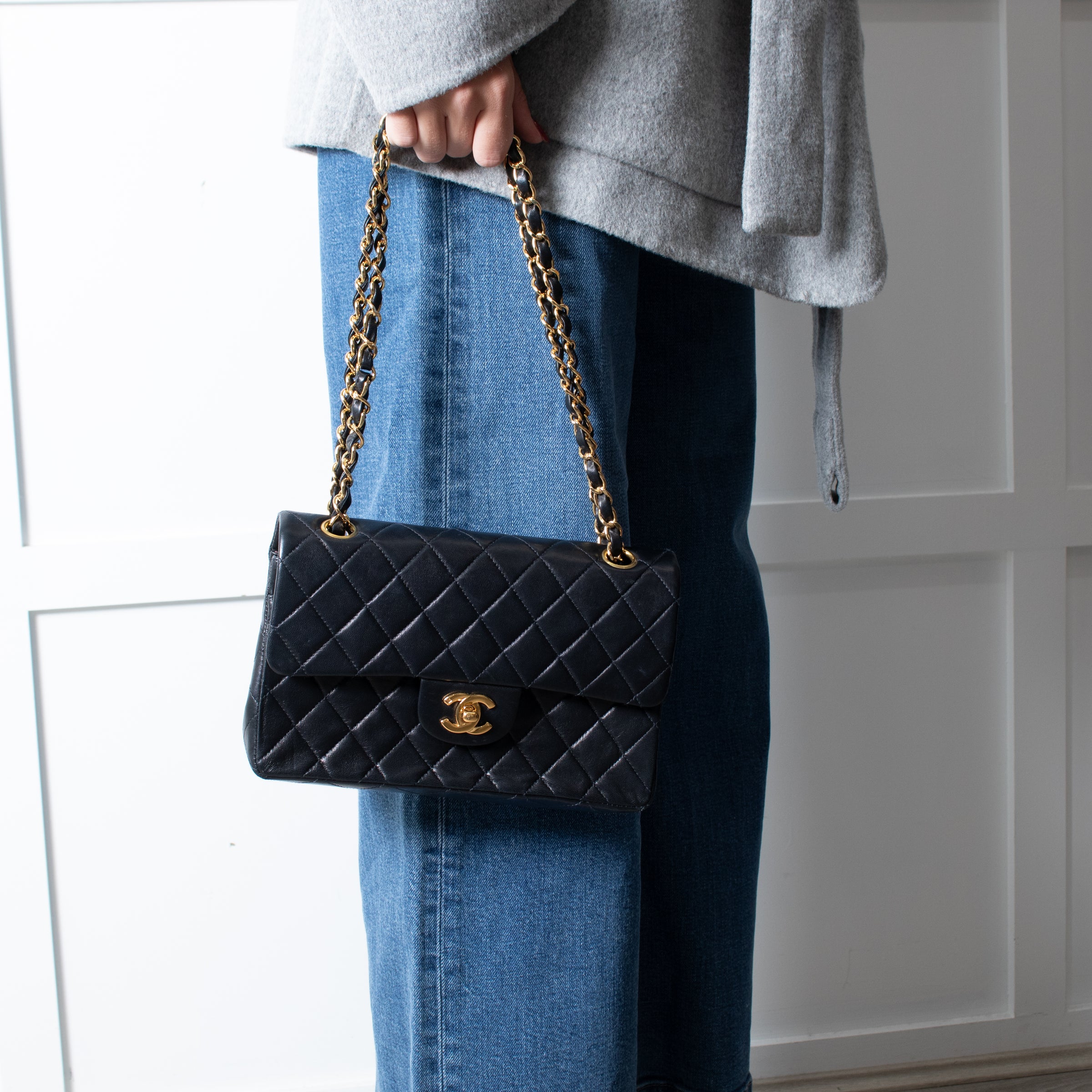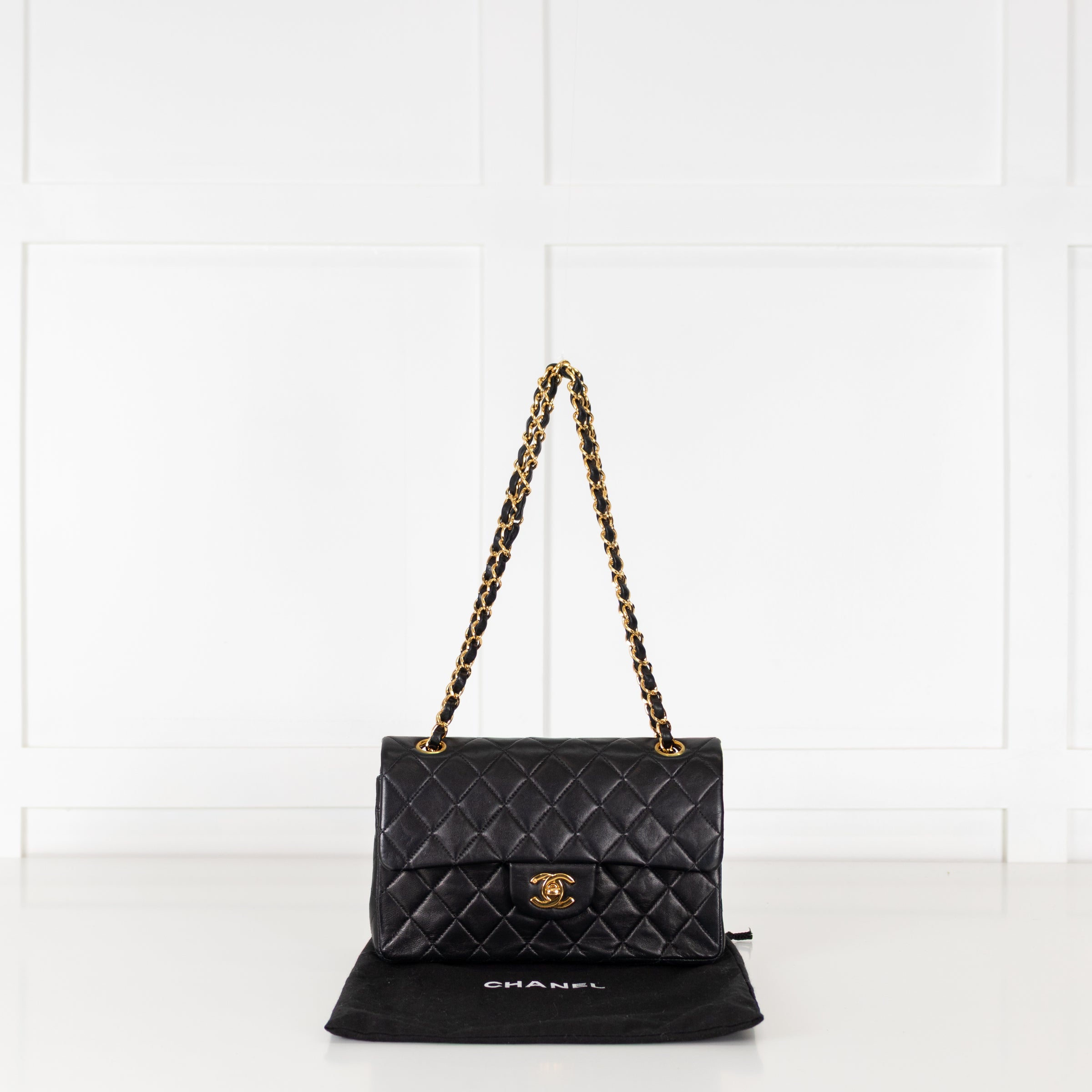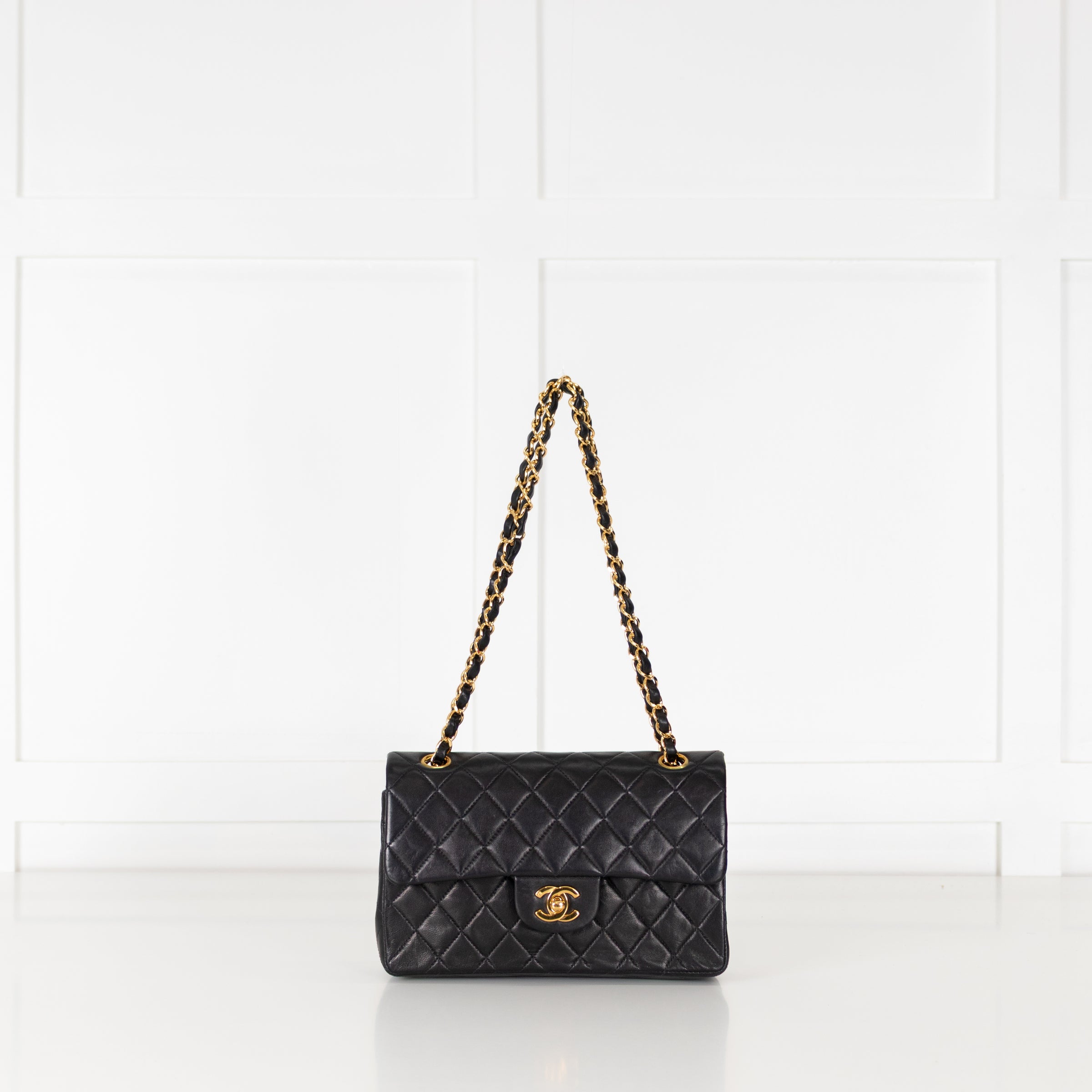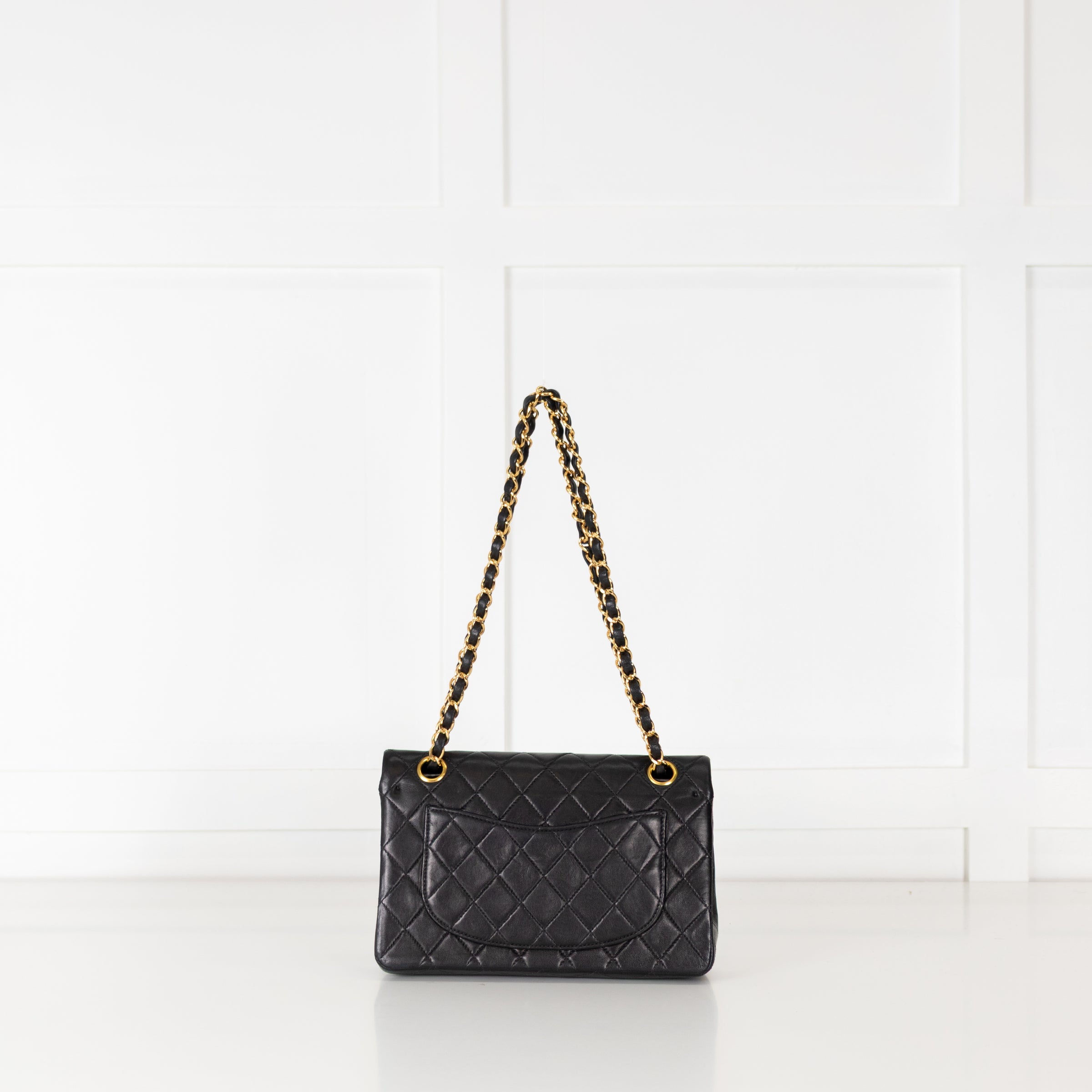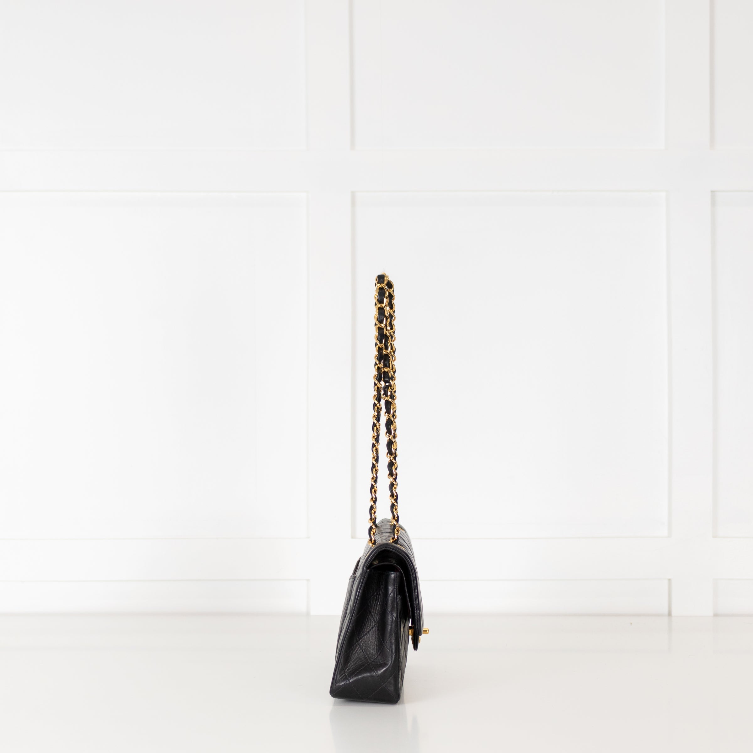 Chanel vintage (2000-2002) medium double flap bag in black quilted lambskin leather with 24ct gold-plated hardware. Features woven leather chain straps, an exterior back slip pocket, and double front flaps with classic interlocking CC twist lock closure. Has very light signs of wear to the corners. Accompanied by the original dust bag.