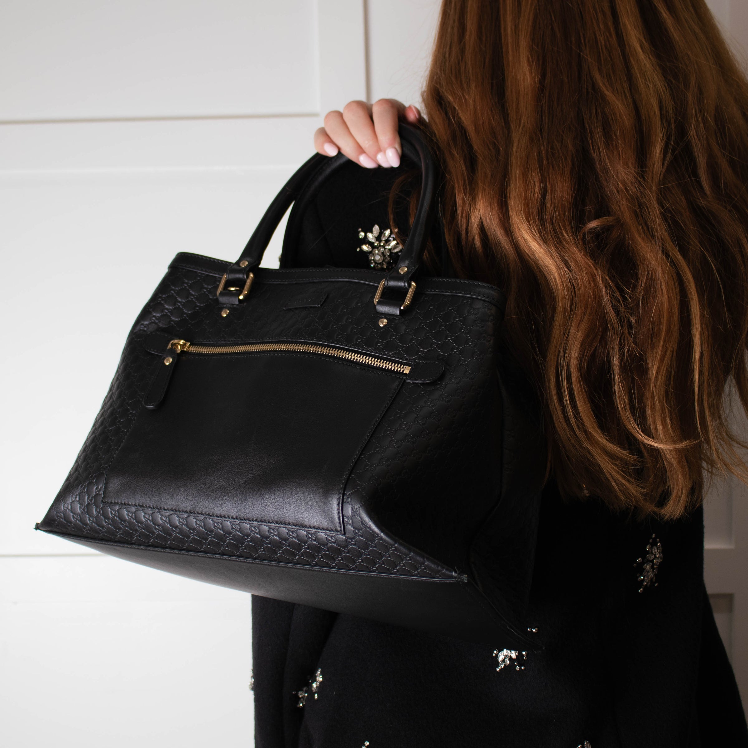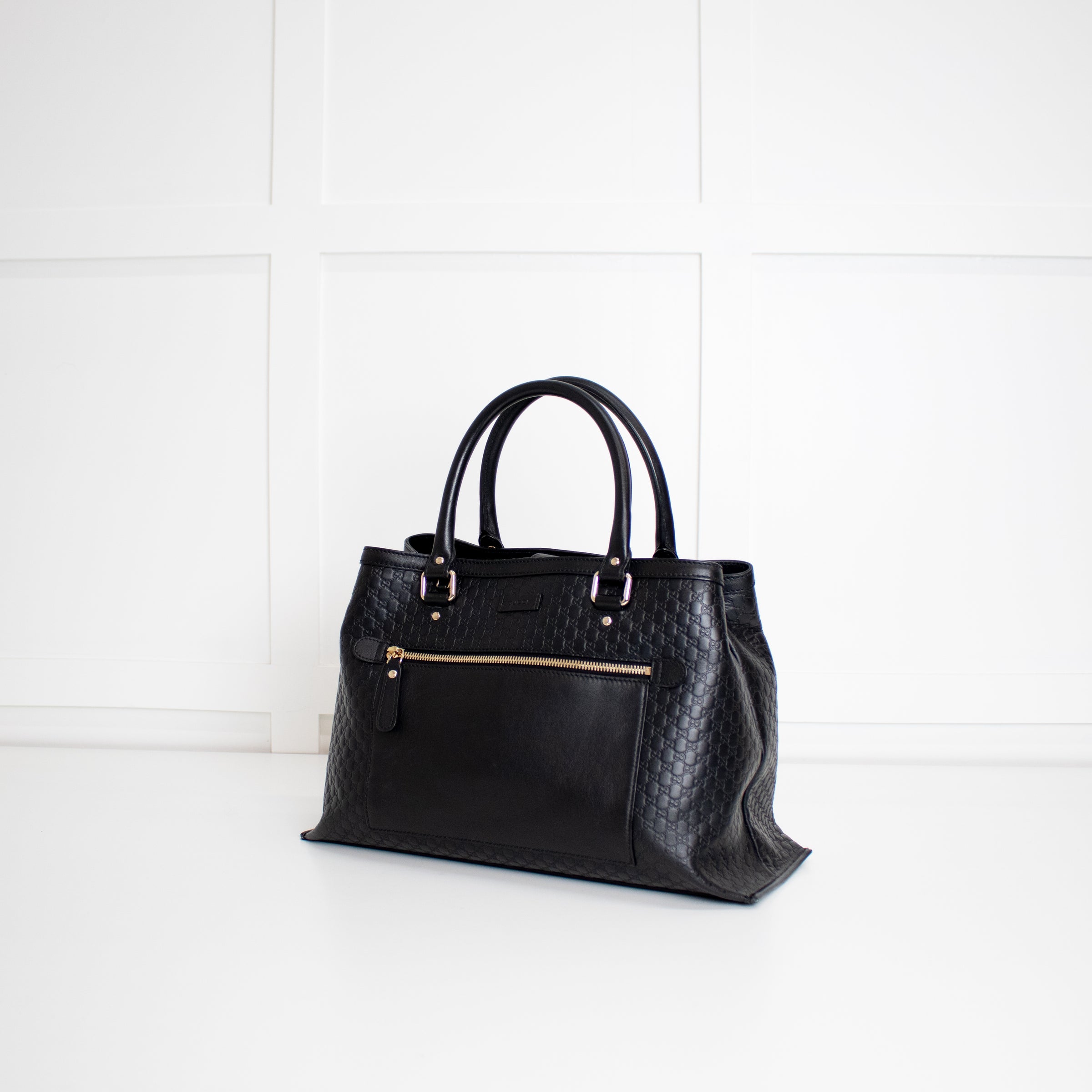 Gucci black embossed micro Guccisimma monogram leather tote bag with pale gold hardware, a front zipped pocket, dual rolled top handles, and a popper closure top. Opening onto a sectioned interior with a central zipped compartment and two open outer compartments. Accompanied by the matching long crossbody strap, and dust bag.