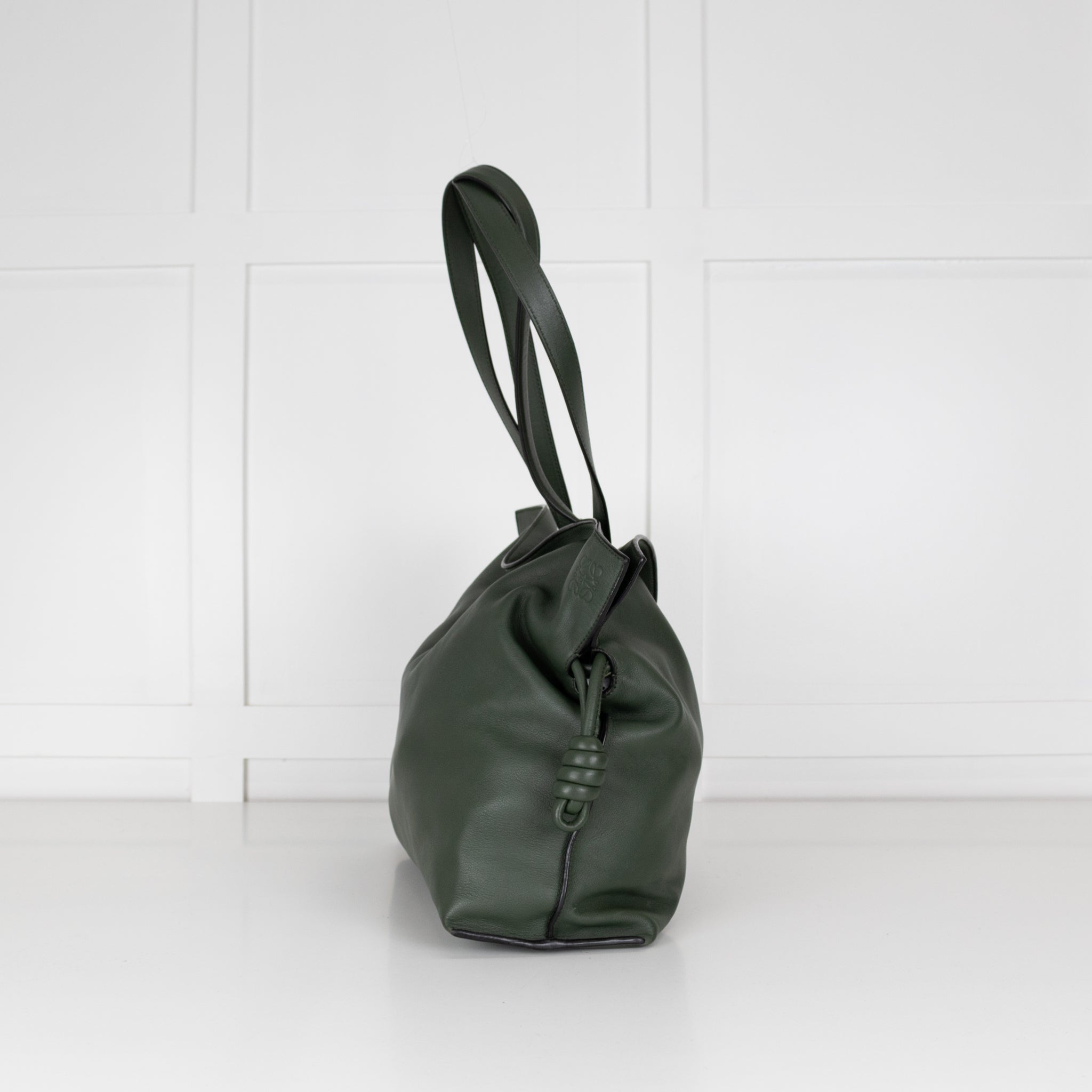 Loewe (2022) green flamenco knot large nappa leather clutch bag with dual top handles, drawstring top closure with signature coiled knots, embossed Loewe logo, and one main interior compartment with an internal zipped pocket. Current season, RRP £2,450.