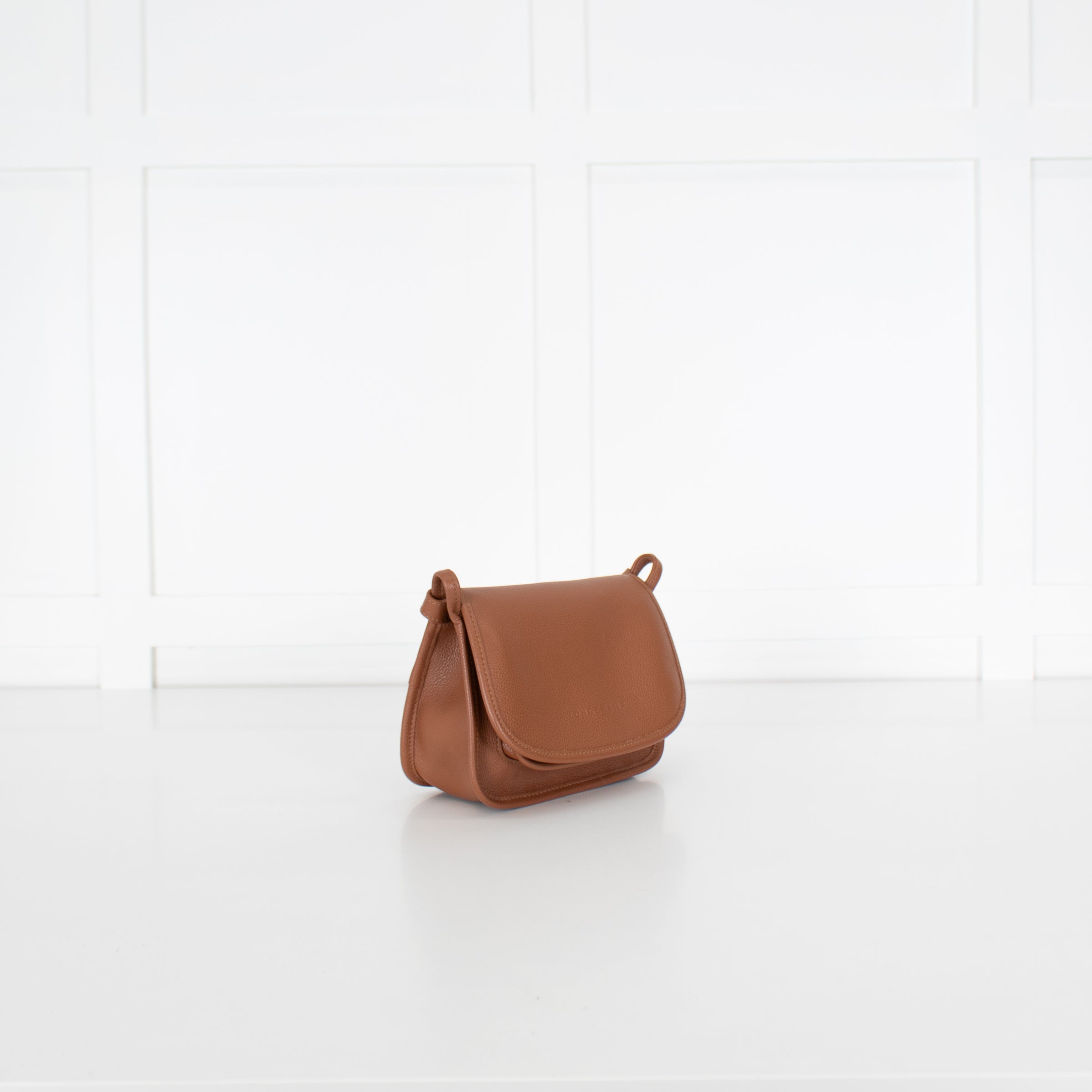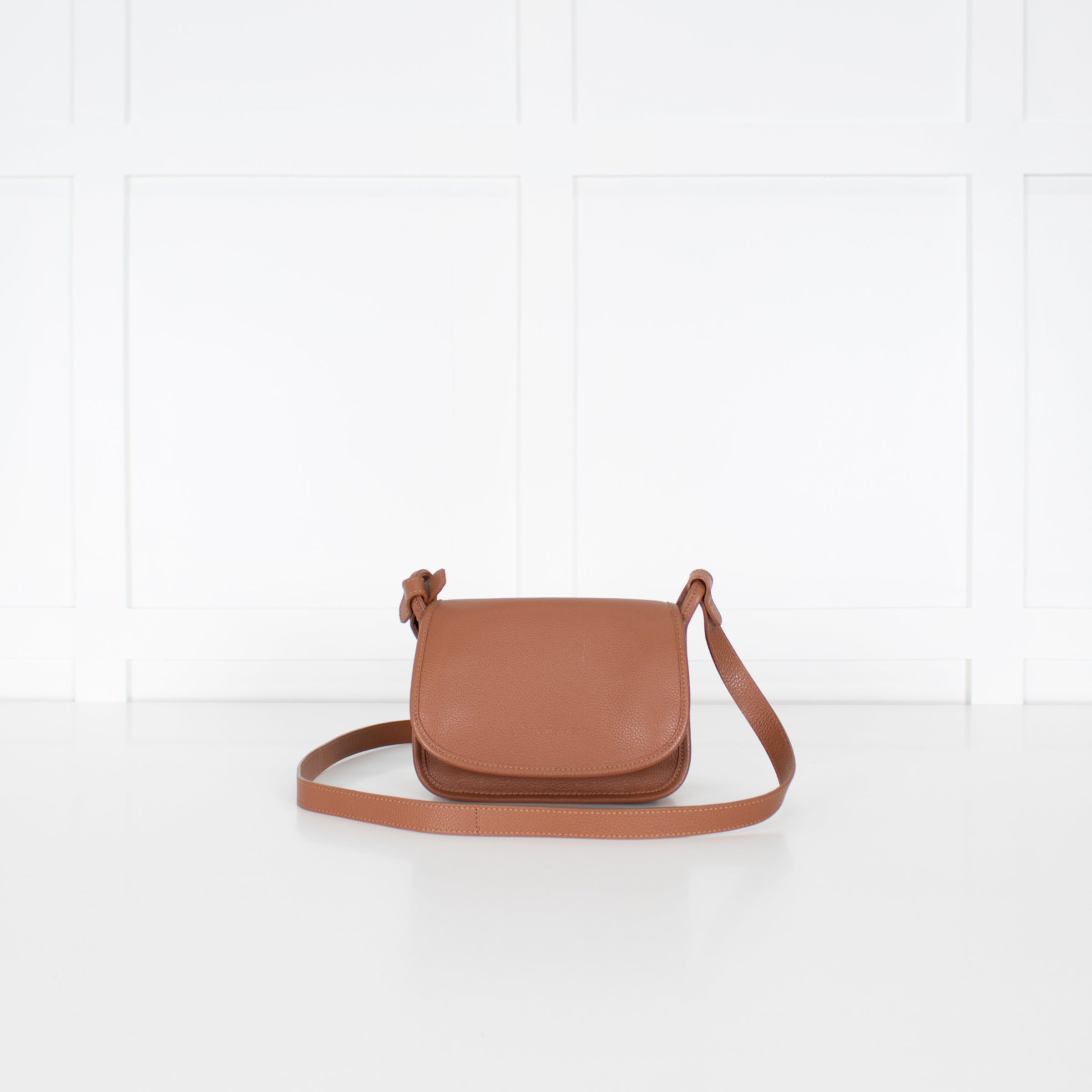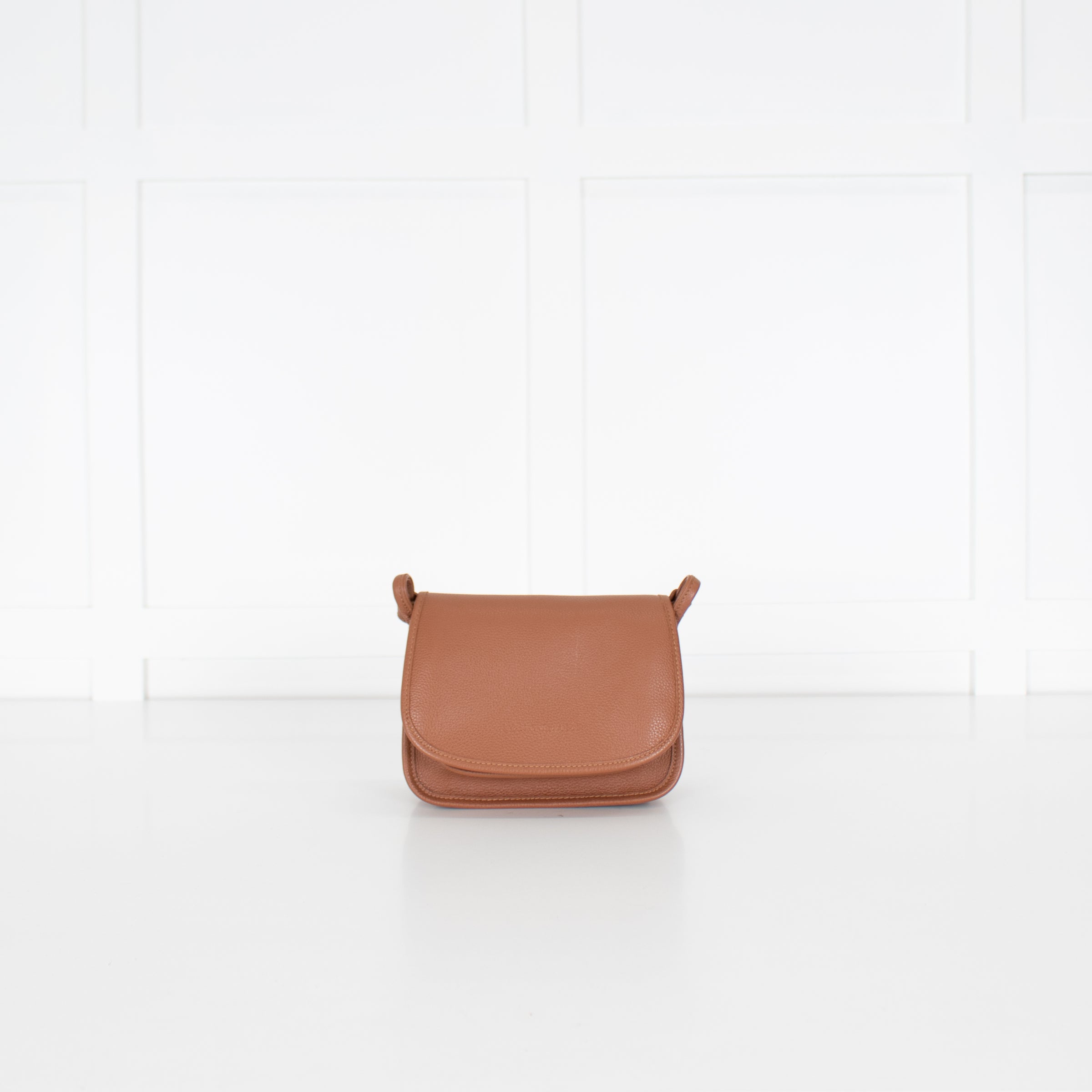 Longchamp Le Foulonne XS tan grained leather crossbody bag with an adjustable strap, front flap, magnetic snap closure, and tonal top stitching.