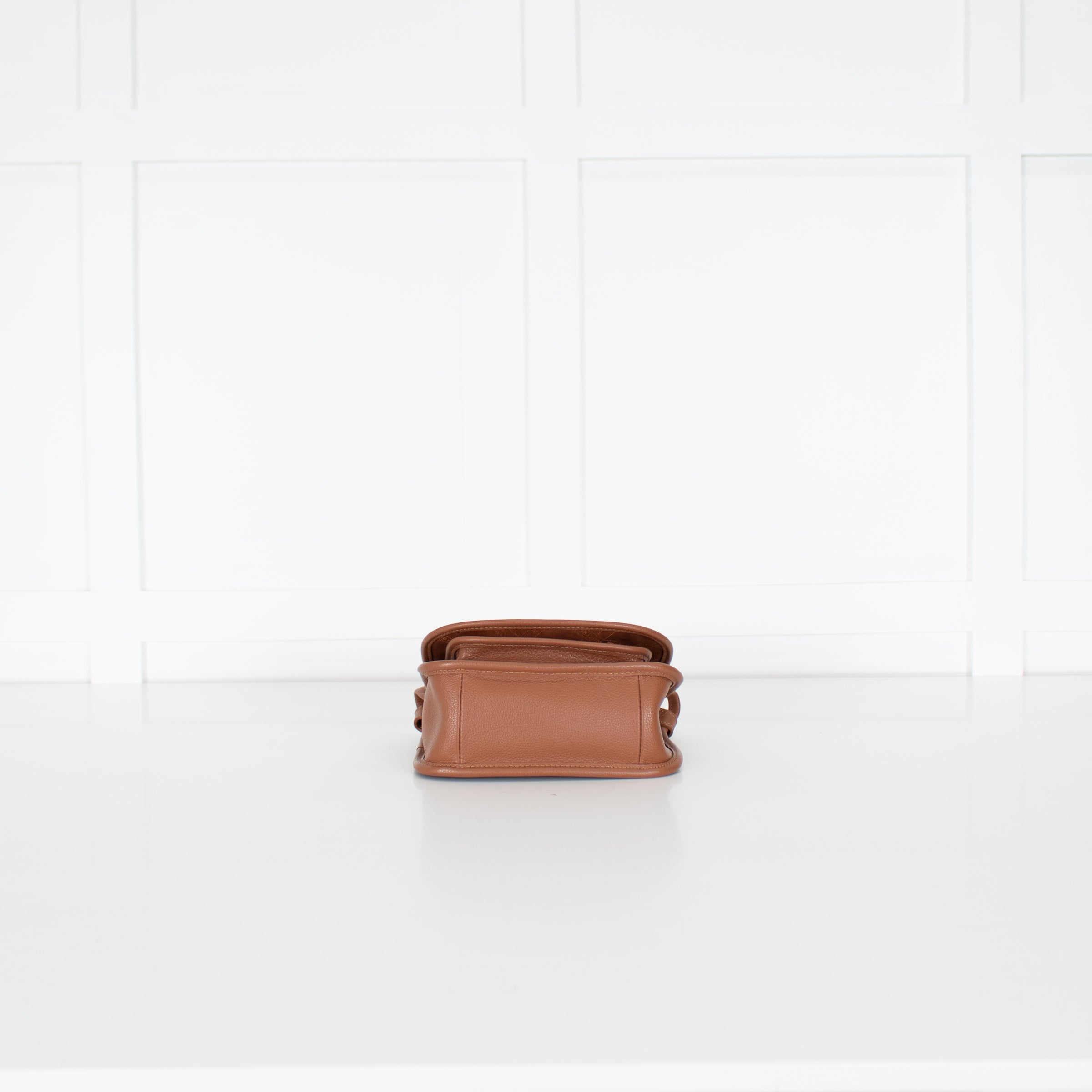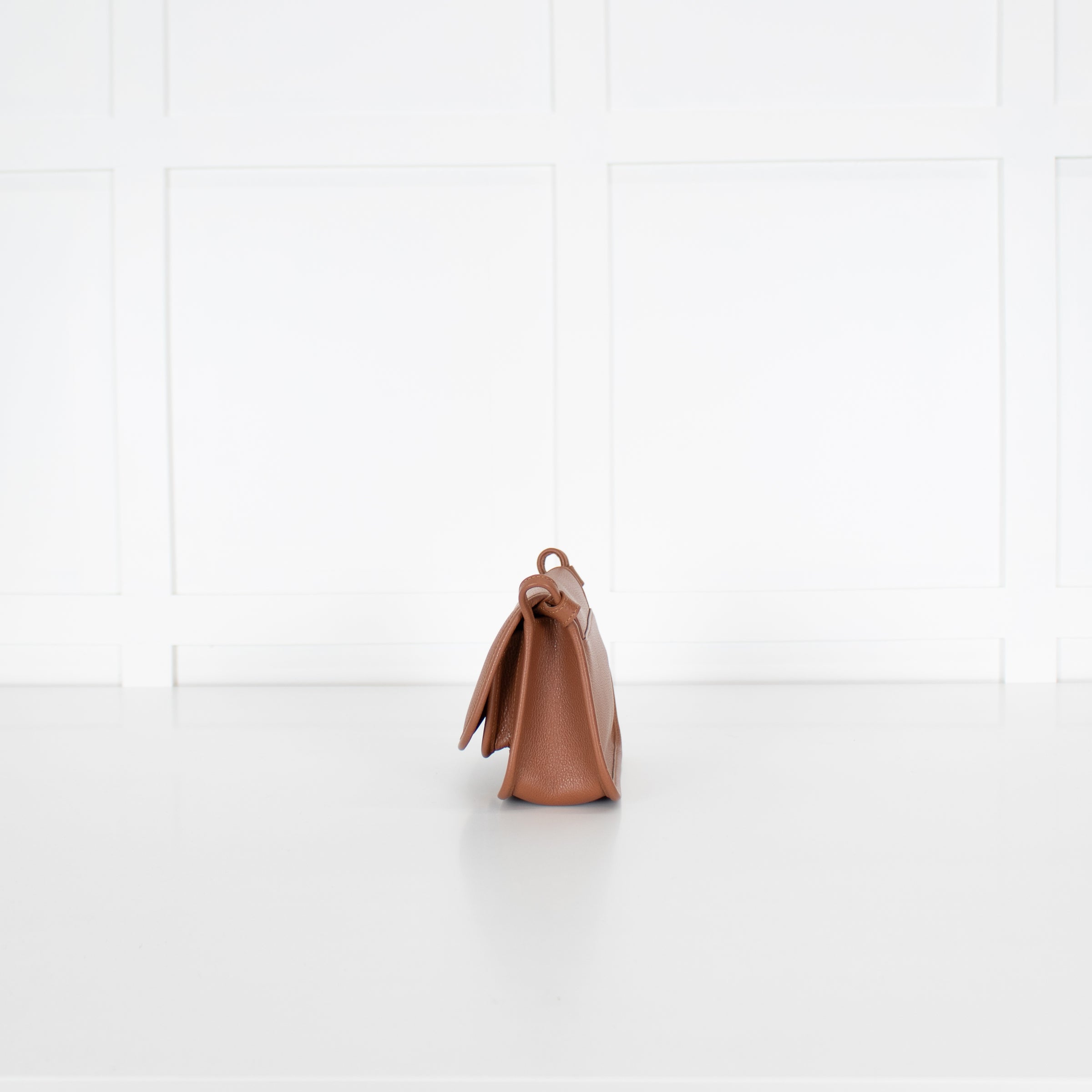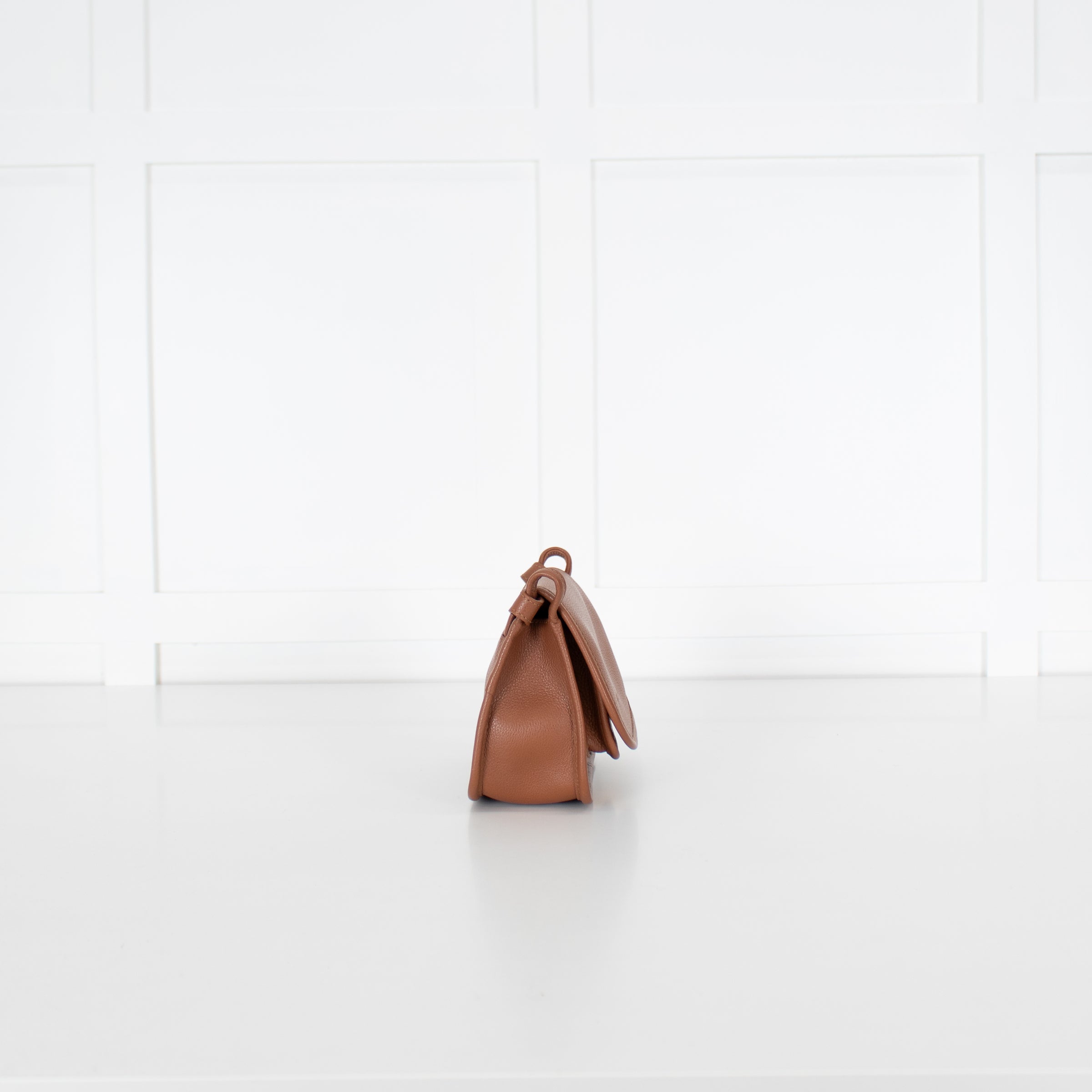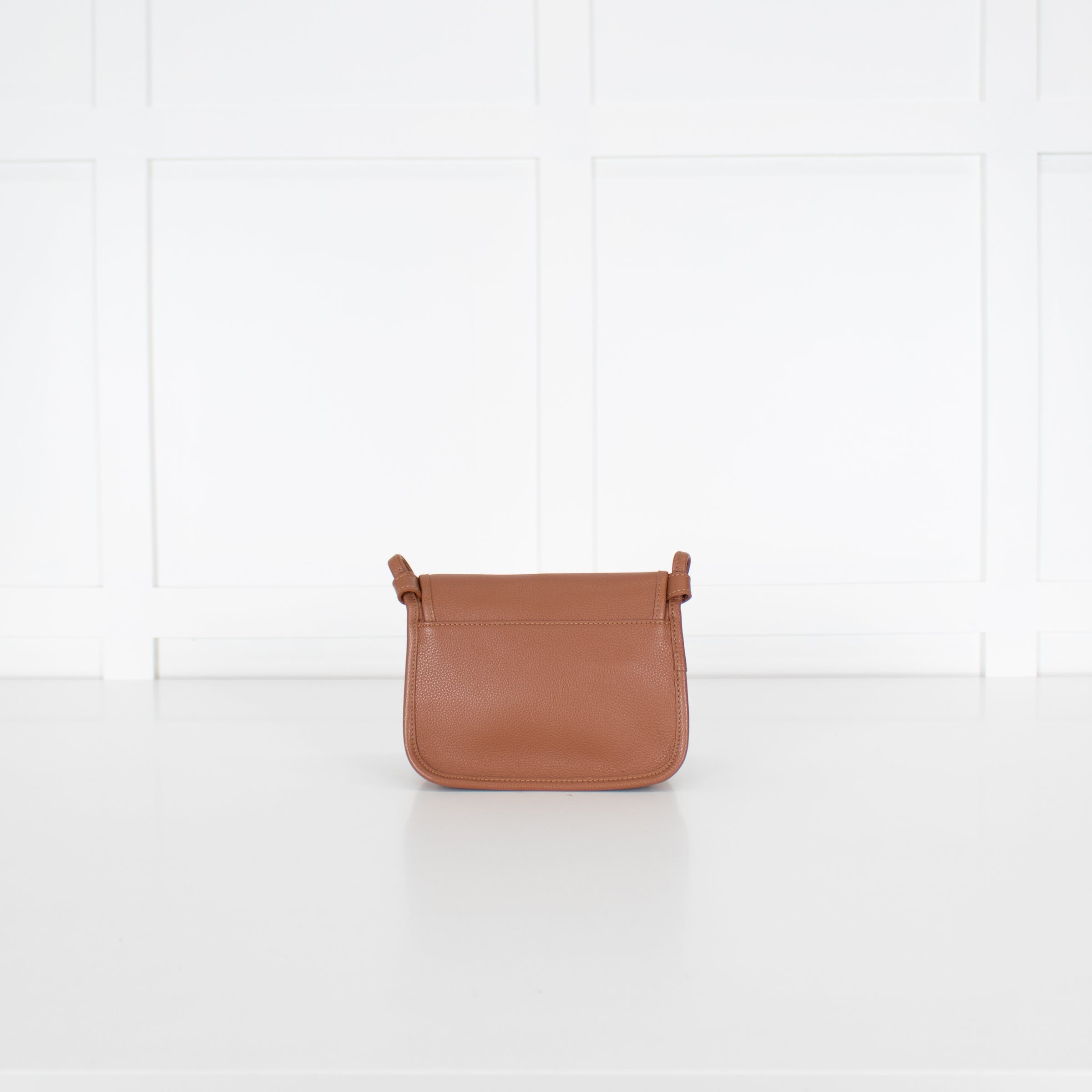 Longchamp Le Foulonne XS tan grained leather crossbody bag with an adjustable strap, front flap, magnetic snap closure, and tonal top stitching.