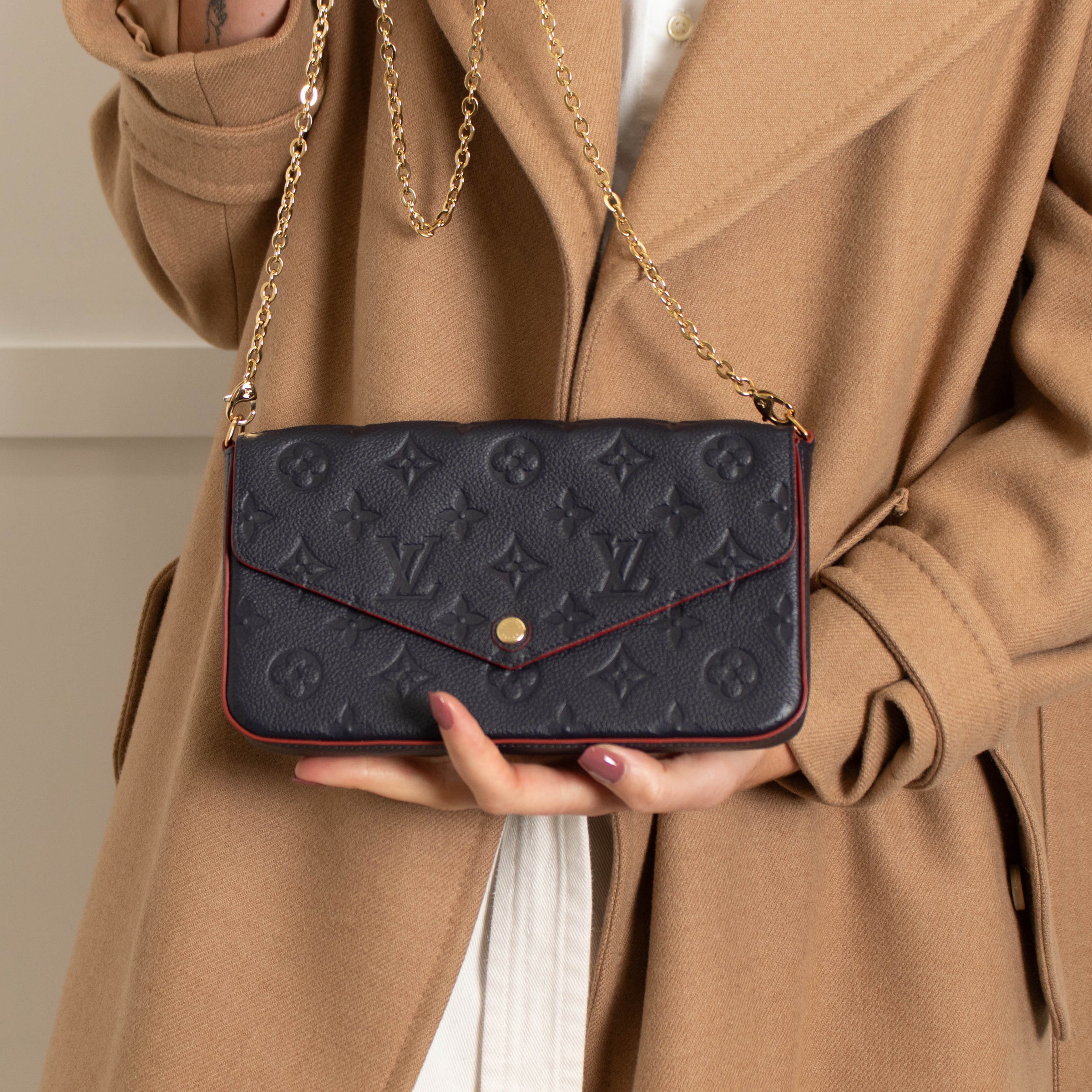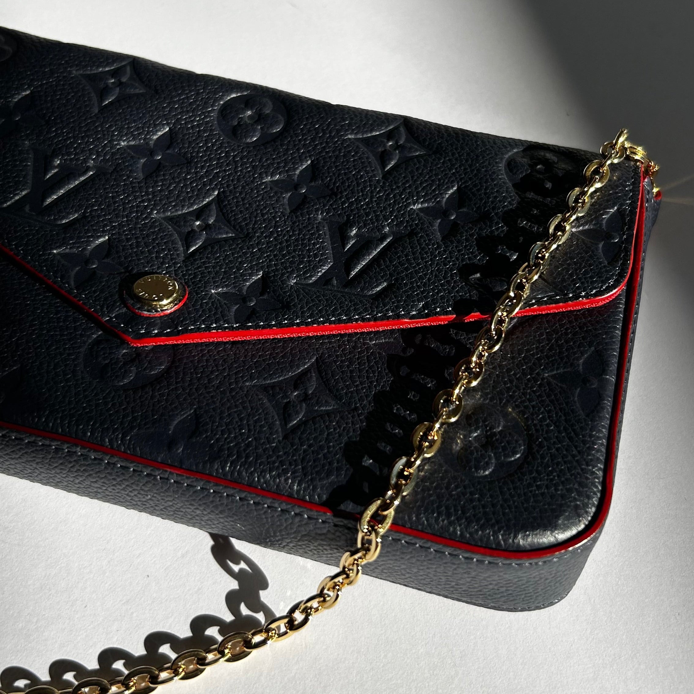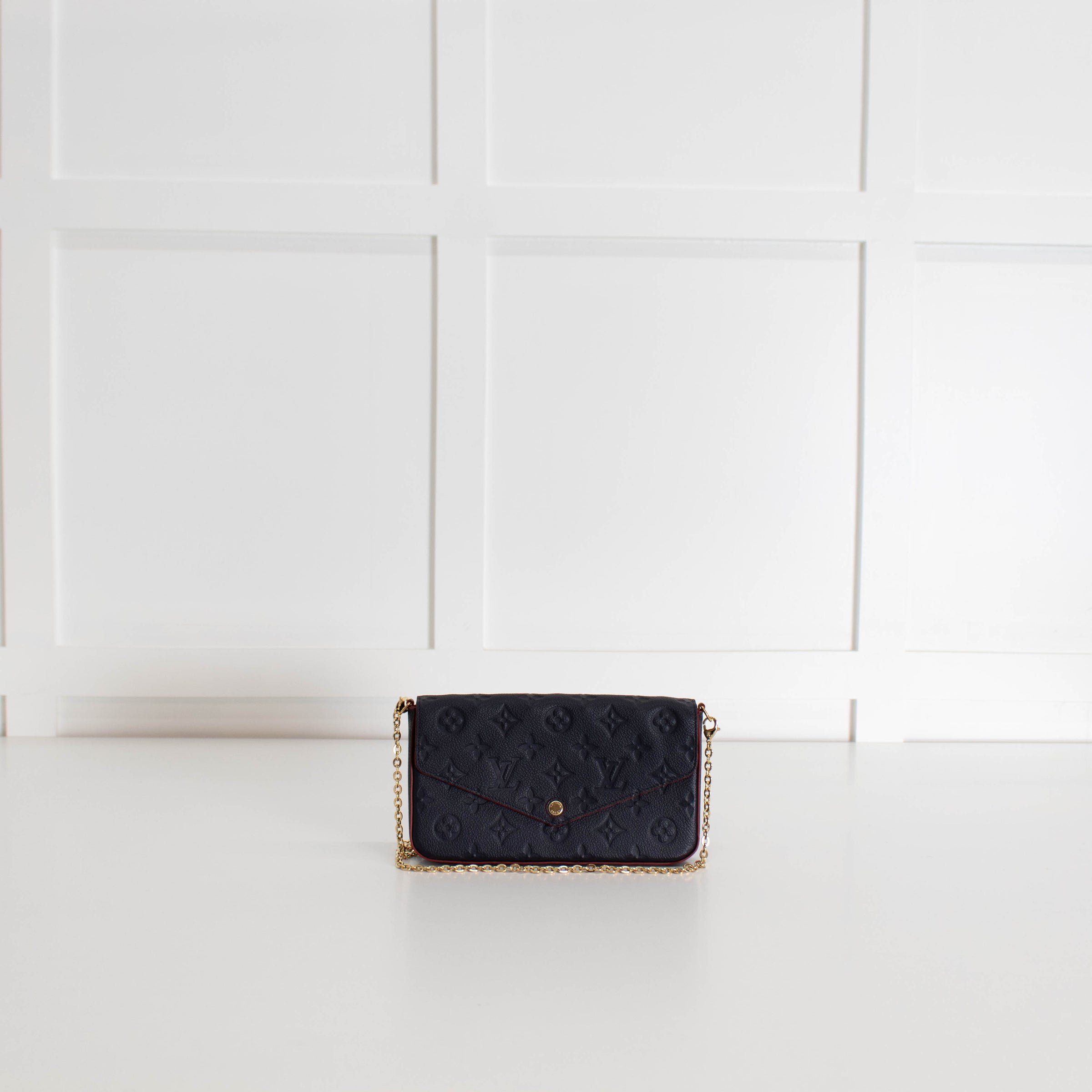 Louis Vuitton (2018) navy blue Pochette Félicie bag crafted in Monogram Empreinte embossed leather. This envelope style bag contains a spacious compartment with two removable pockets: one zipped, one with eight card slots. It can also be carried cross-body, on the shoulder or as a clutch, thanks to its removable chain. Finished with red edge paint and lining detailing. With the original dust bag.