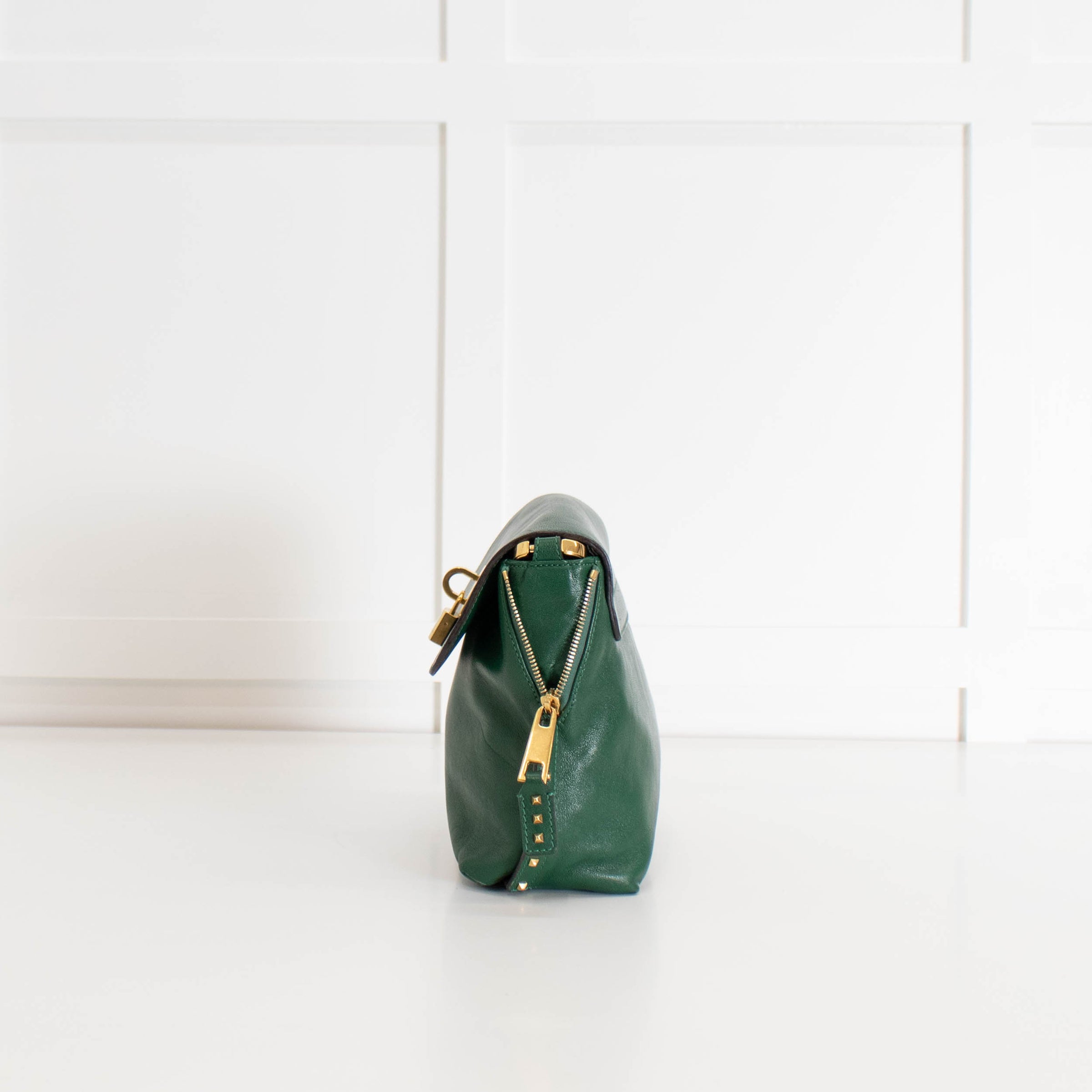 Marc Jacobs green leather 'Vera' handbag with gold-tone metal hardware, square studded detailing, an adjustable flat leather strap, and padlock detailing on the front.