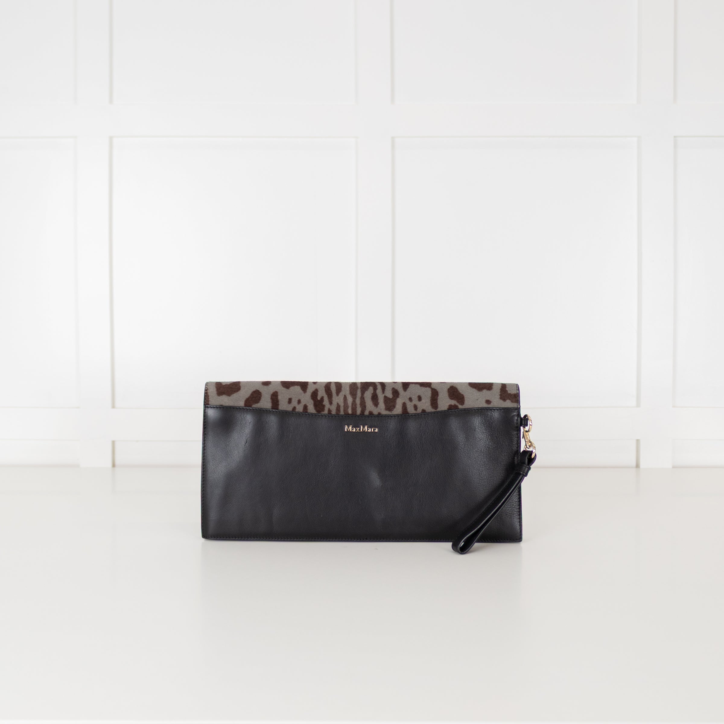 Max Mara black and grey large clutch bag, with a stunning animal ponyskin exterior, leather interior with a single front button, and an inside zipped compartment.