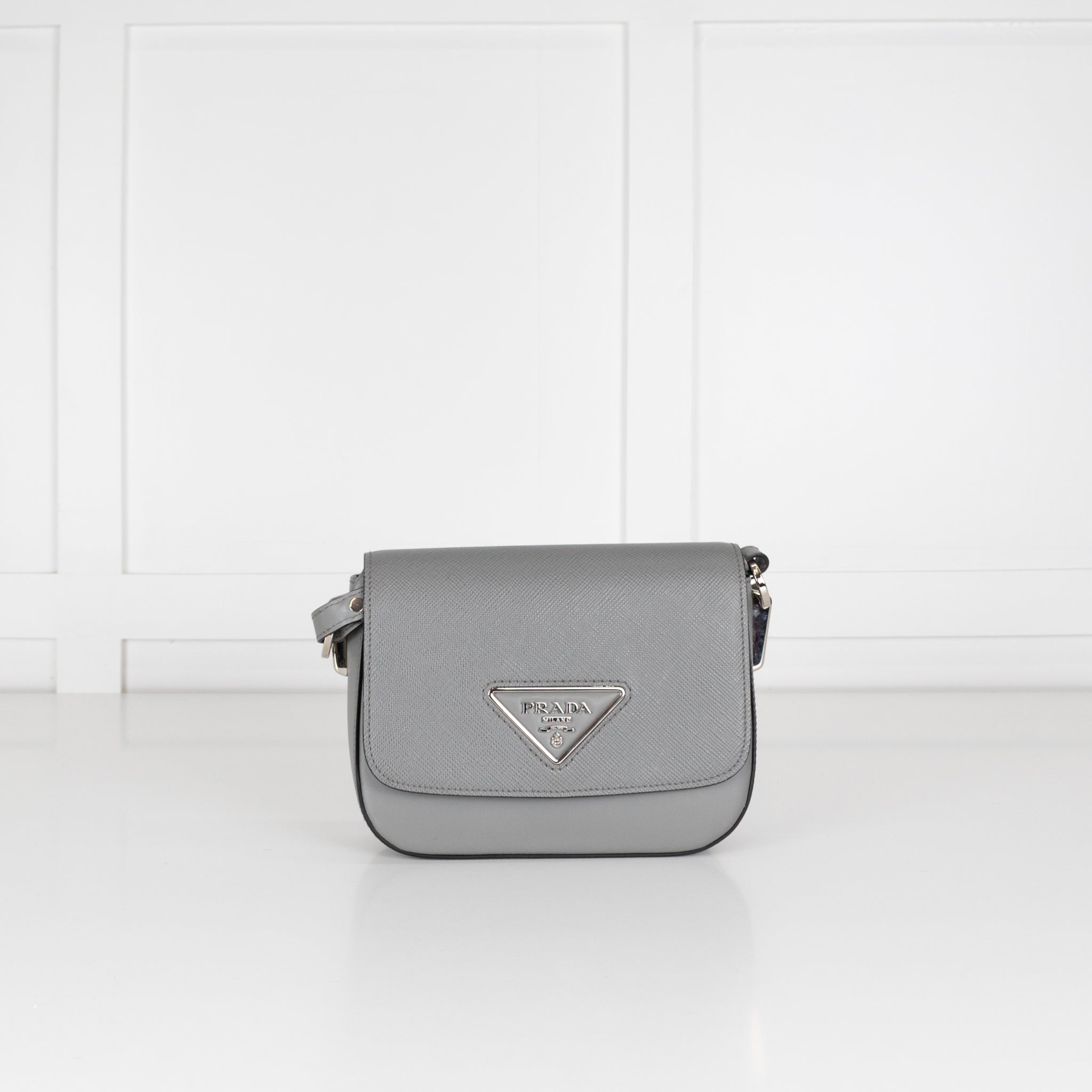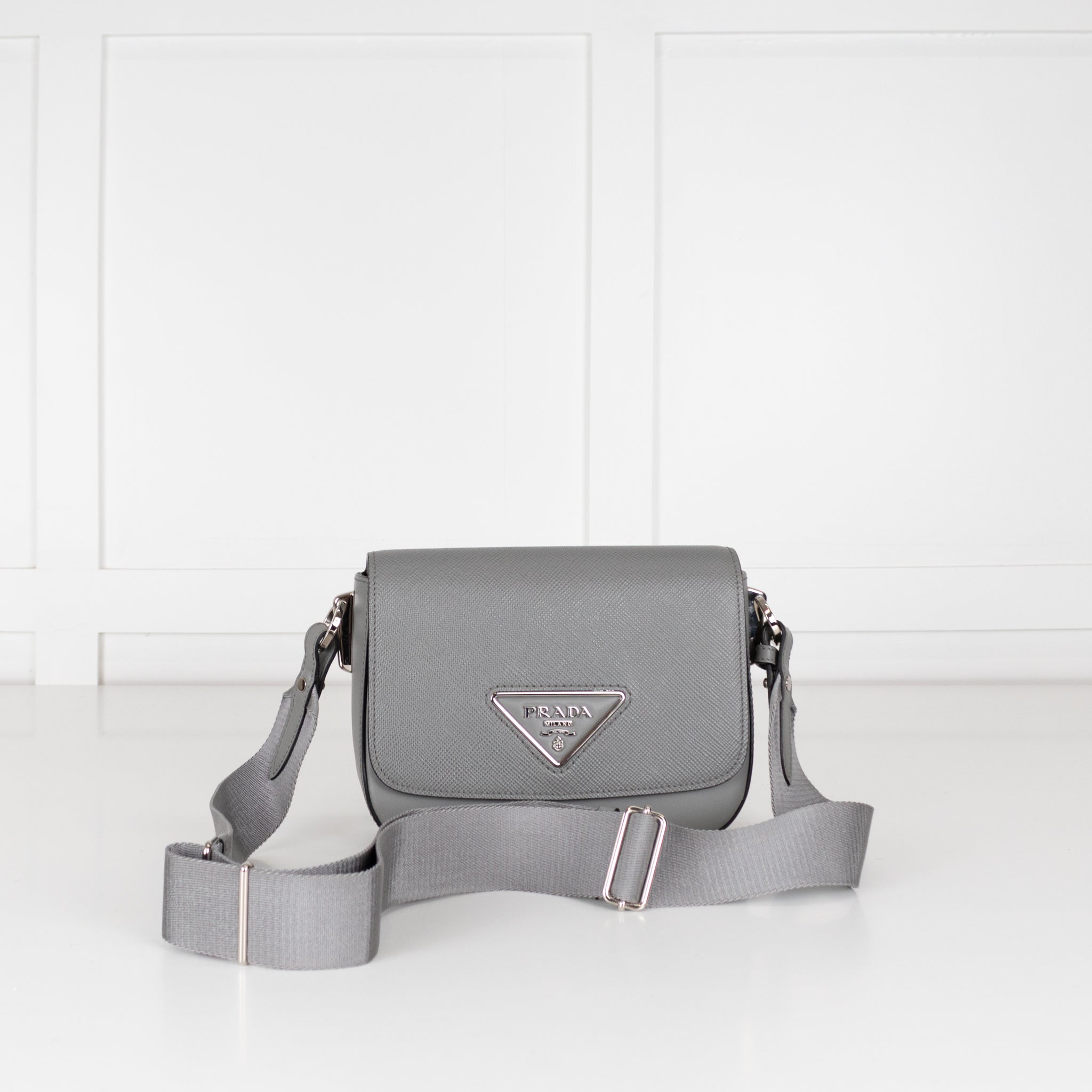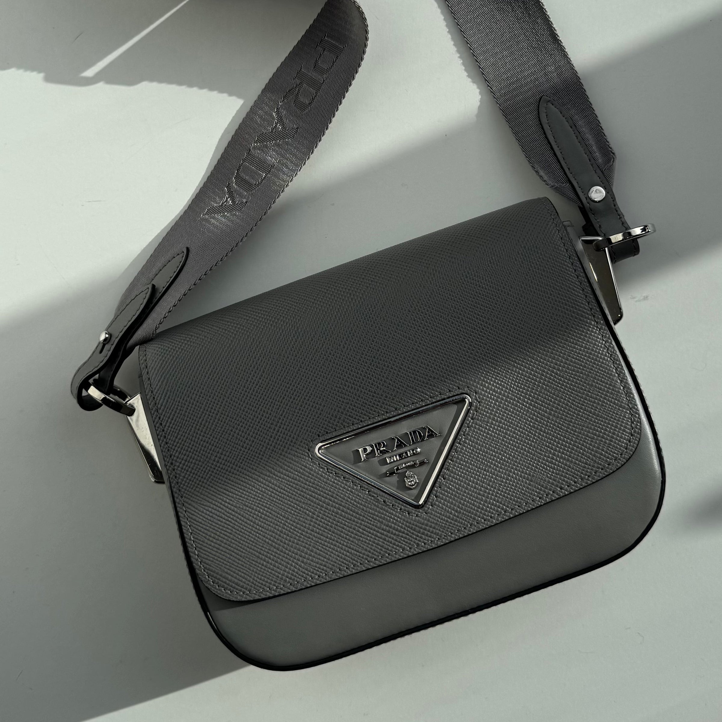 Prada Identity bag crafted in grey Saffiano leather with the iconic triangle logo feature in a silver-tone metal. This bag features an adjustable canvas crossbody strap, front magnetic closure, and is lined internally with a black leather.