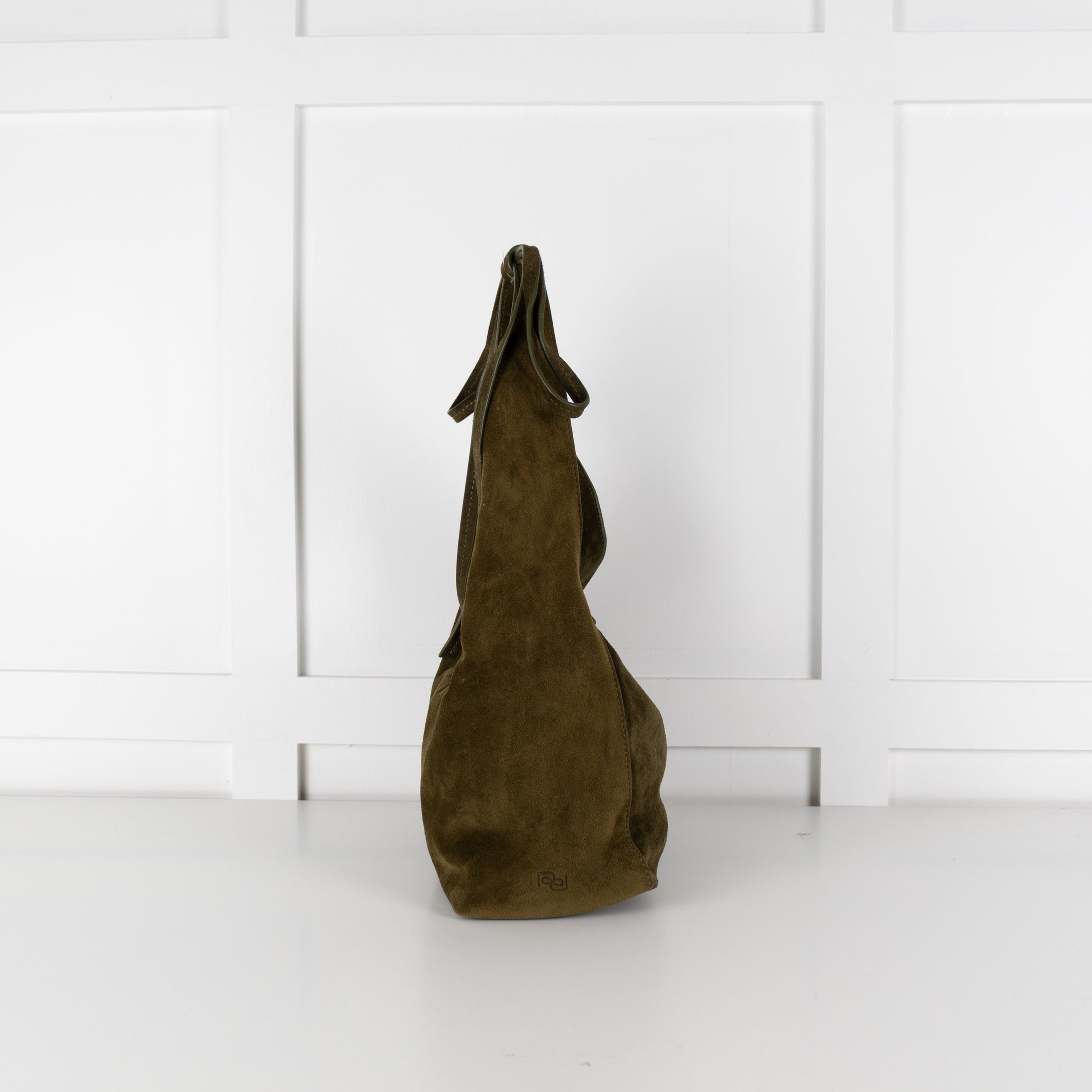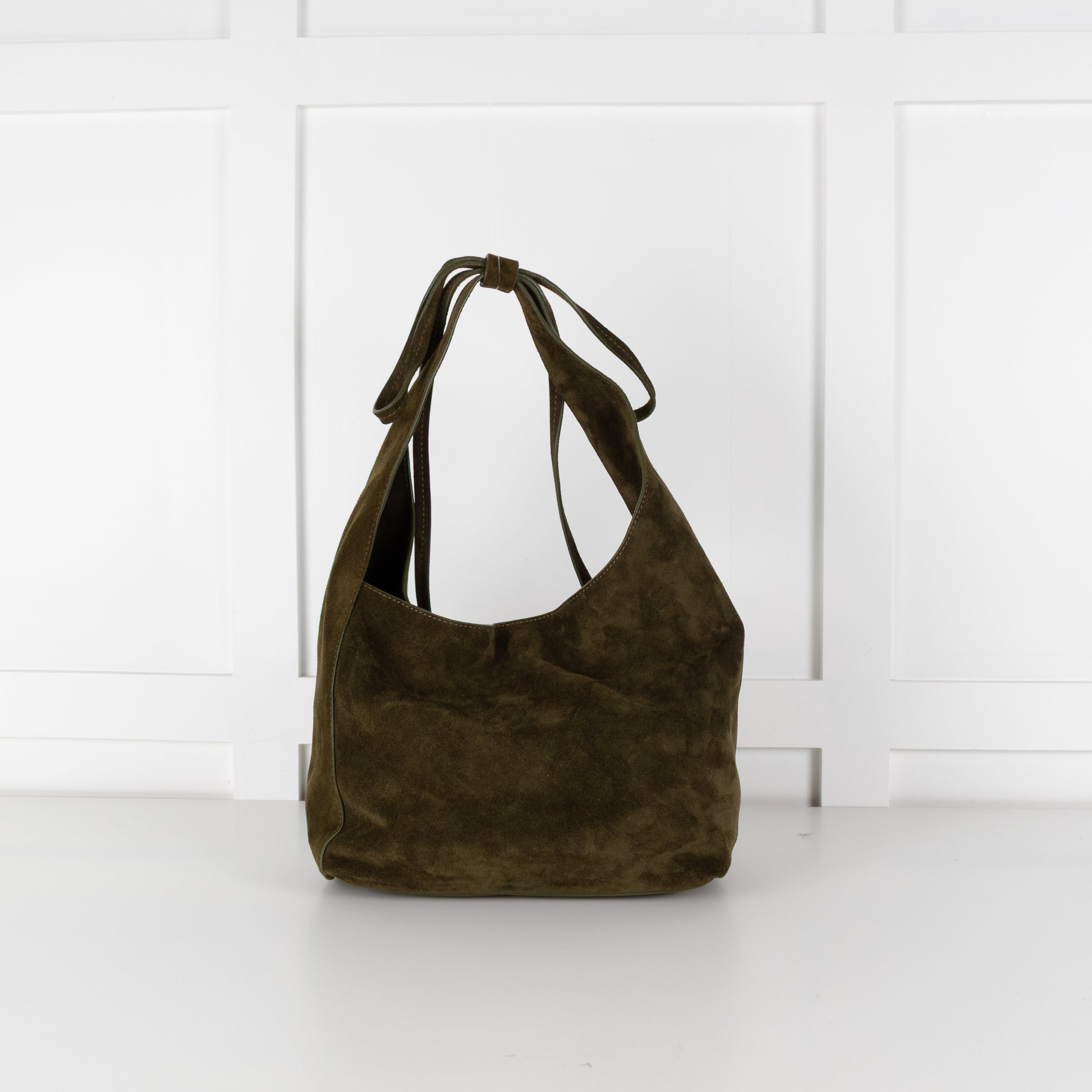 Reformation green suede Vittoria small slouch handbag with a magnetic top closure, a bow detail on the shoulder strap. Finished with embossed branding on the side.