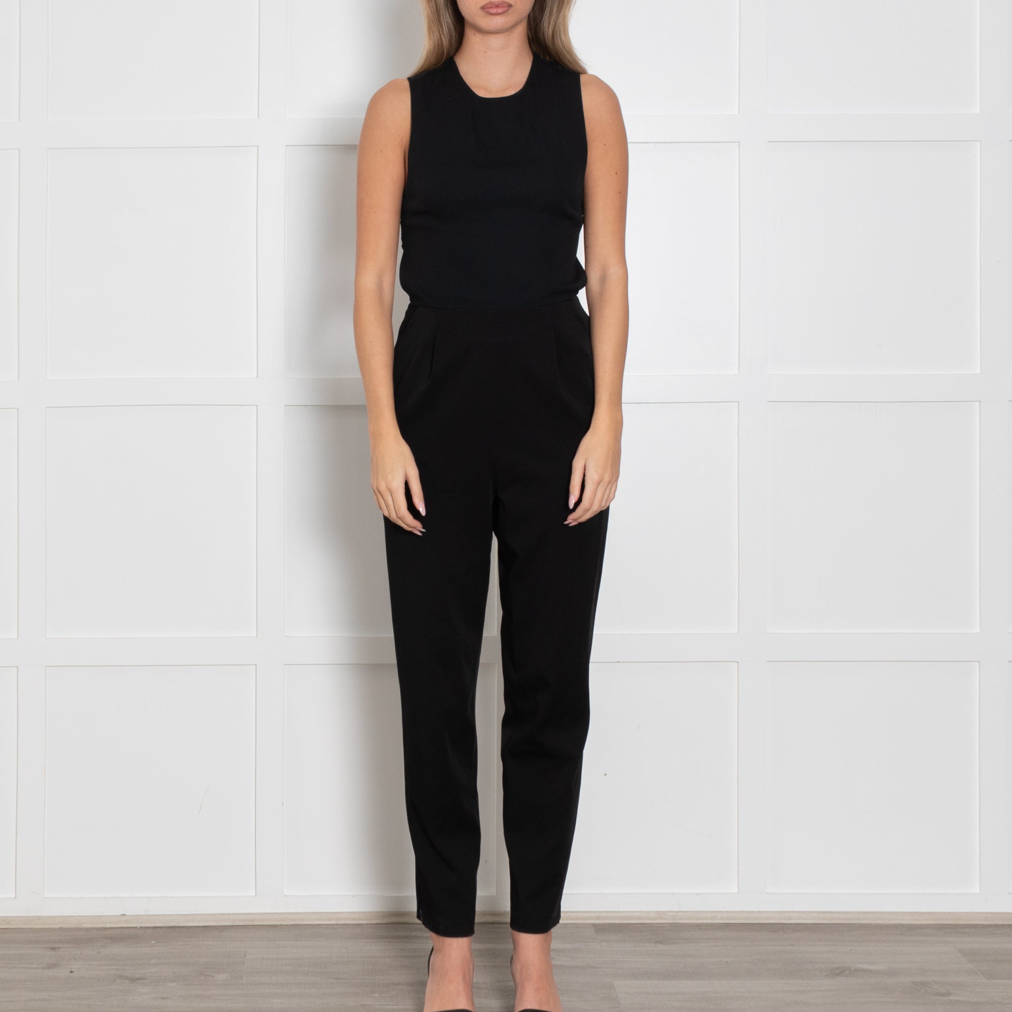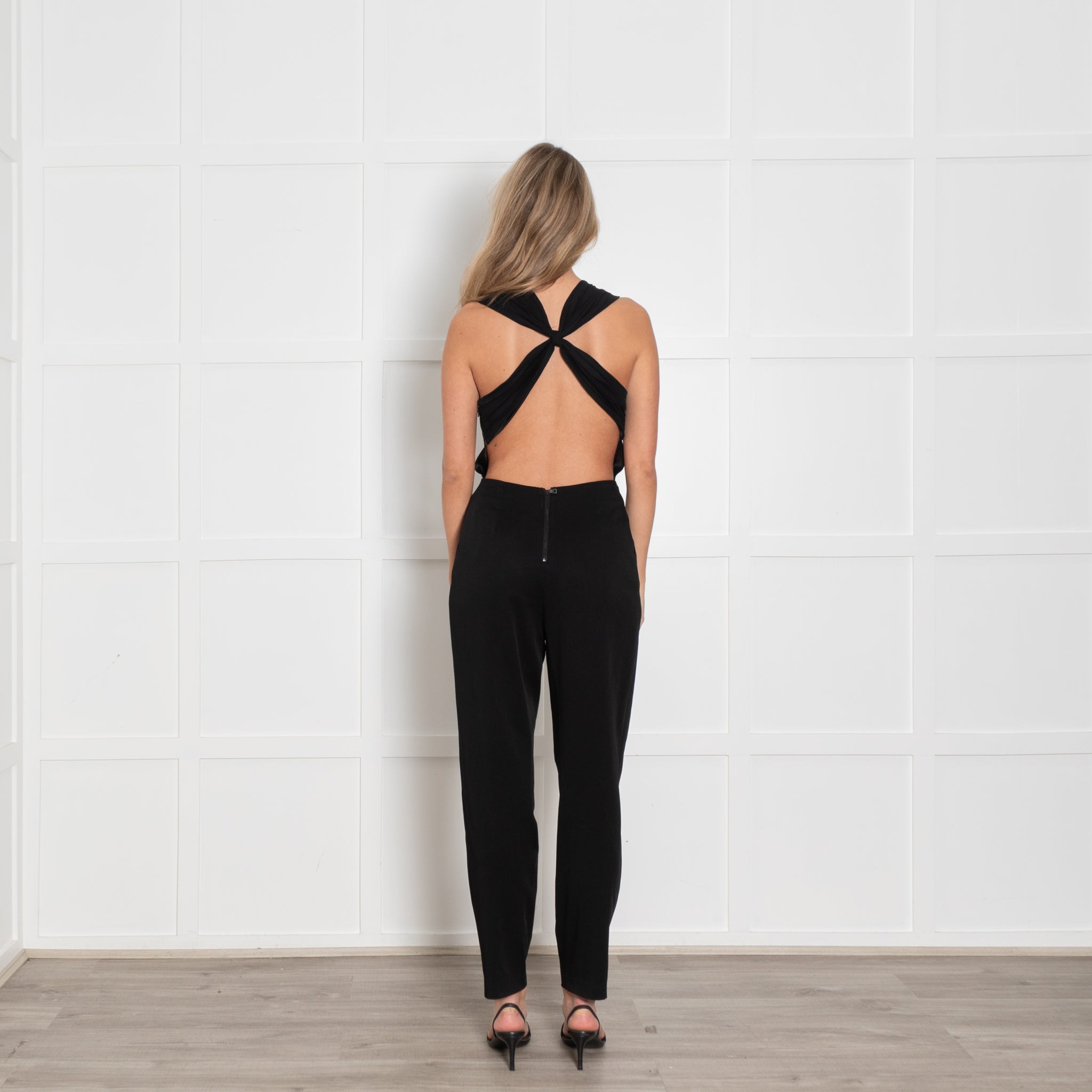 Alice + Olivia black all-in-one jumpsuit, featuring a stunning backless design, with two front pockets, a silk interior, a high, rounded neckline, and a tied-up back neck tie. The front features a minimal front hemline.