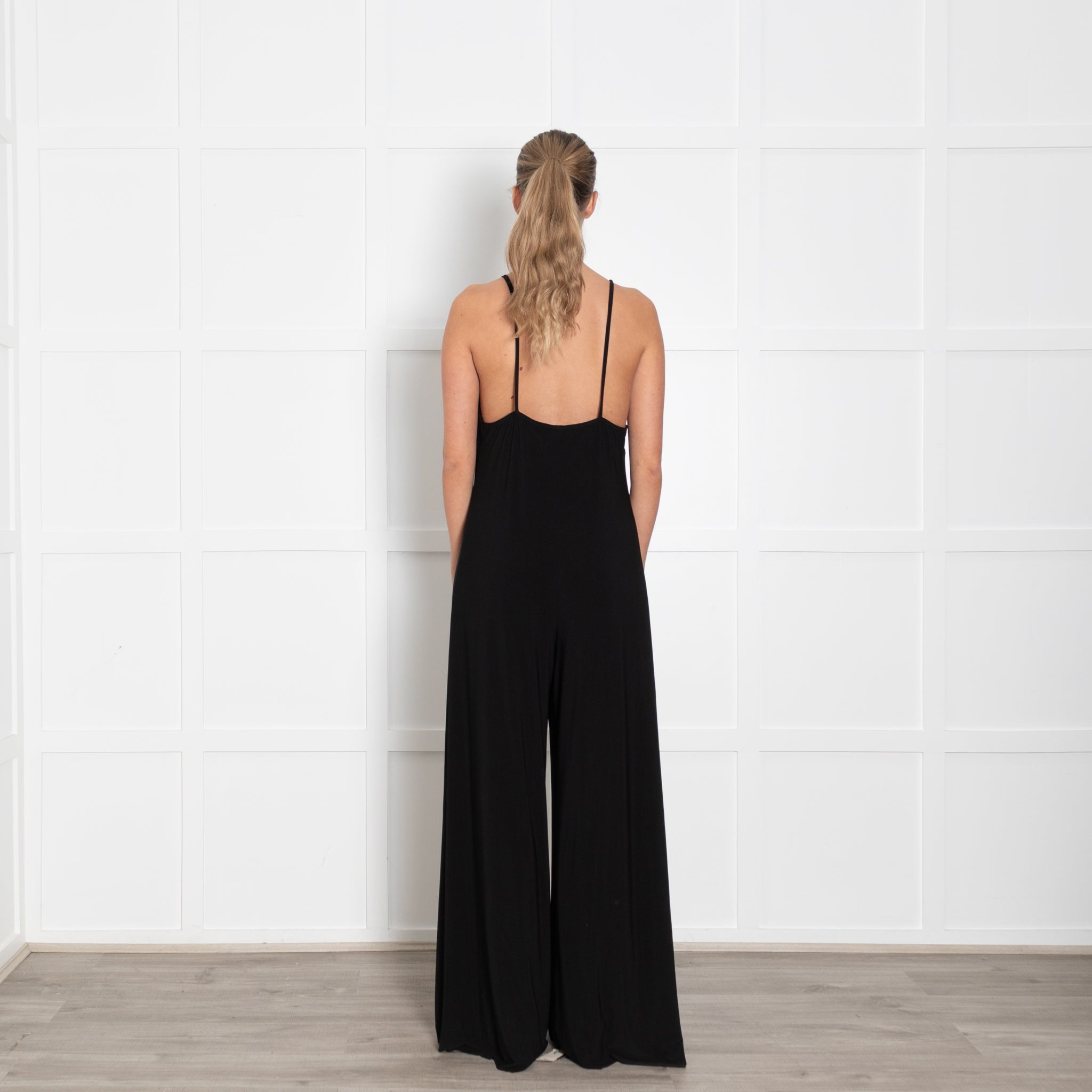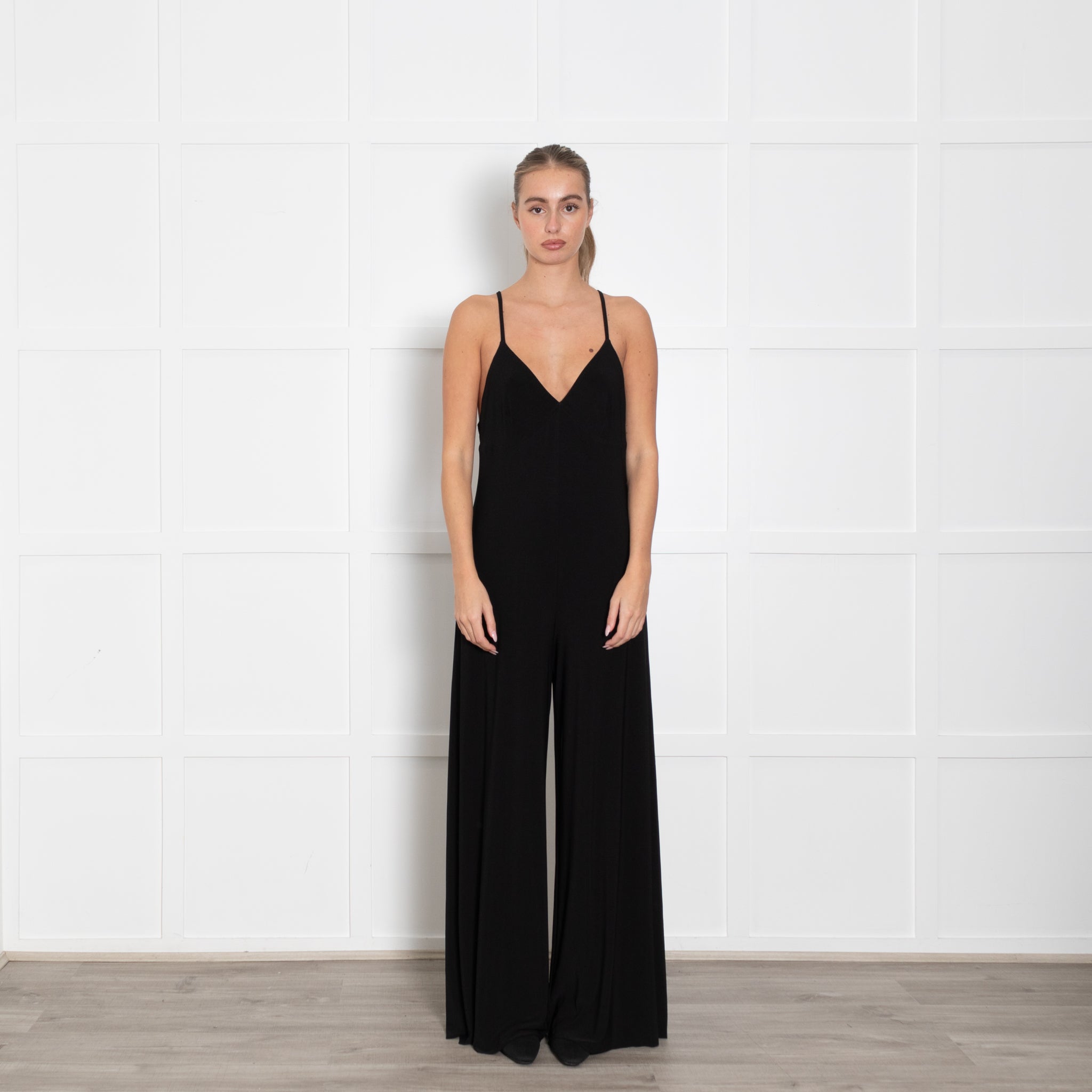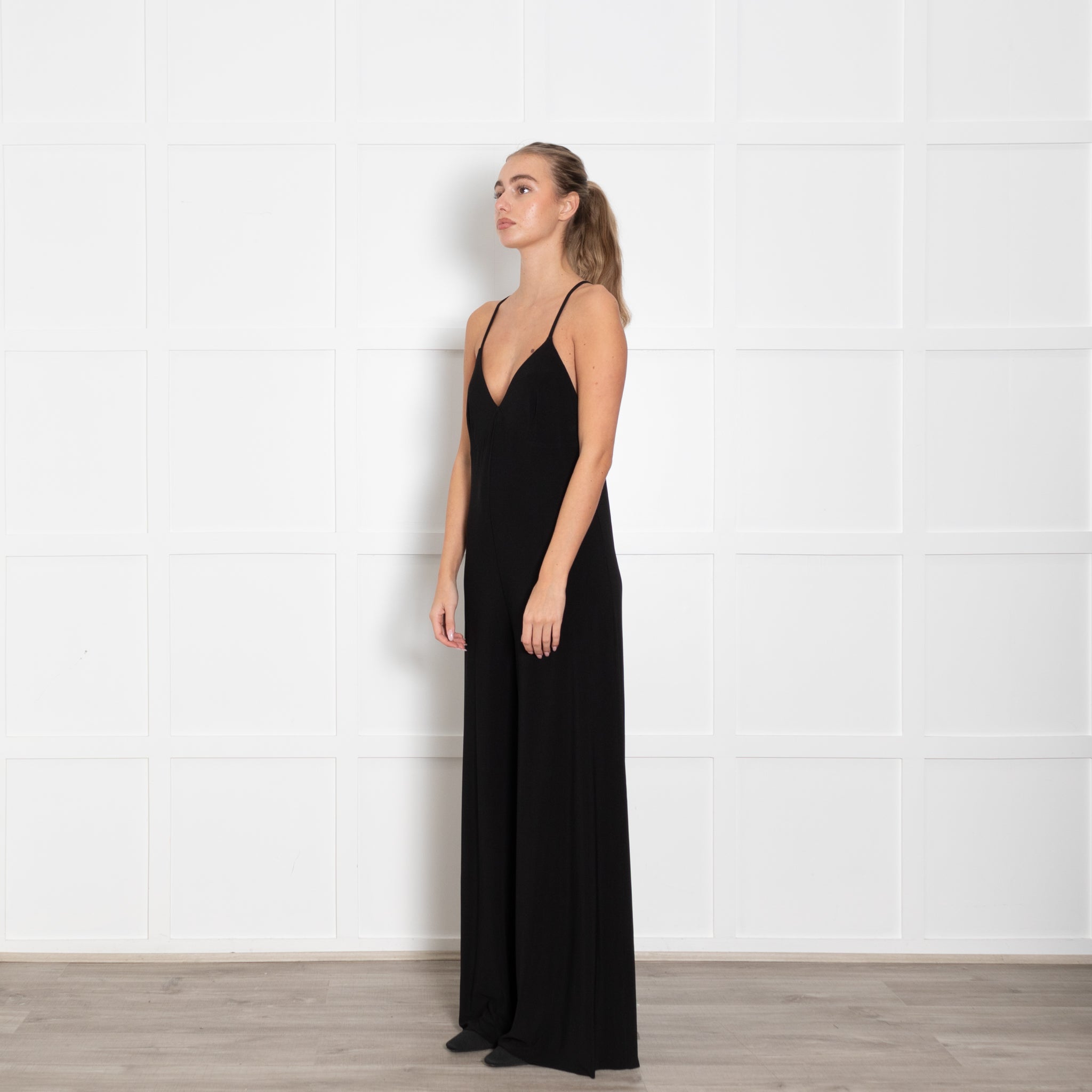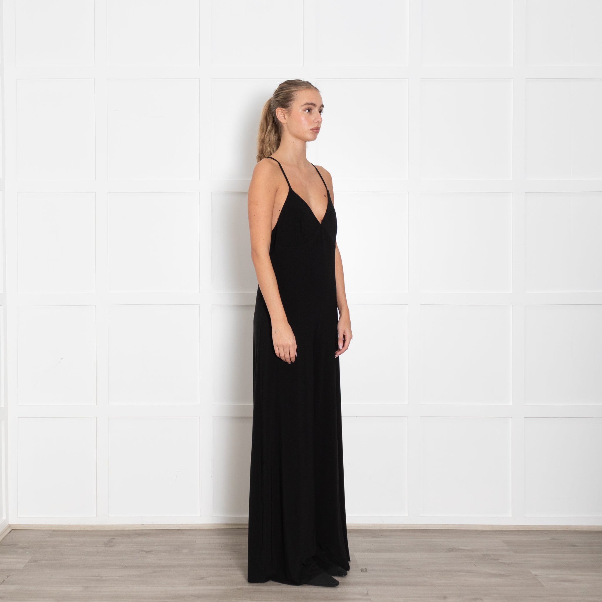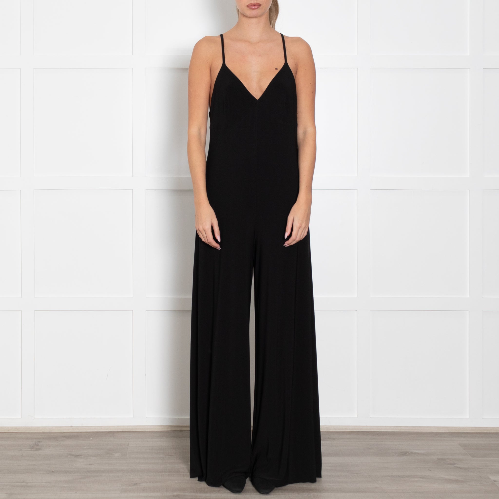 Norma Kamali black jumpsuit, featuring a stunning thin strap design, with a V-neckline.