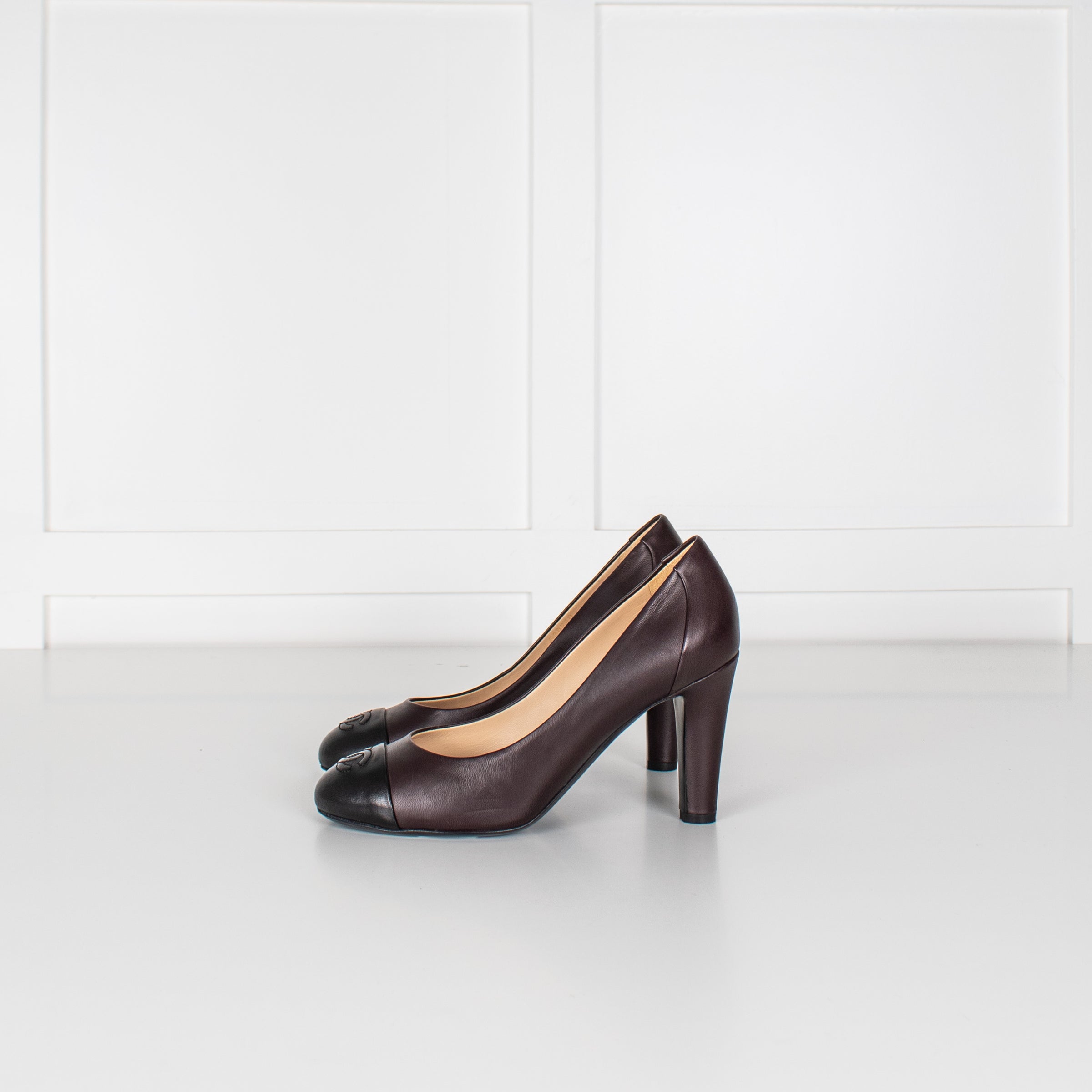 Chanel brown leather shoes, featuring a black pointed toe design, with two stitched Chanel logos, for a stunning look. Heel height approximately 11cm. Accompanied by the original box and dust bag.