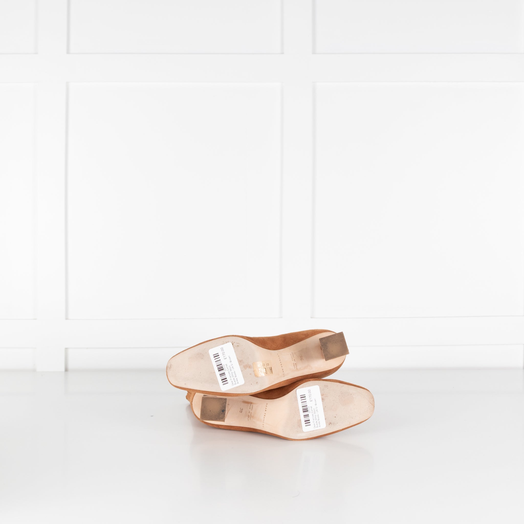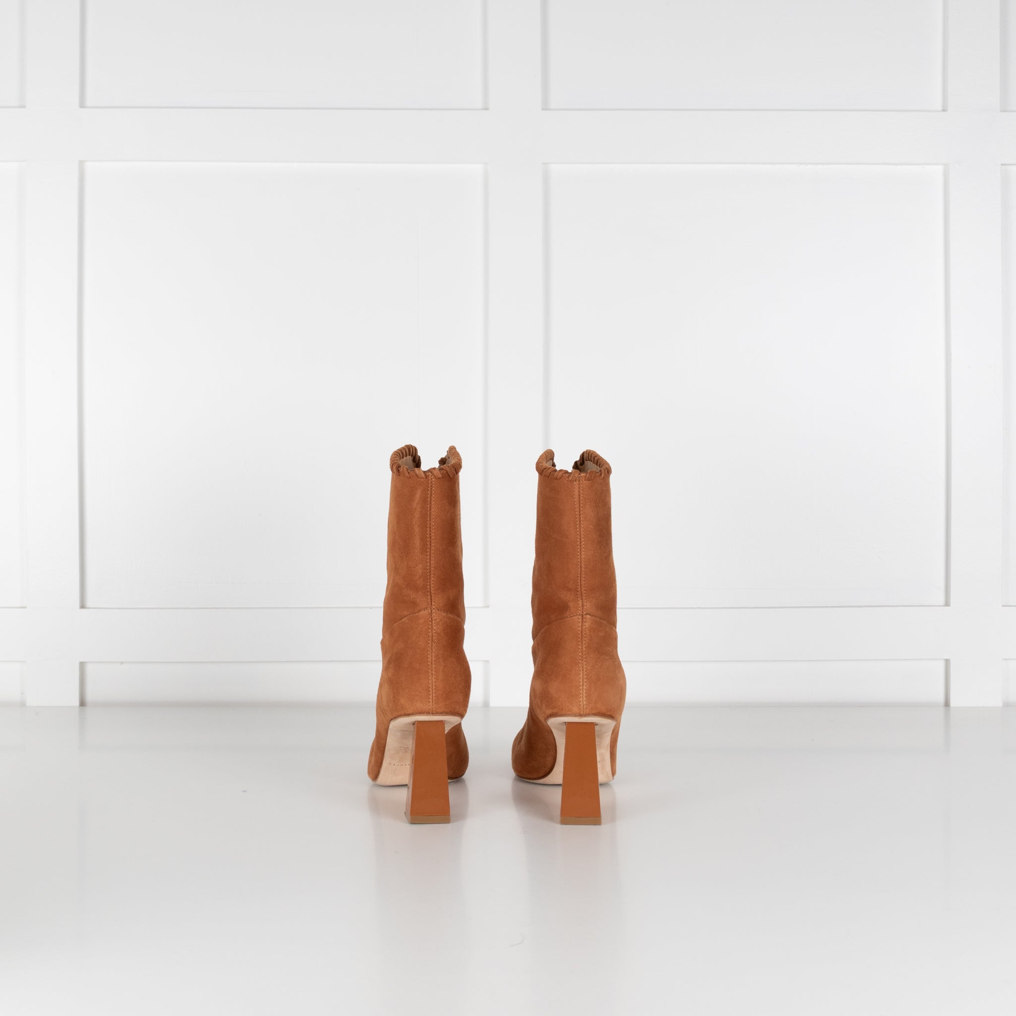 Dear Frances camel suede ankle boots with whip-stitch to the top of the boots, featuring a v-slit. 9cm heel.