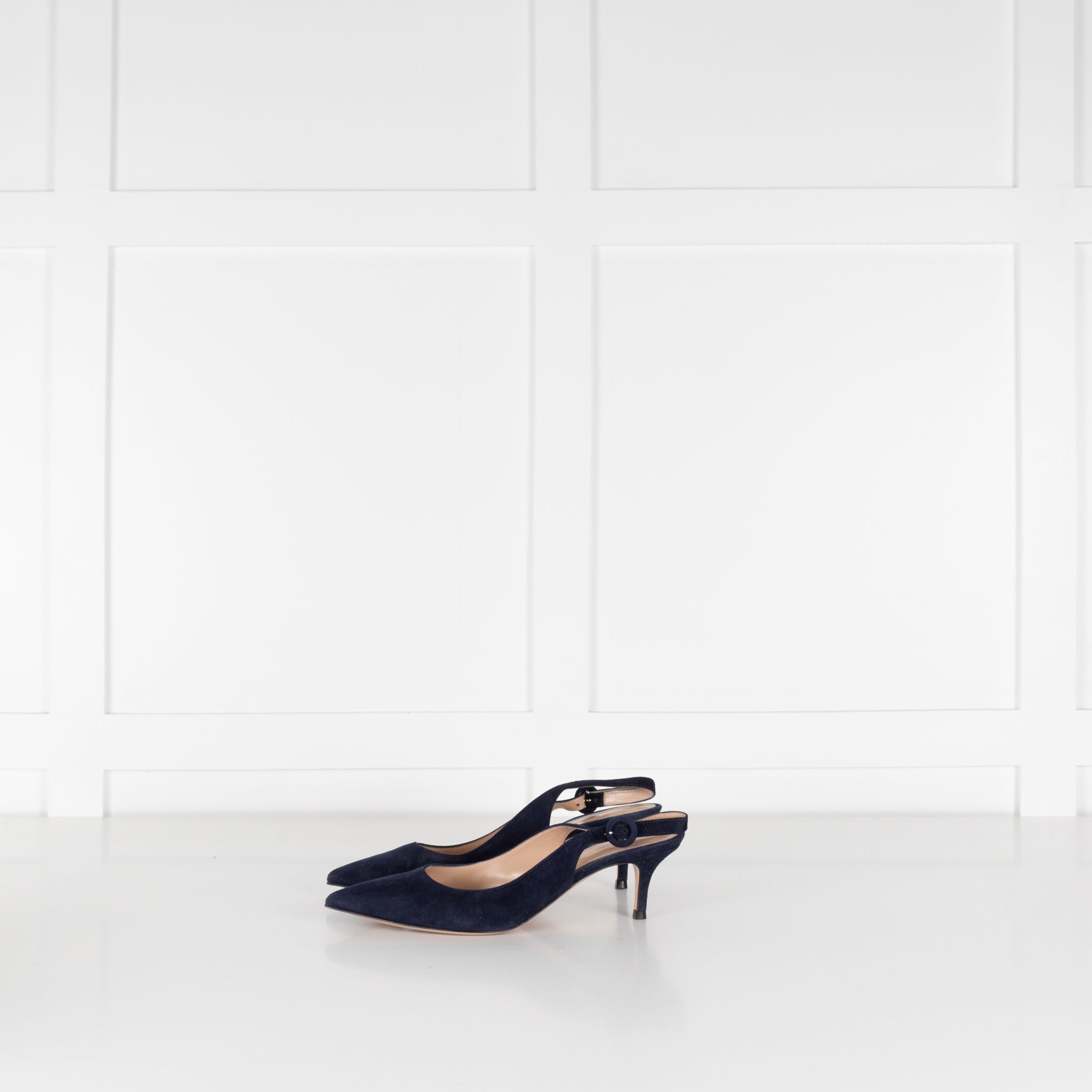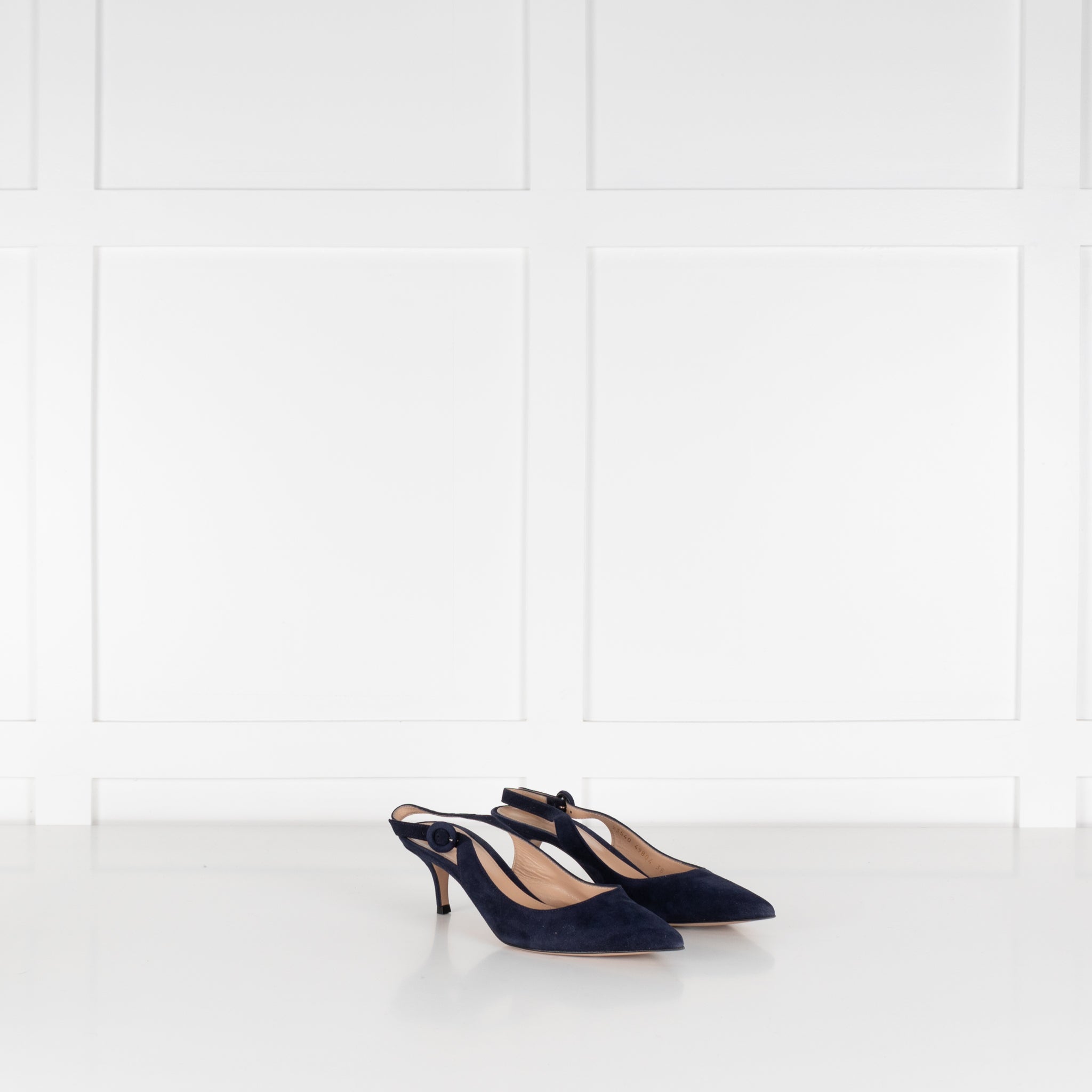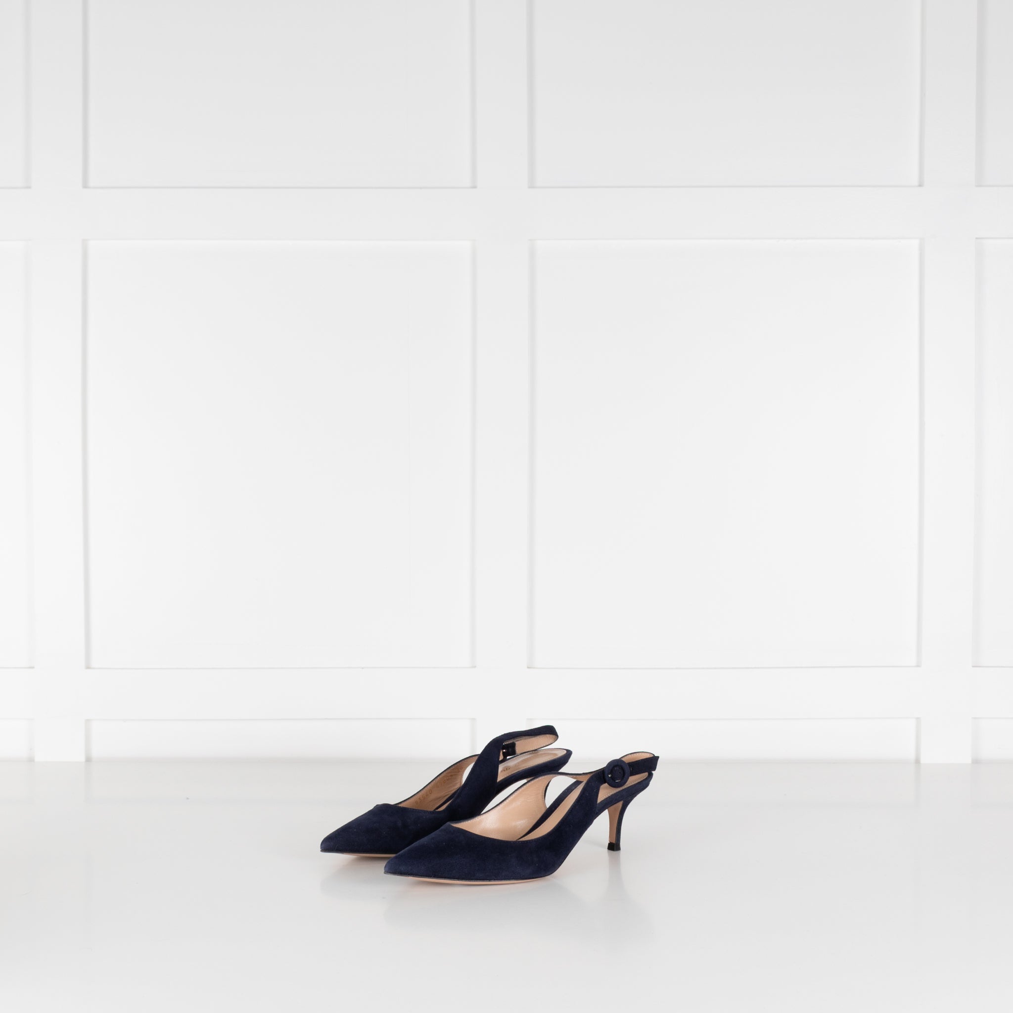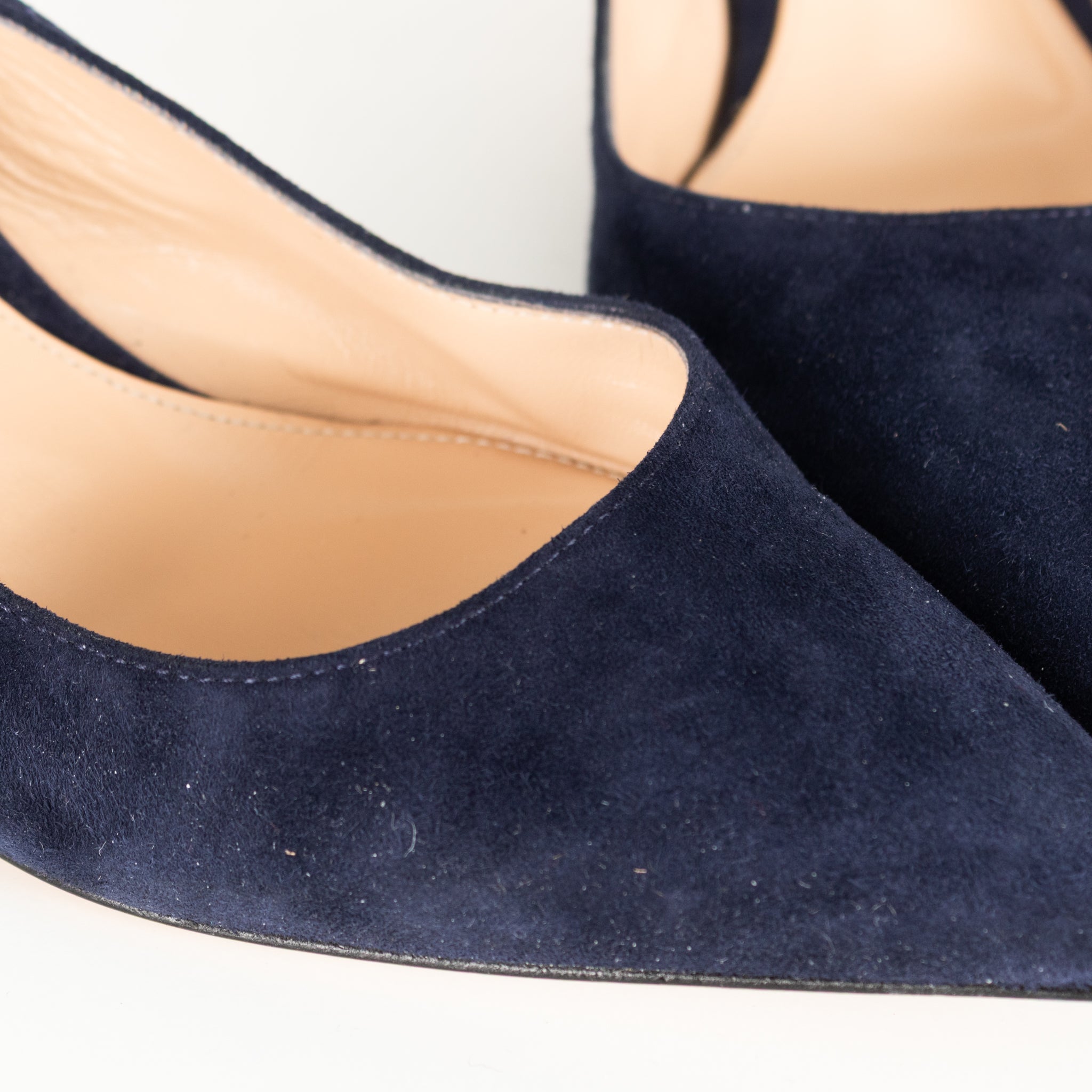 Gianvito Rossi Anna slingbacks in navy blue suede. The elegant shoes feature a pointy toe and adjustable heel strap with a heel height of 5cm. Accompanied by original box and dust bag.