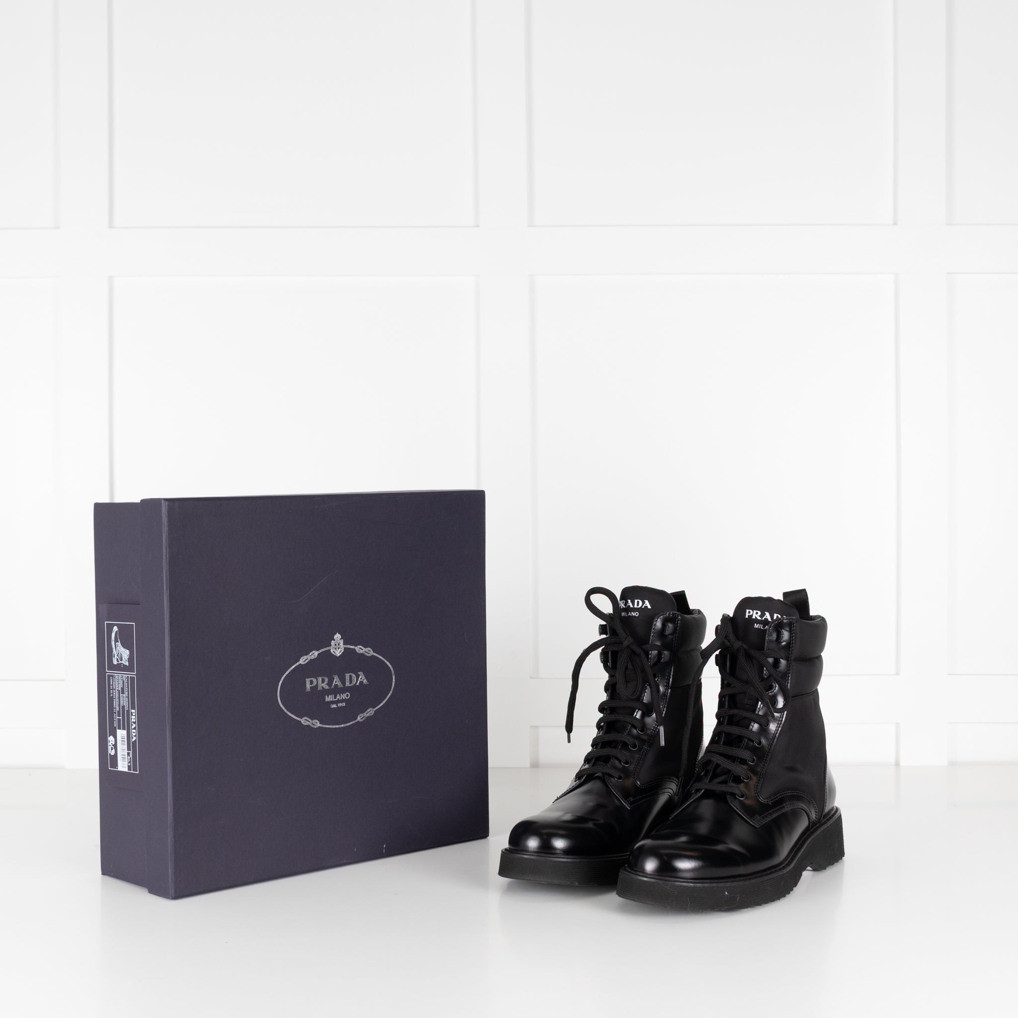 Prada Black Monolith combat boots. These versatile boots are nylon and leather with the Prada logo on the tongue. Accompanied by original box.