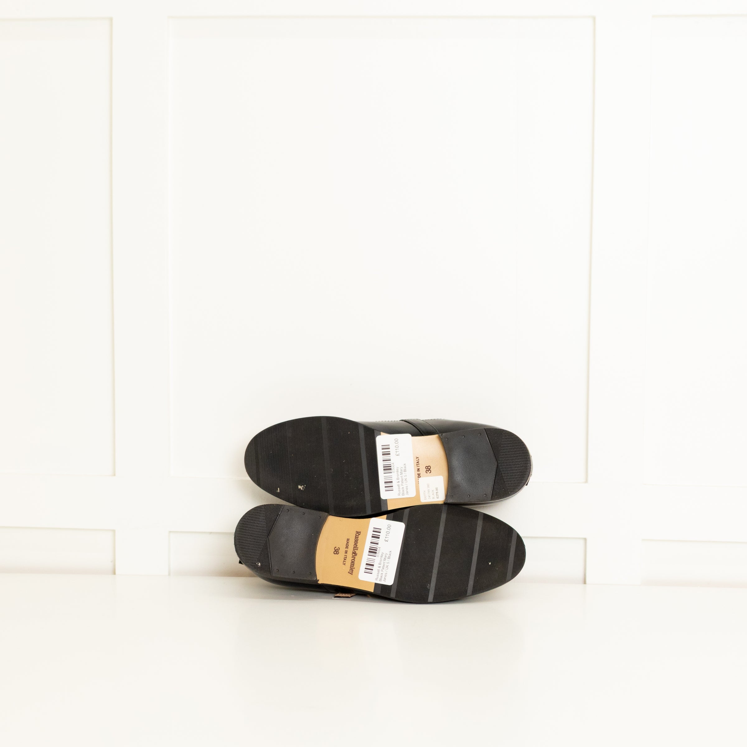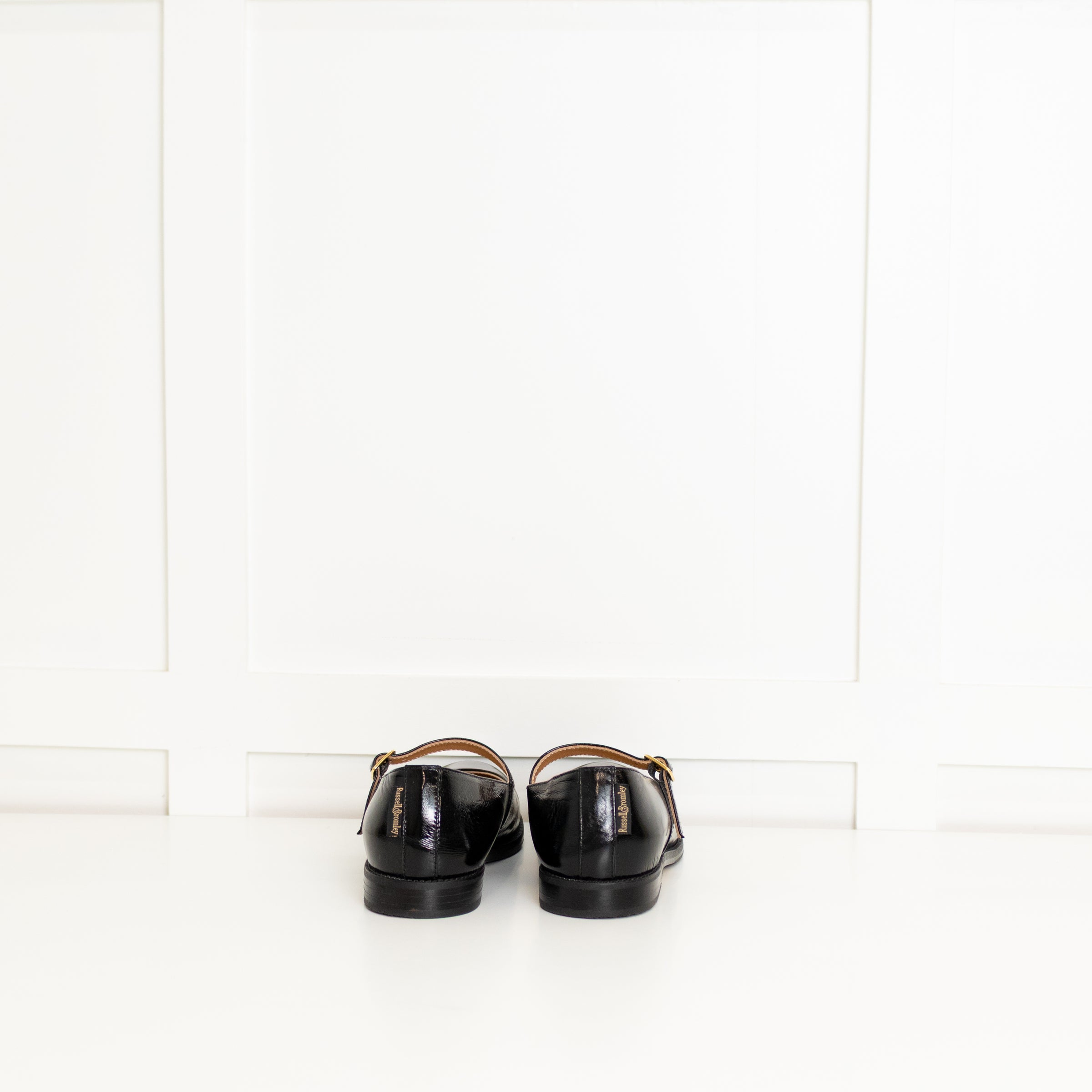 Russell & Bromley black shiny patent leather Mary Janes with a rounded toe and buckled strap across the foot. New with tags, with original box. RRP £275.