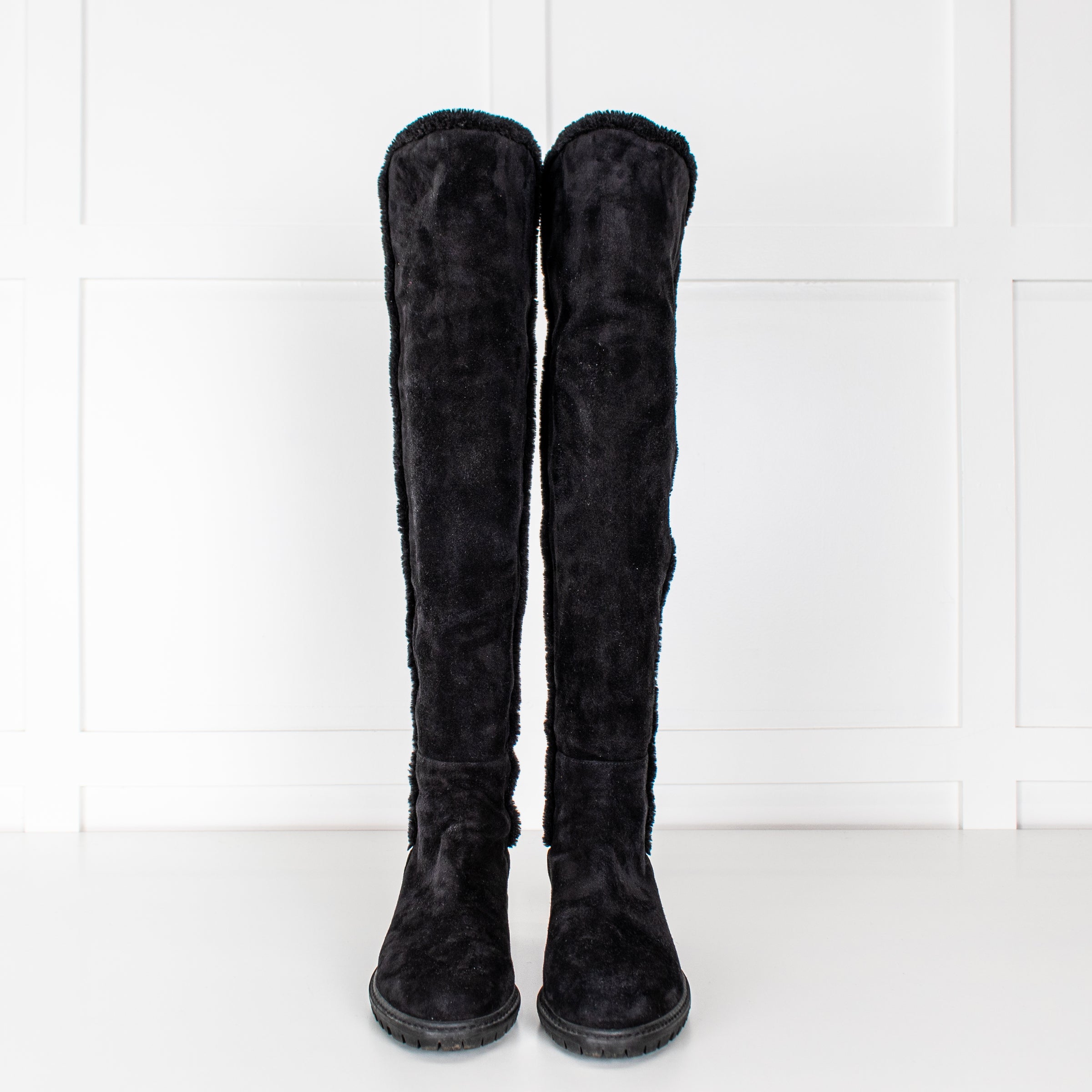 Stuart Weitzman black suede boots, featuring a knee-high design with a rounded toe and beautiful intrecut hemlines.