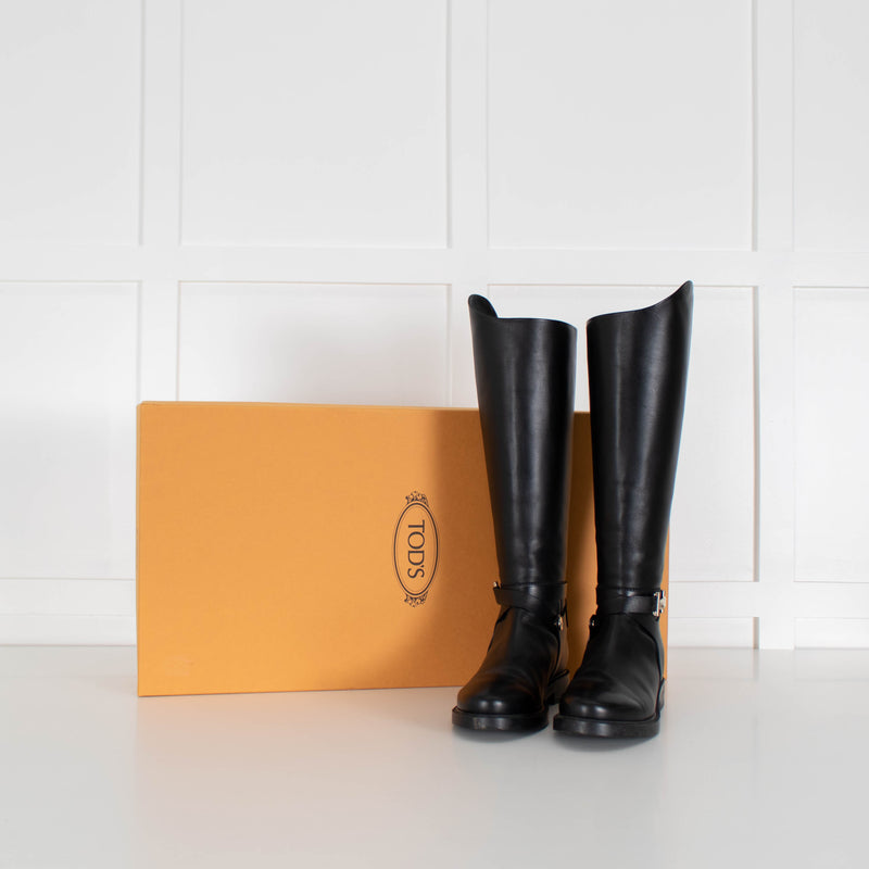 Tods Black Leather Riding-Style Double T-Buckle Strap Knee-High Boots