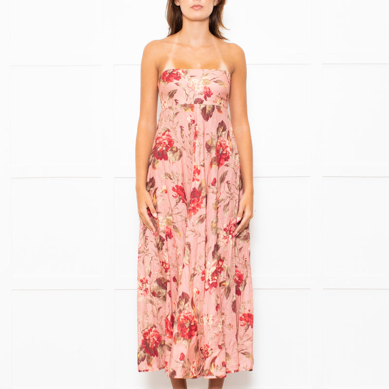 Zimmermann Peach Floral Linen Strapless Maxi Dress