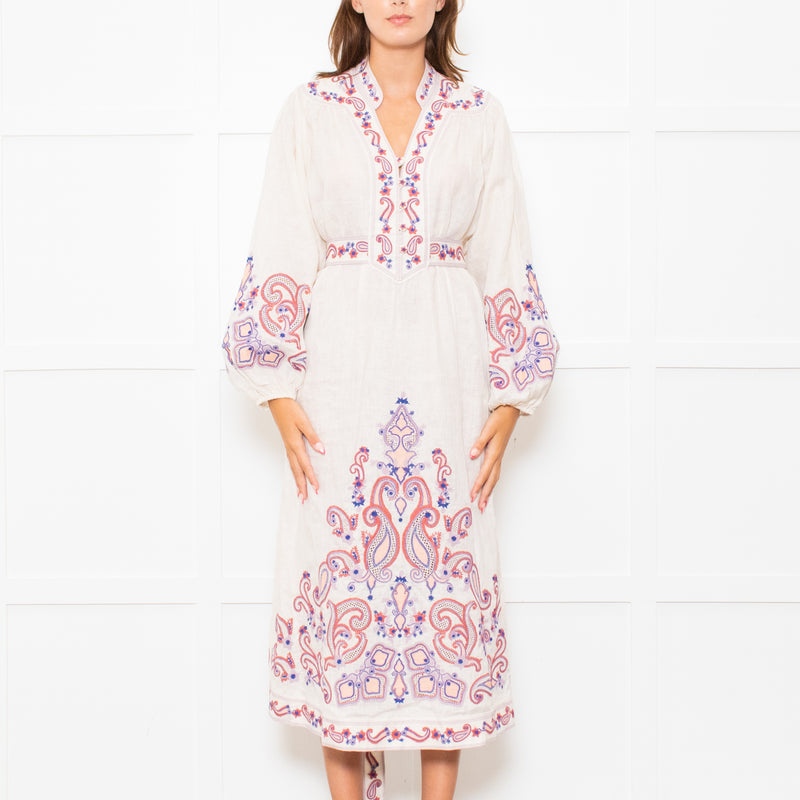 Zimmermann Cream Linen Rust Coral Blue Paisley Embroidered Trim Maxi Dress