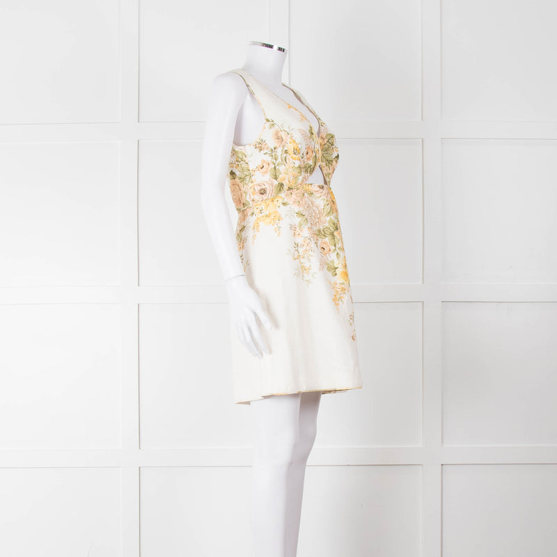 Zimmermann Floral Linen Mini Dress with Mustard and Pink Flowers