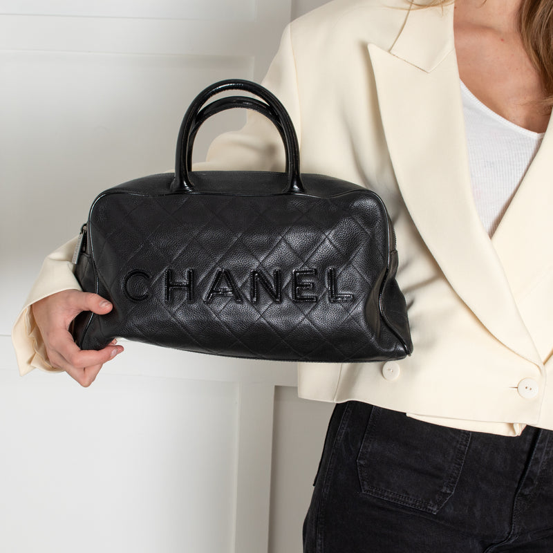 Chanel Quilted Black Caviar Logo Bowler Bag