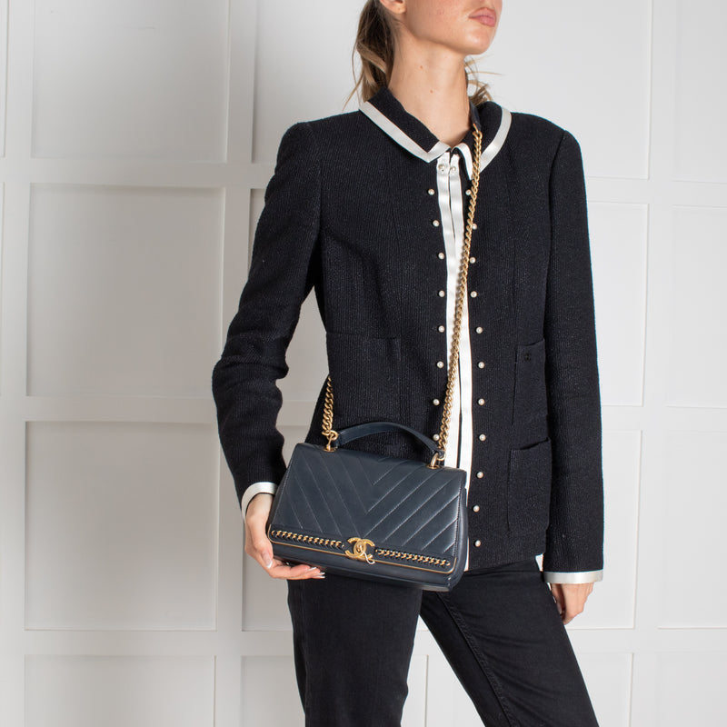 Chanel Navy Lambskin Chevron Top Handle Flap Bag