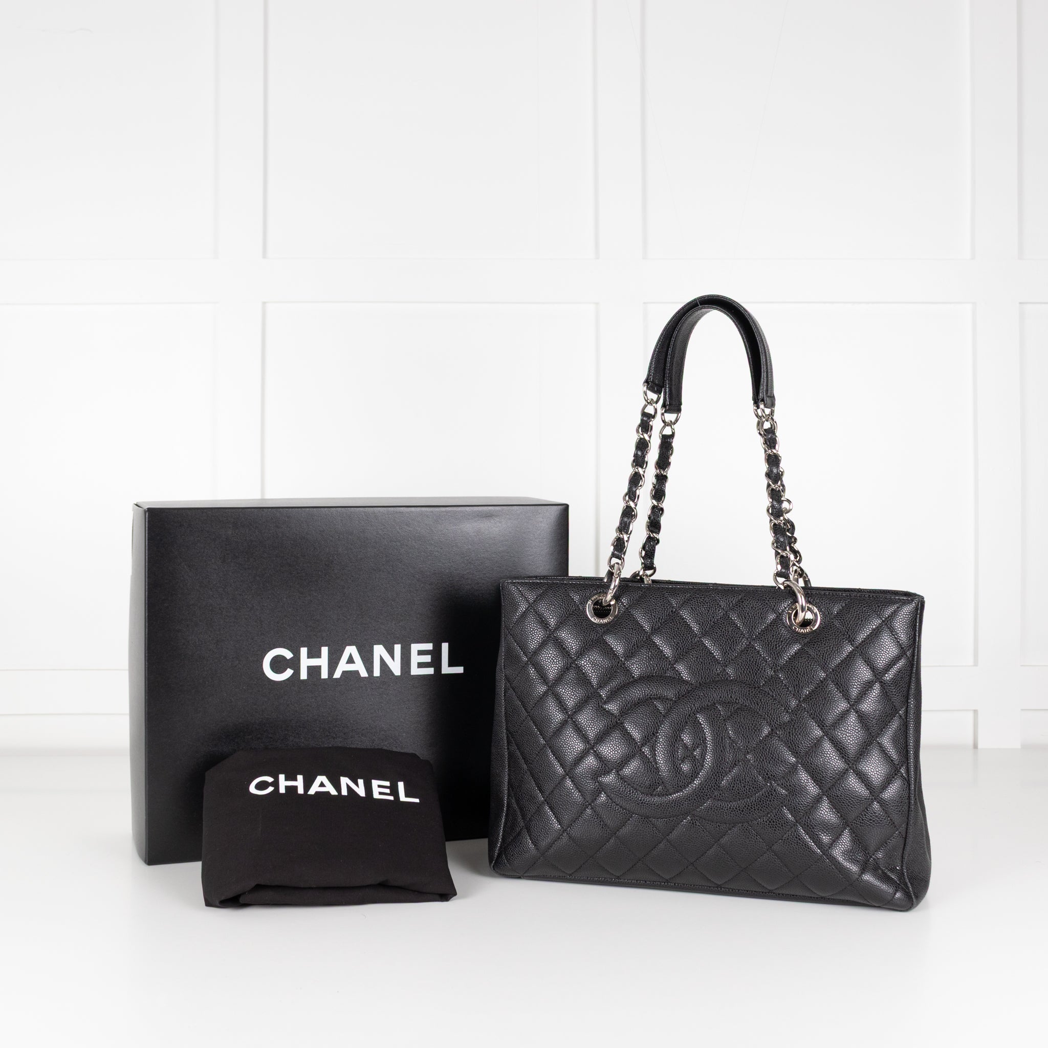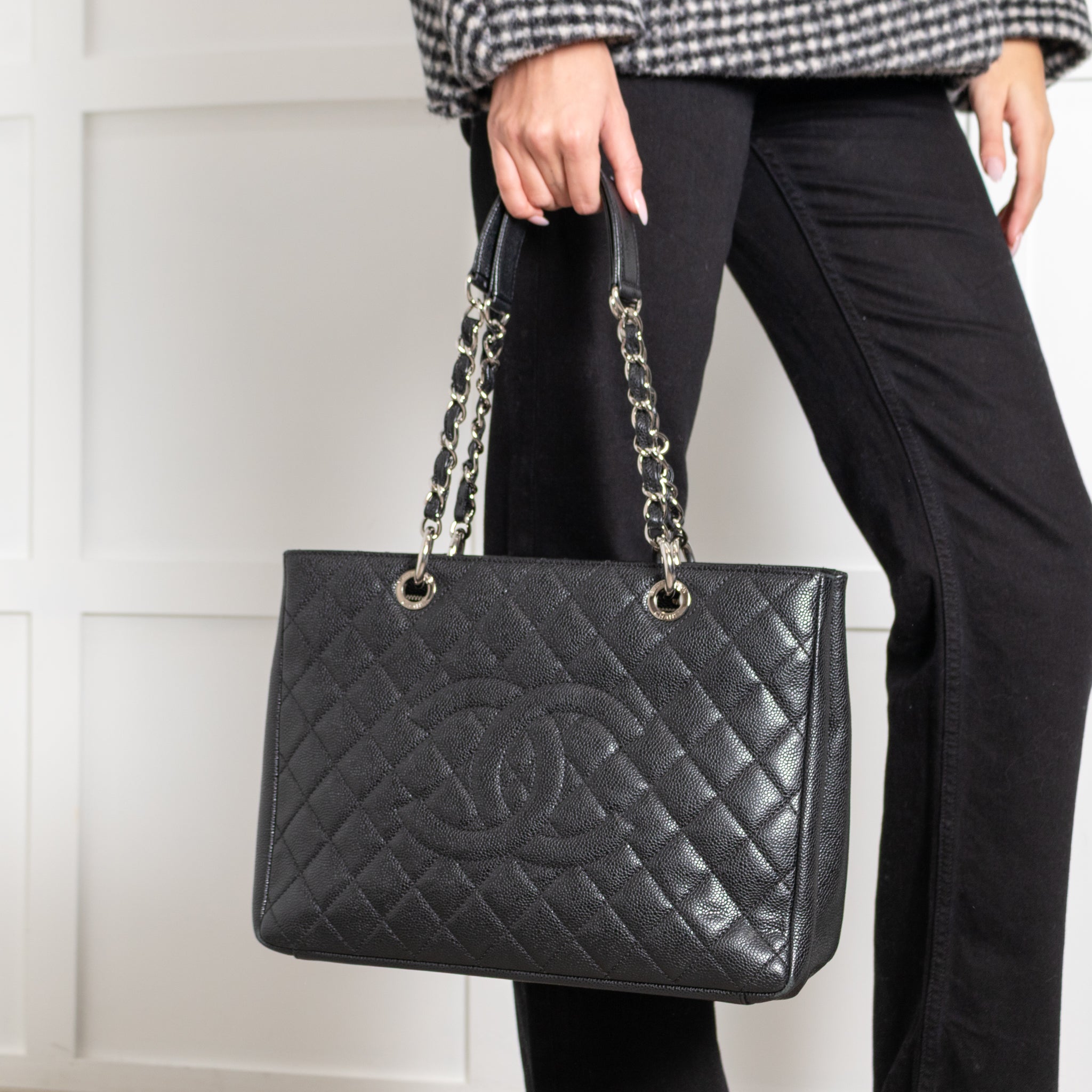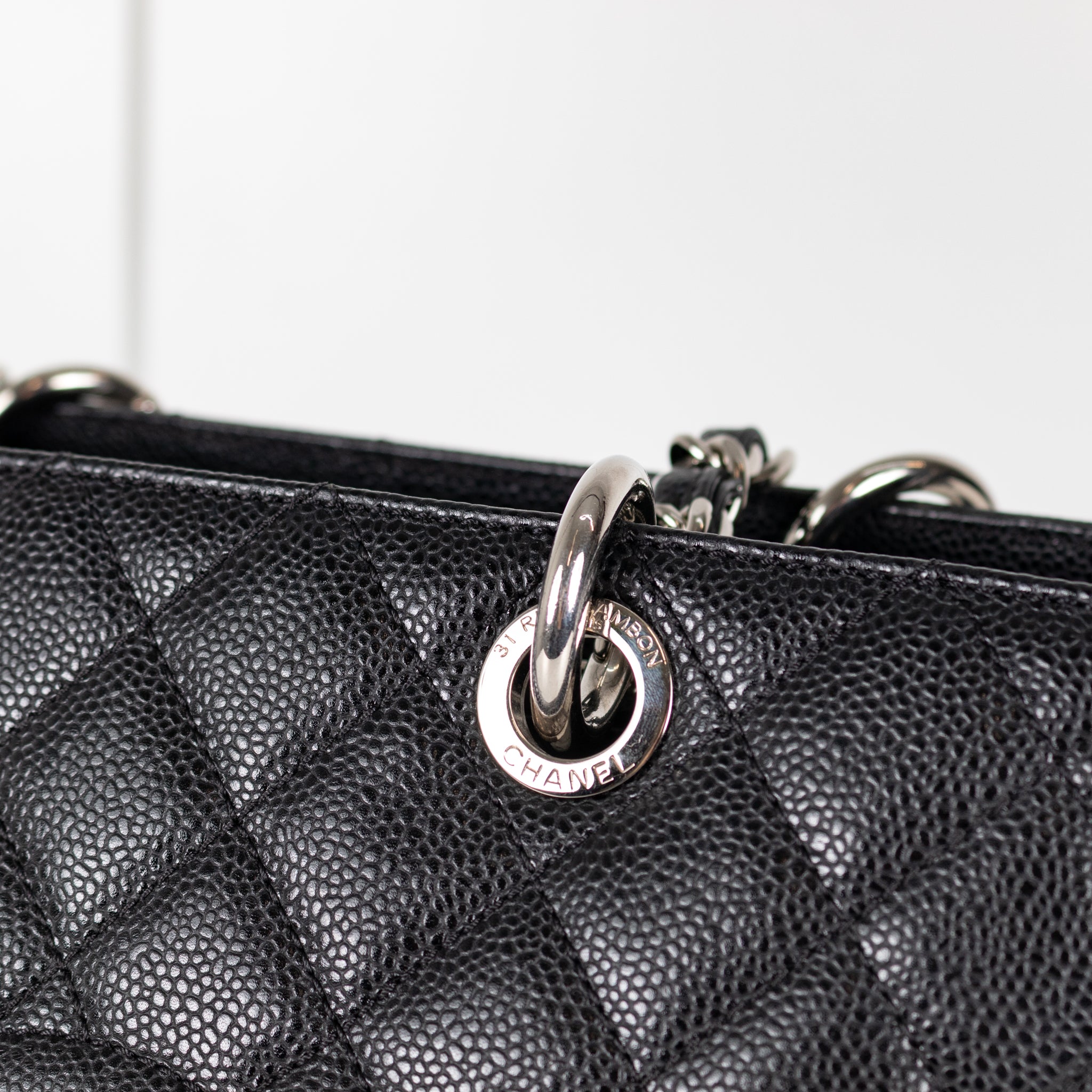 Chanel (2010-2011) grand shopping tote in black caviar leather, showcasing the iconic interlocking ‘CC’ logo stitched into the front. Crafted from signature caviar calfskin leather, this timeless tote is finished with silver hardware including, half leather and chain straps, and a dual-compartment interior separated by a central zipped pocket. A sought-after staple for any Chanel lover, this GST also comes with the original authenticity card, dust bag, and box, making it a full set.