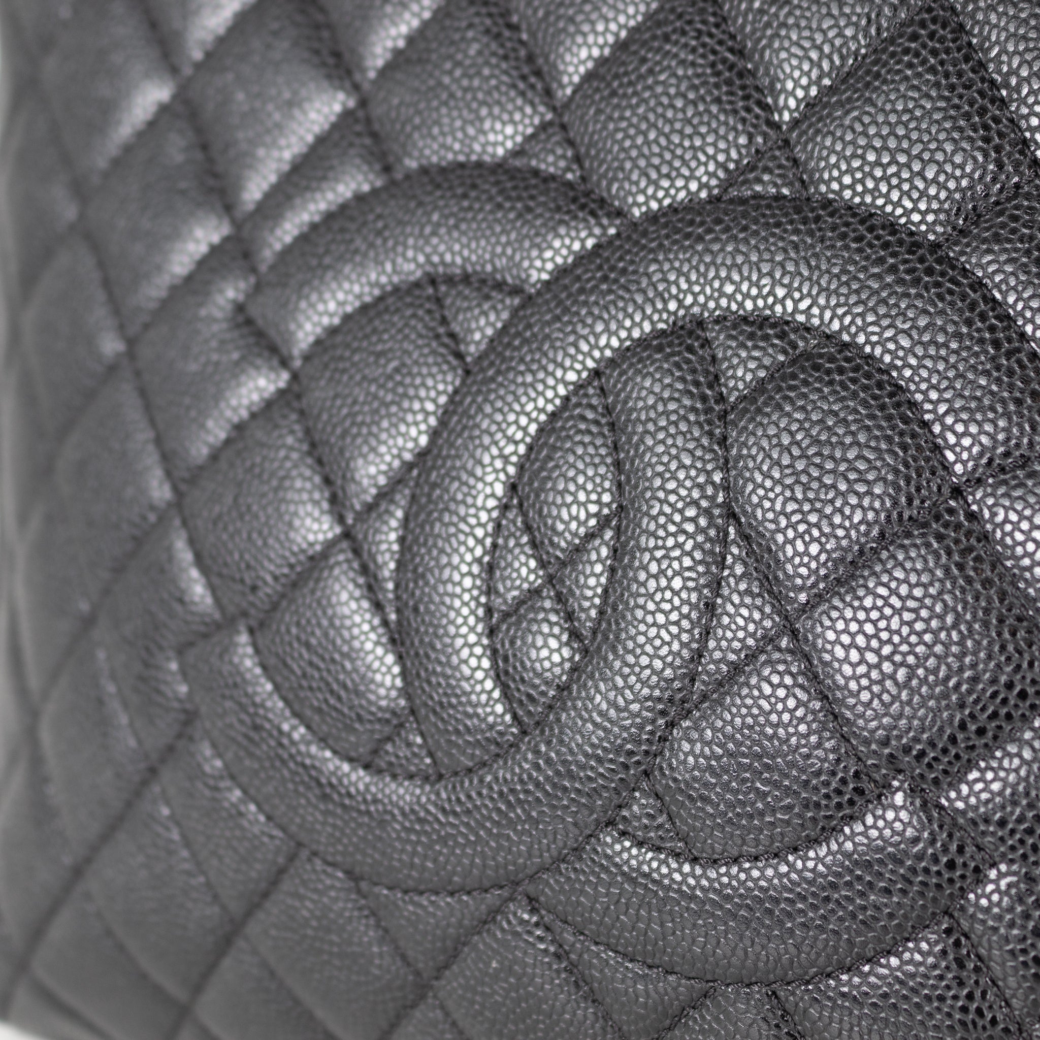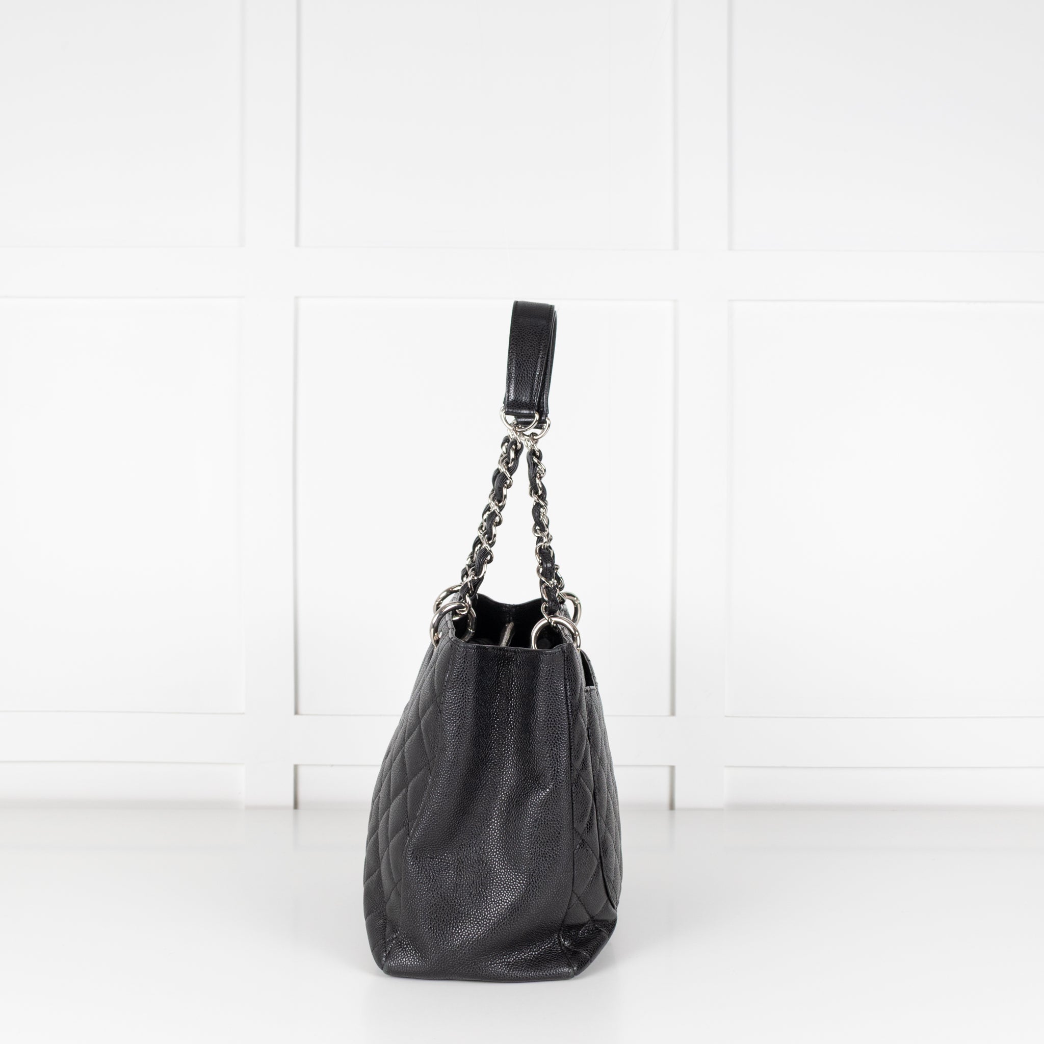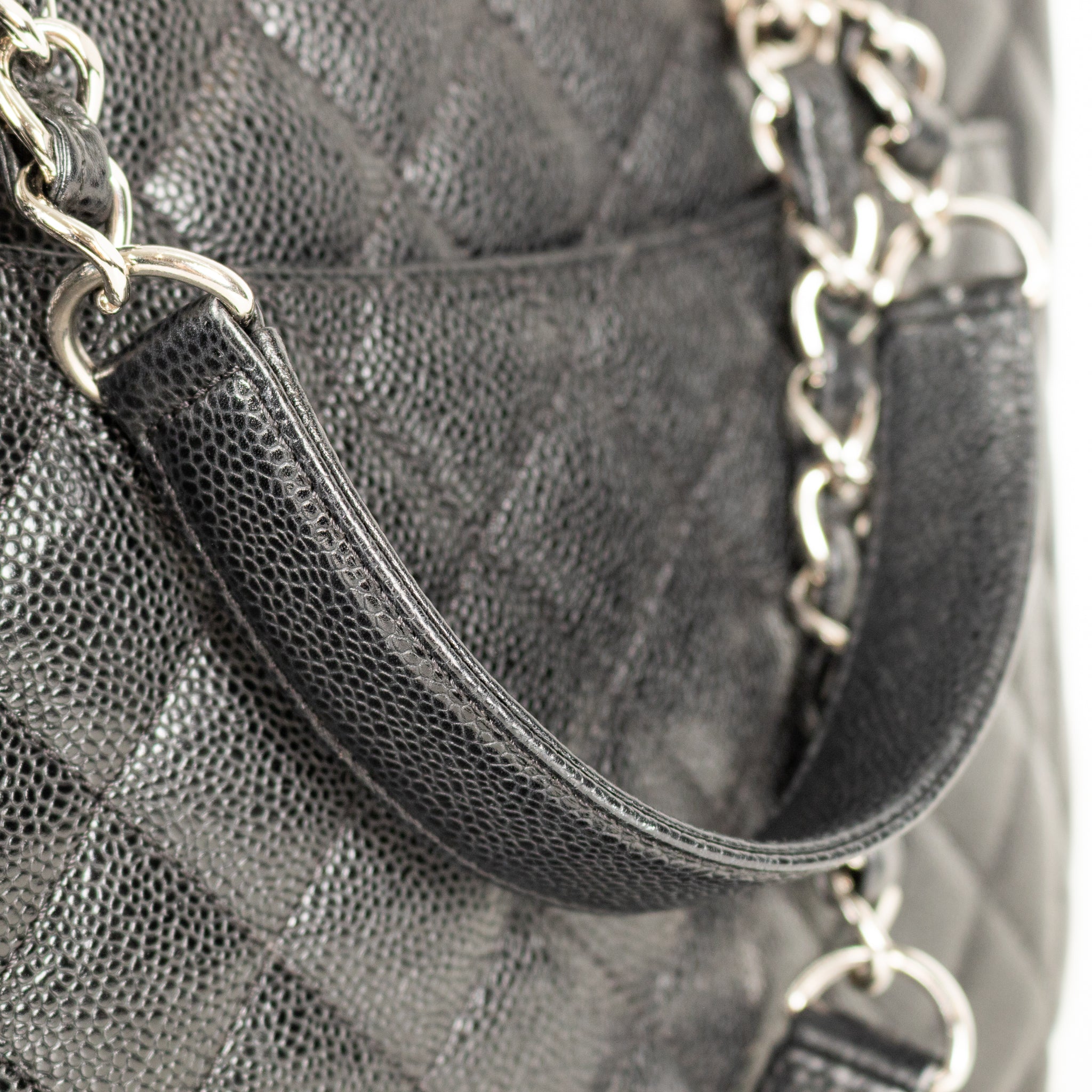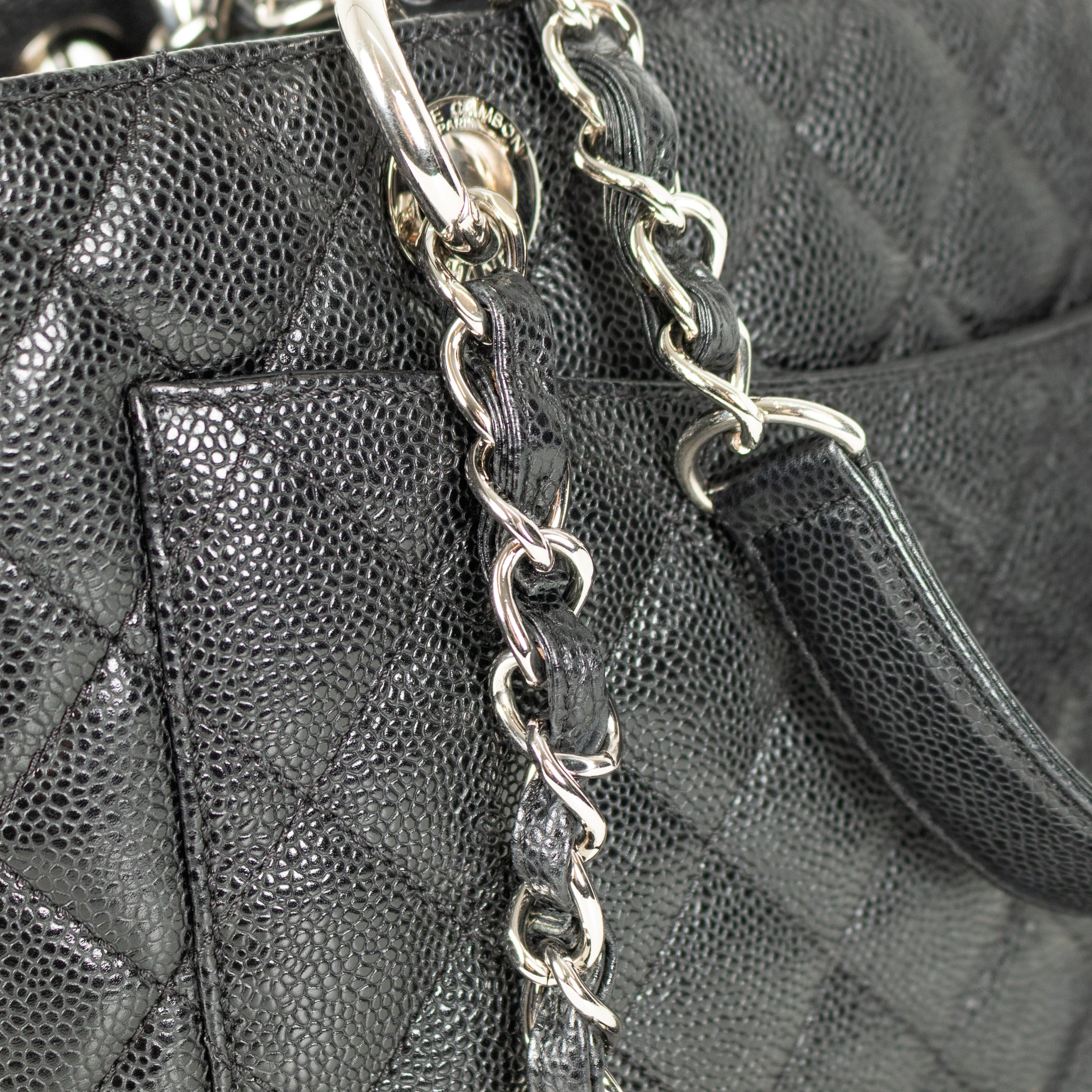 Chanel (2010-2011) grand shopping tote in black caviar leather, showcasing the iconic interlocking ‘CC’ logo stitched into the front. Crafted from signature caviar calfskin leather, this timeless tote is finished with silver hardware including, half leather and chain straps, and a dual-compartment interior separated by a central zipped pocket. A sought-after staple for any Chanel lover, this GST also comes with the original authenticity card, dust bag, and box, making it a full set.