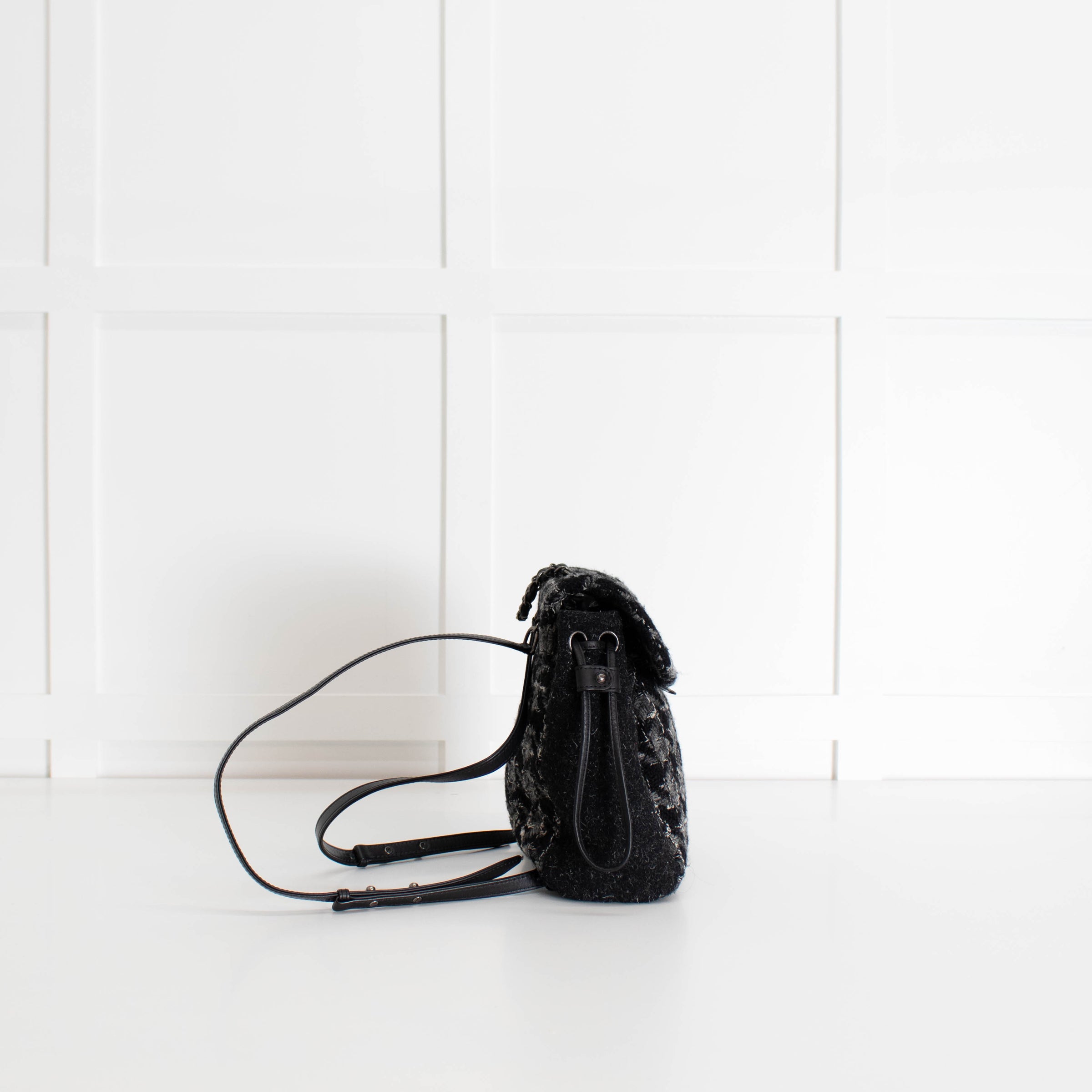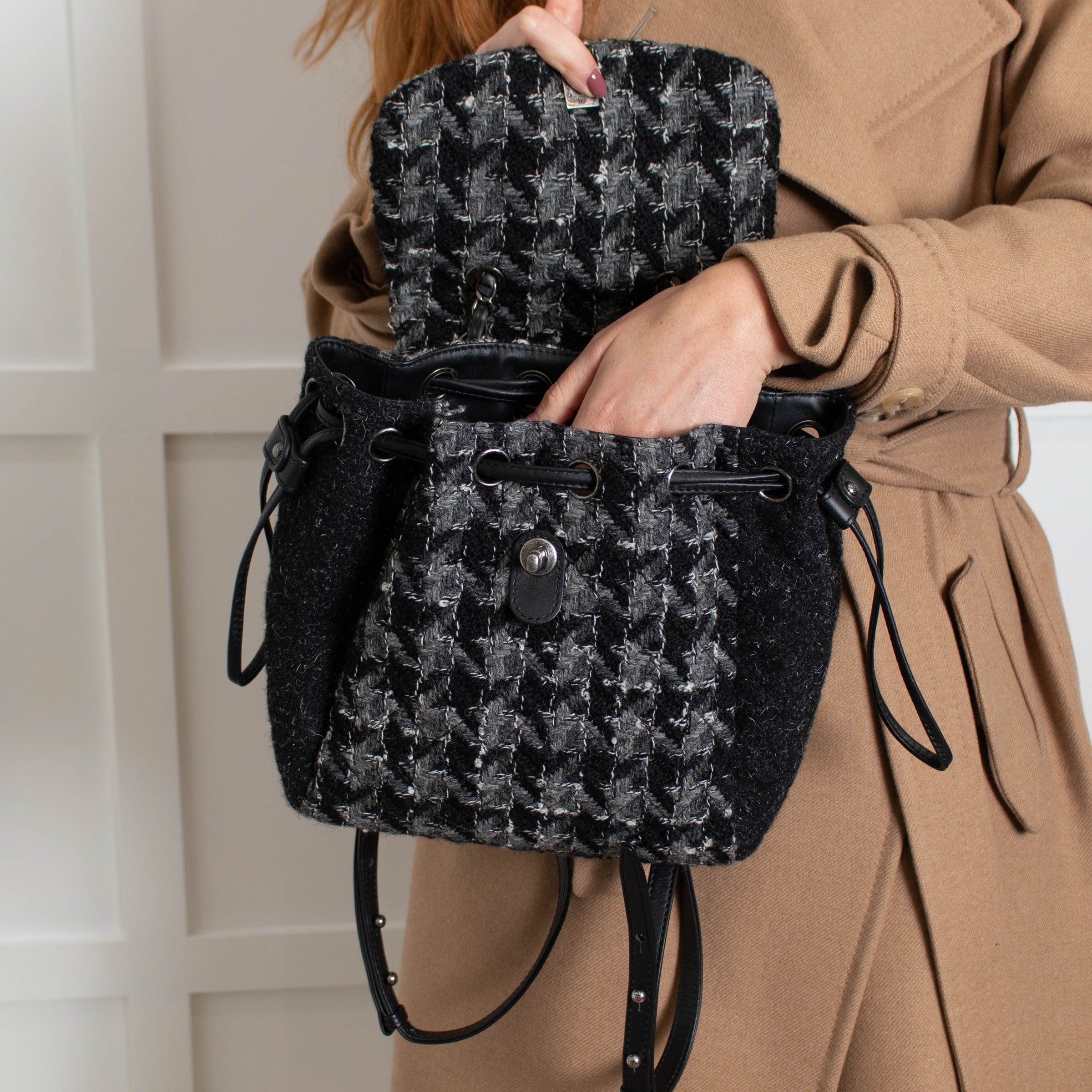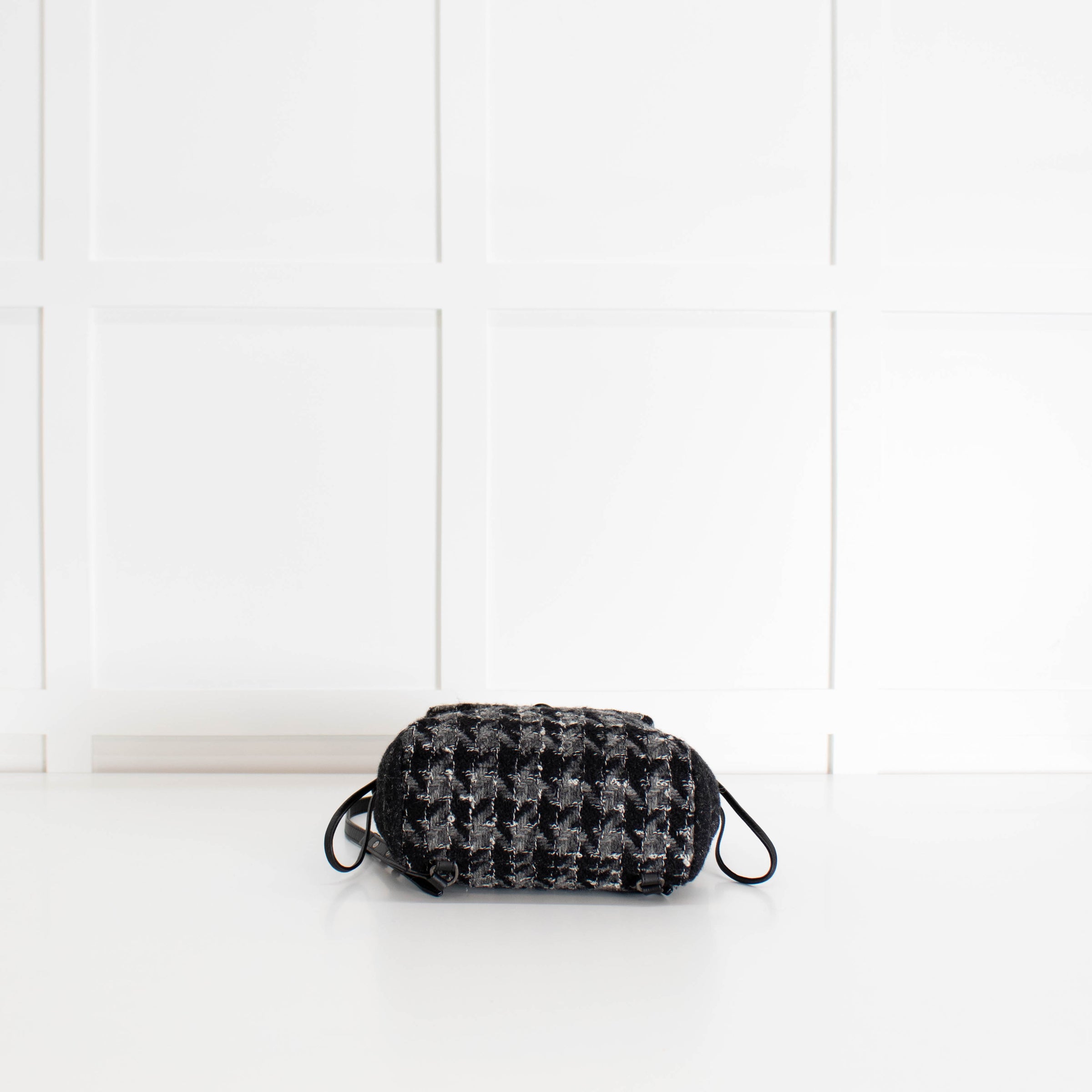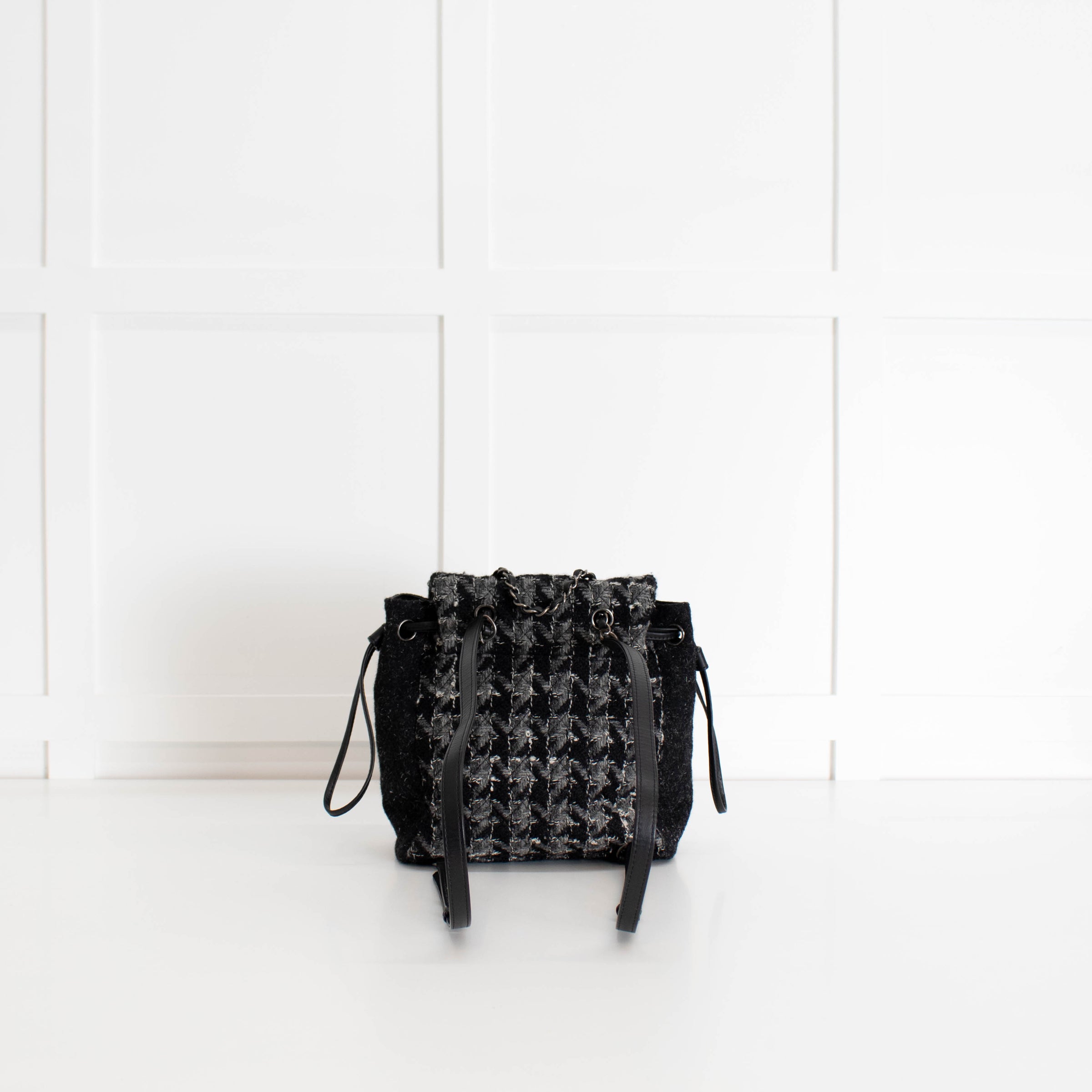 Chanel (2017) grey tweed wool coco backpack with leather trims. Finished with a small front flap, aged silver-tone hardware, an interlocking CC logo twist lock clasp, a leather drawstring closure, and adjustable leather shoulder straps. Opening onto one main interior compartment with a small zipped pocket. With the original dust bag.
