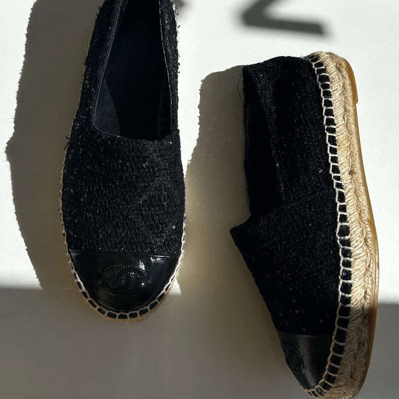 Chanel Black CC Cap Toe Sequin Tweed Flat Espadrilles
