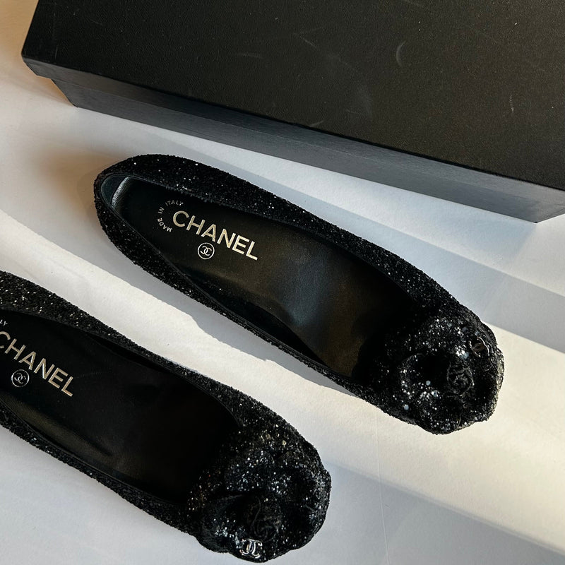 Chanel Black Glitter Camelia Flat Ballerinas