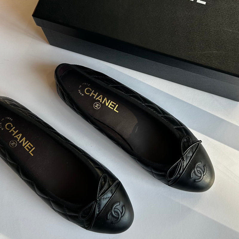 Chanel Black Quilted Lambskin Leather CC Top Flat Ballerinas