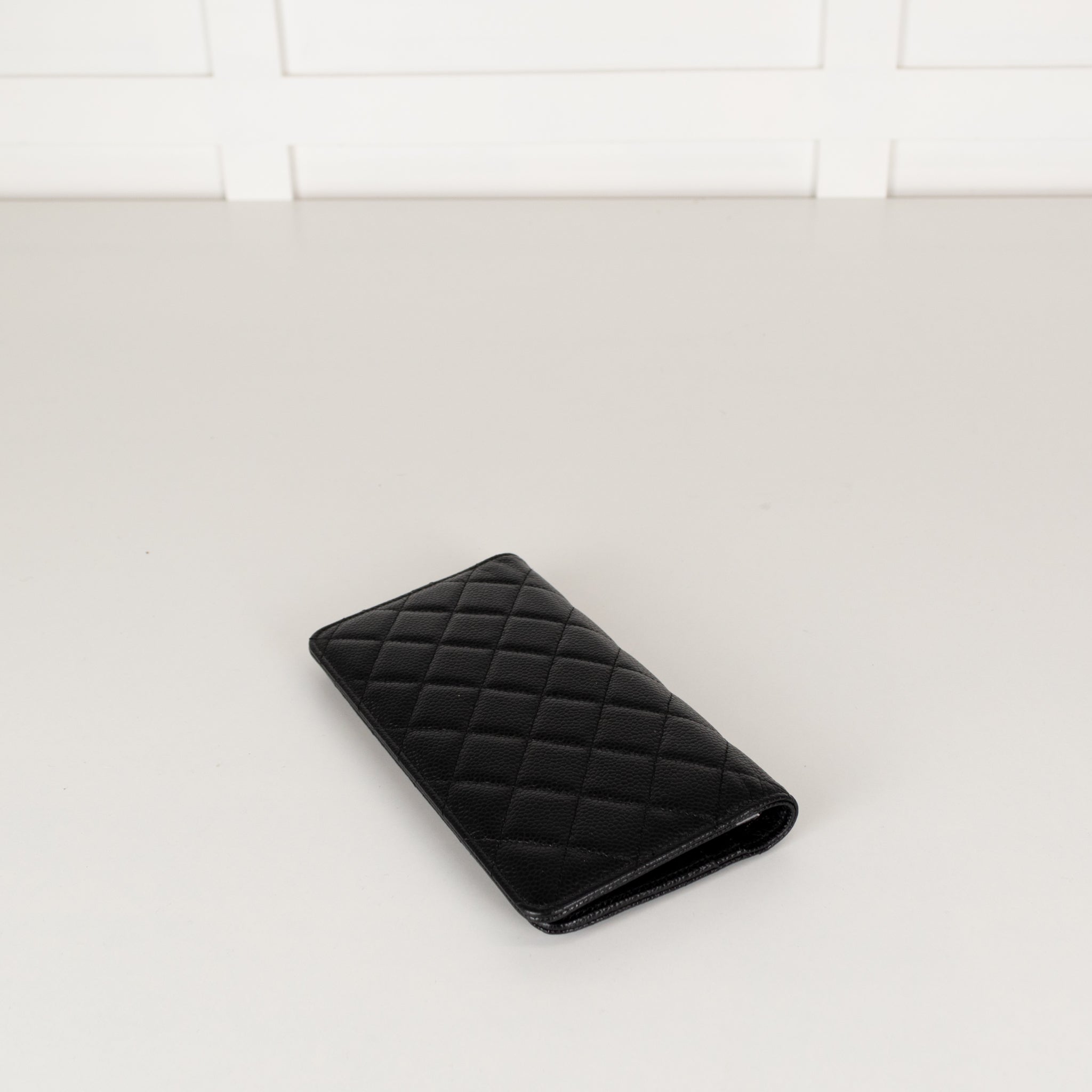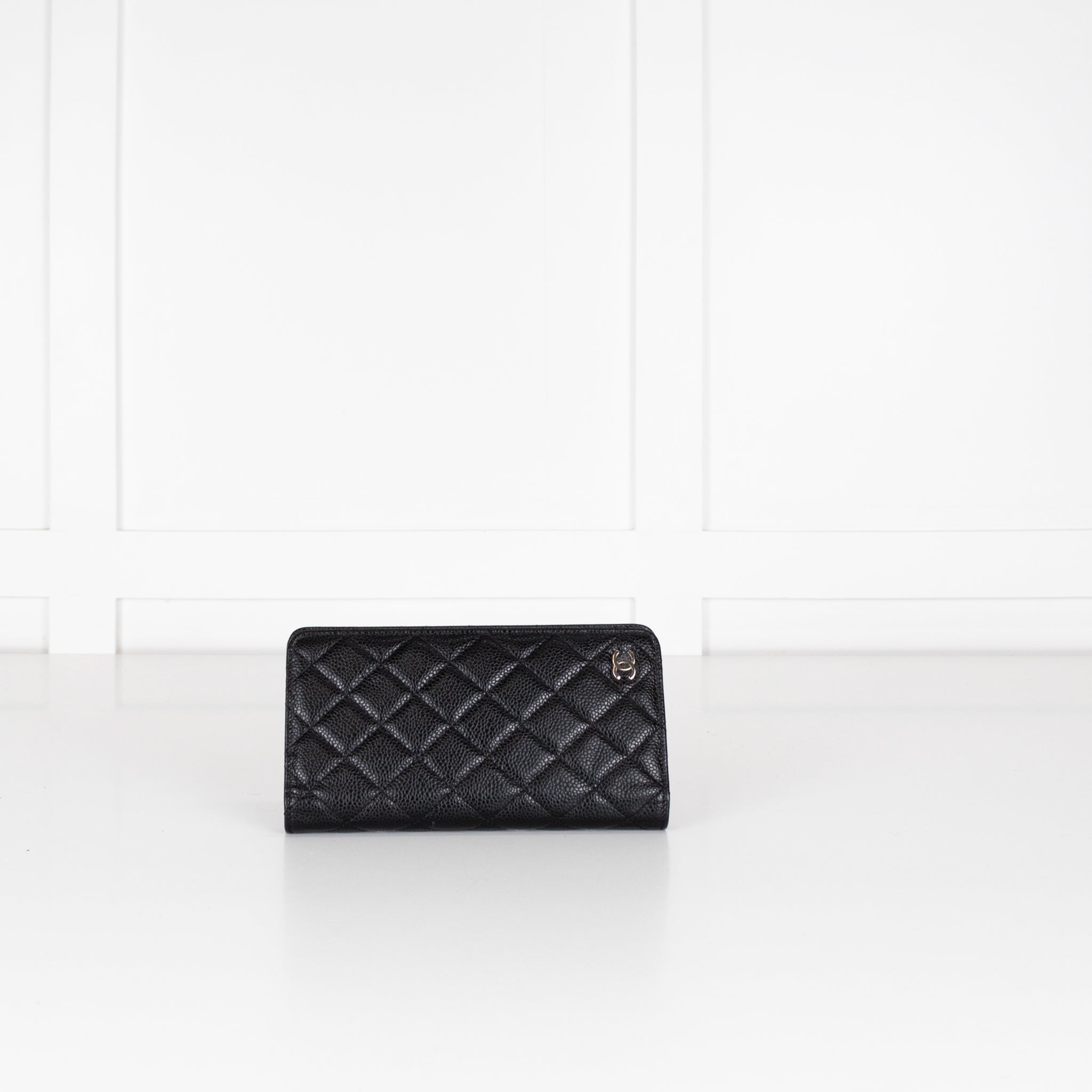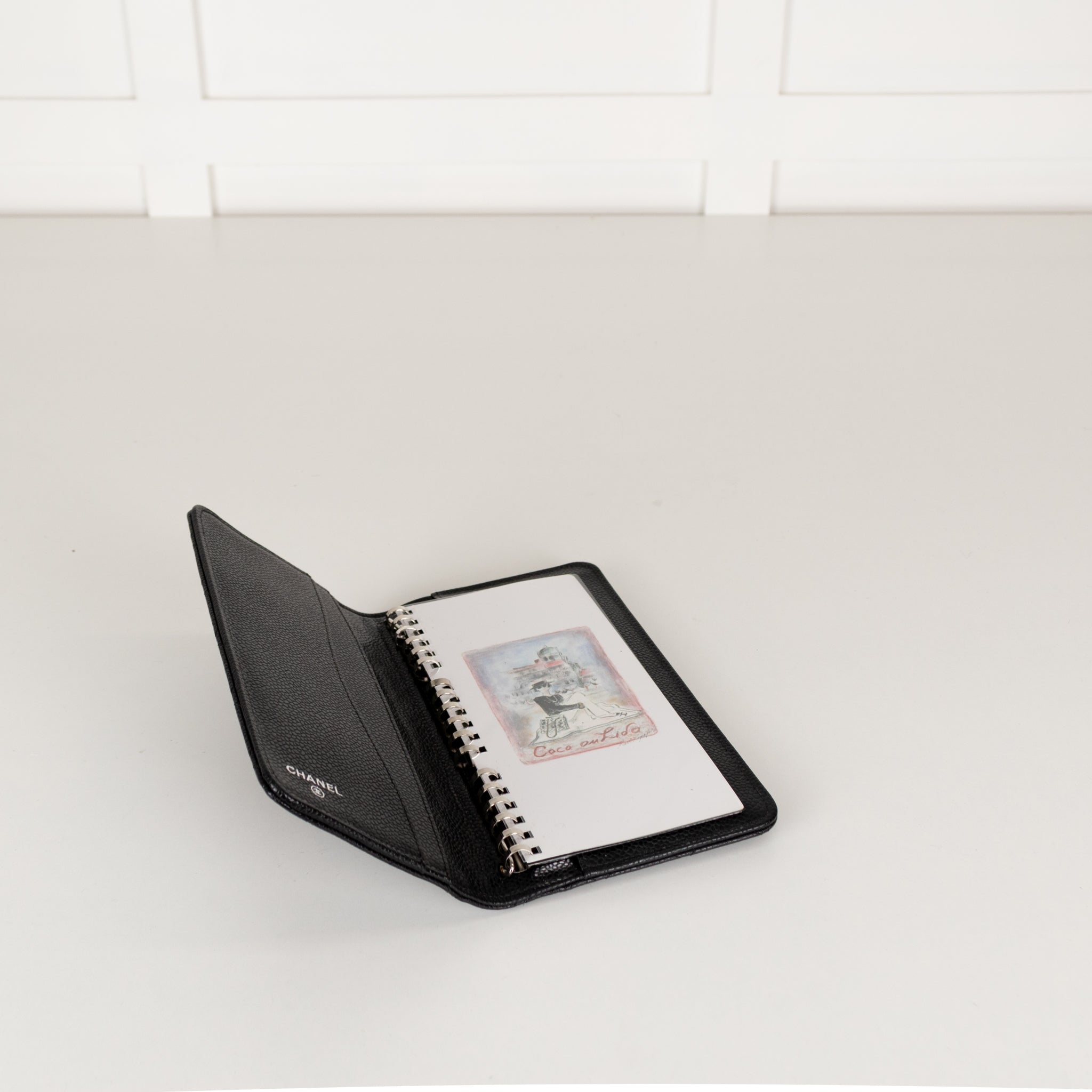 Chanel small black agenda book, crafted with a leather exterior, featuring an elegant quilted front design, a front fold flap, opening into an eighteen-ring binder in the interior, with a beautiful 'Coco auLido' miniature artwork, with three card slots, and a small black address book. This Chanel agena is accompanied by the original dust bag and original box.