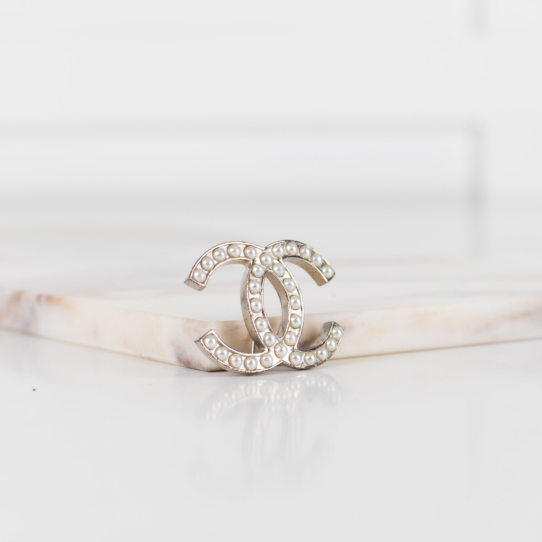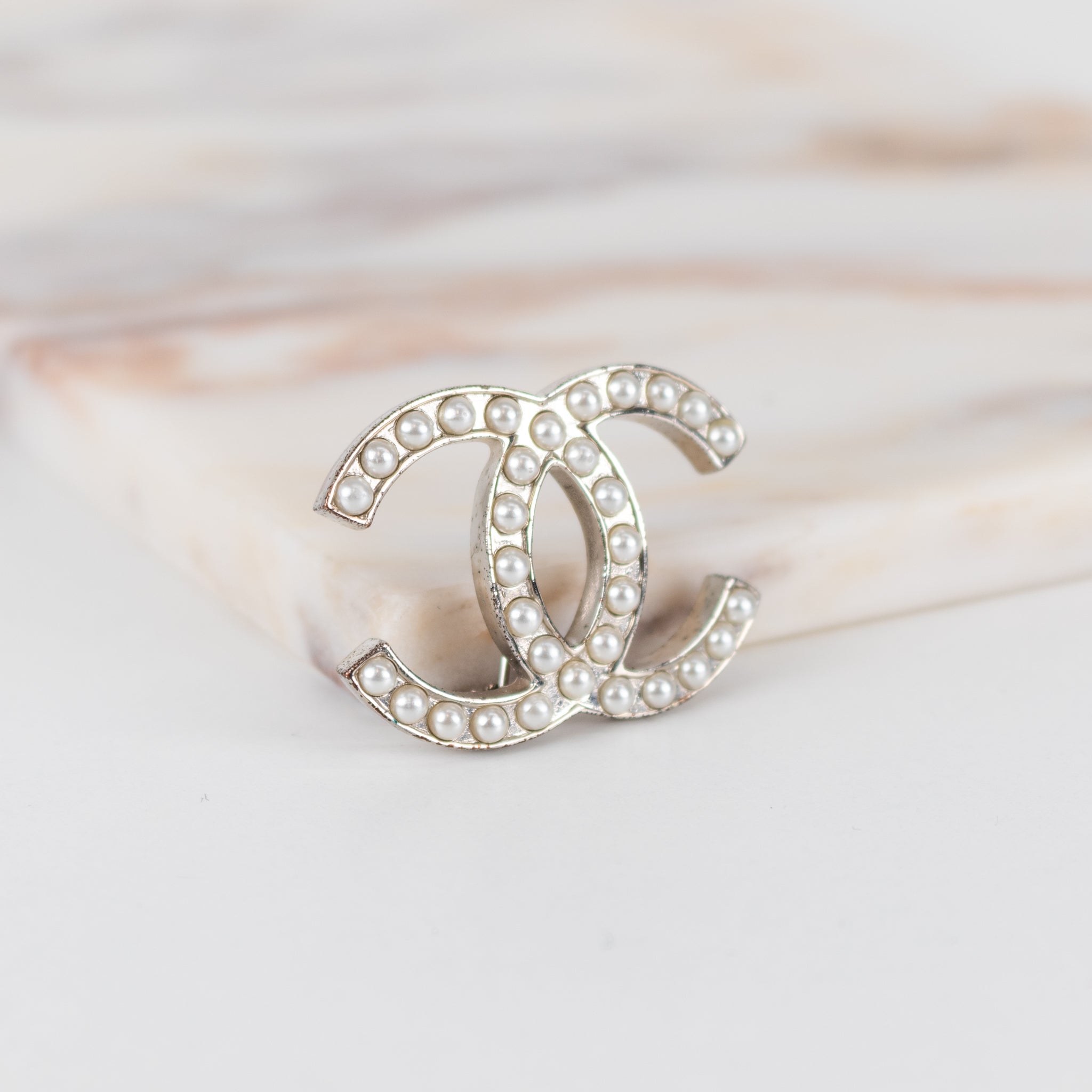 Chanel (2008) silver-tone metal faux pearl CC brooch fixed with a safety pin style closure on the back.