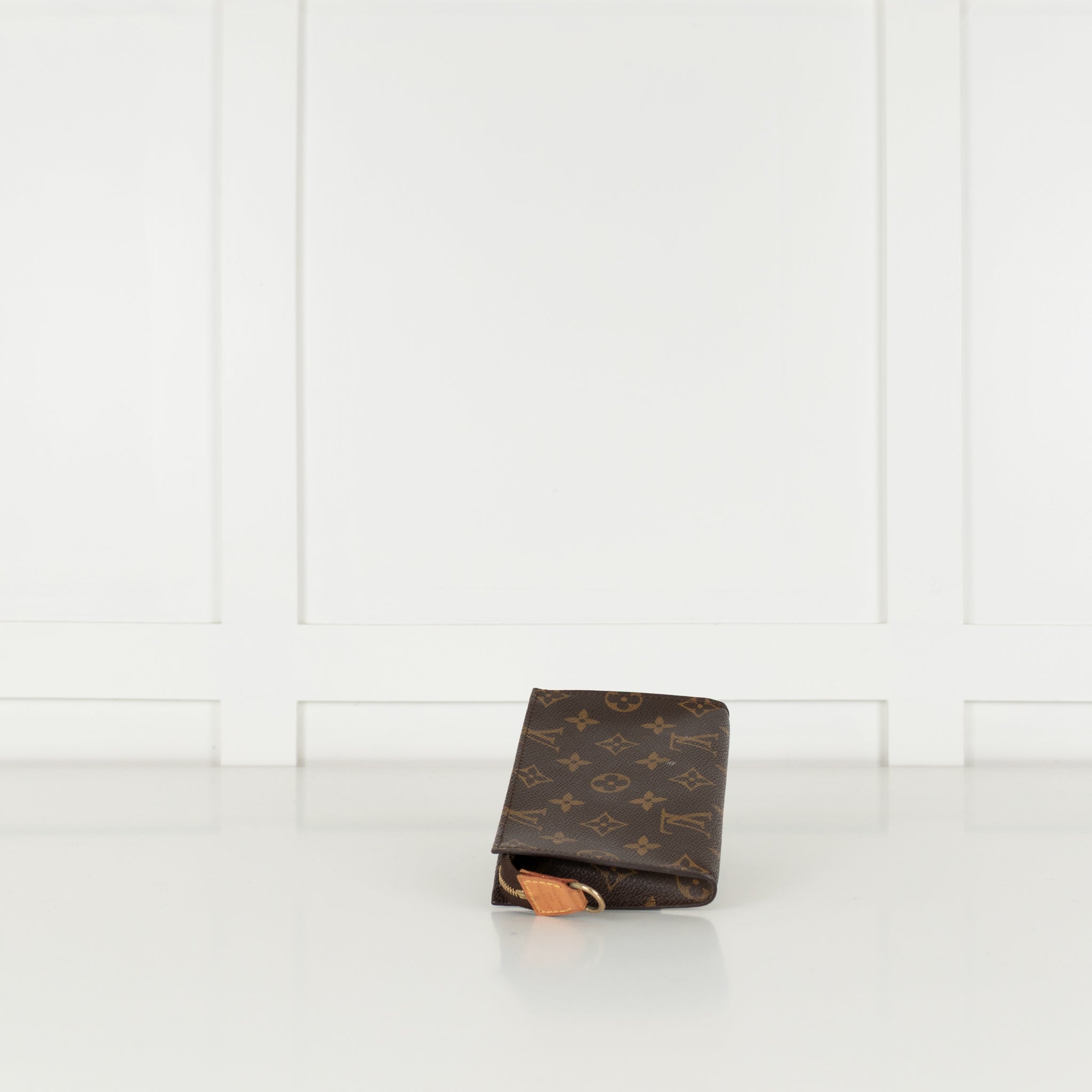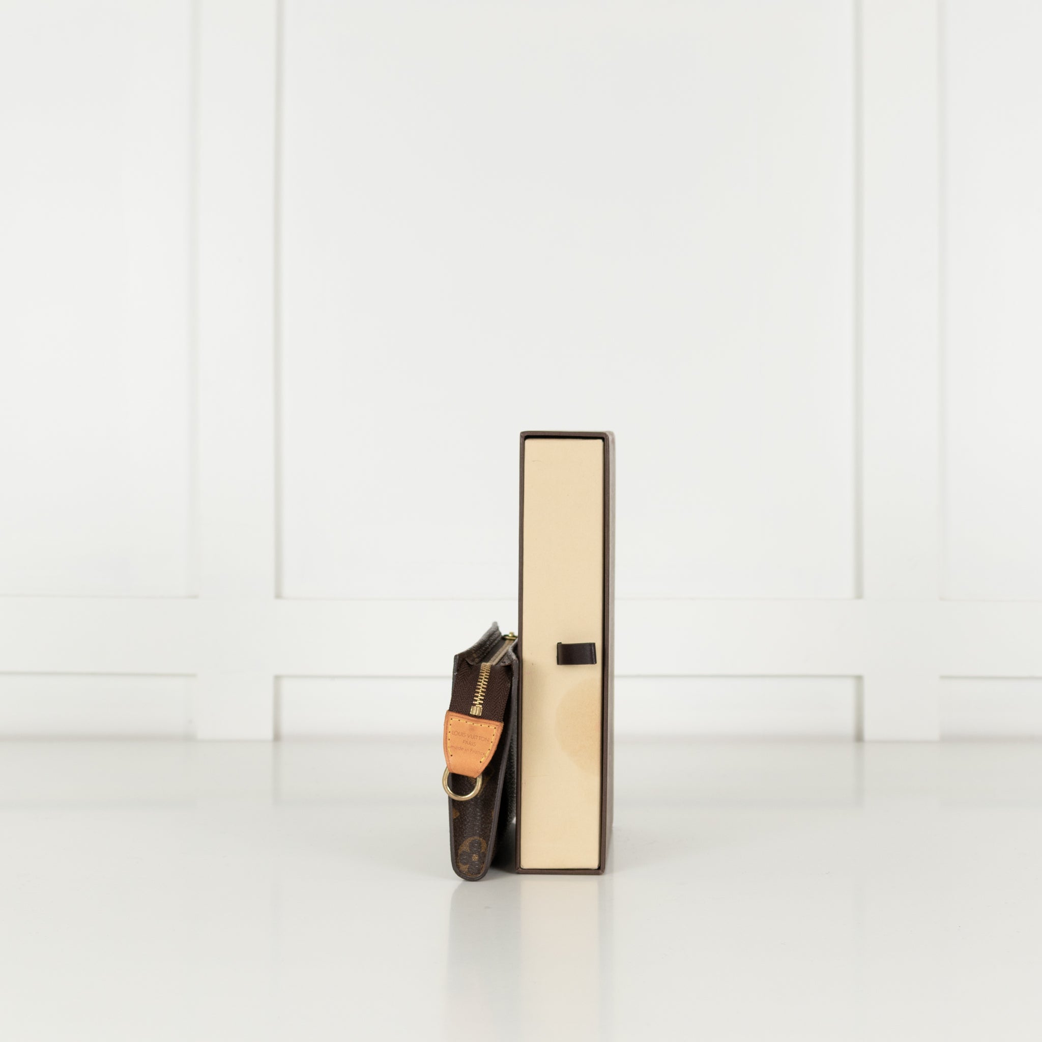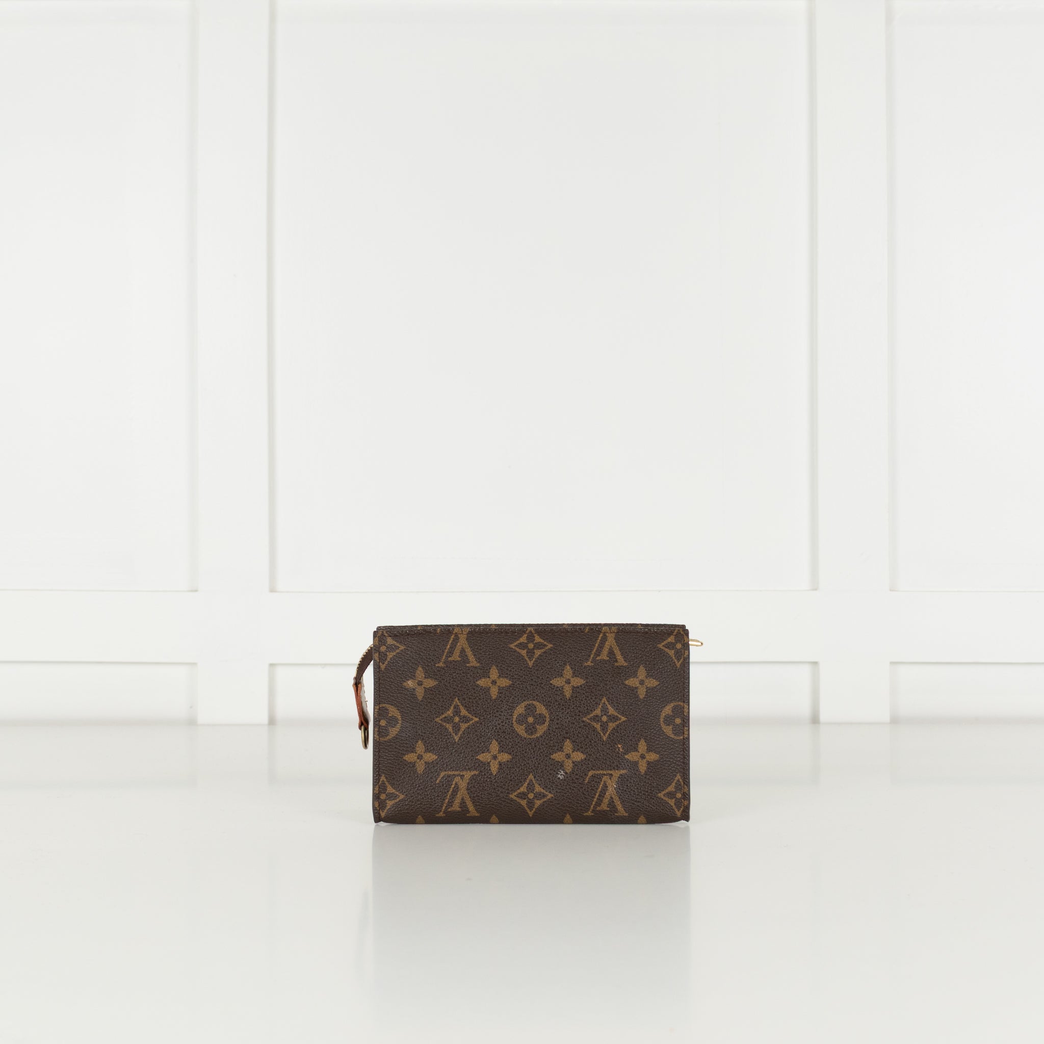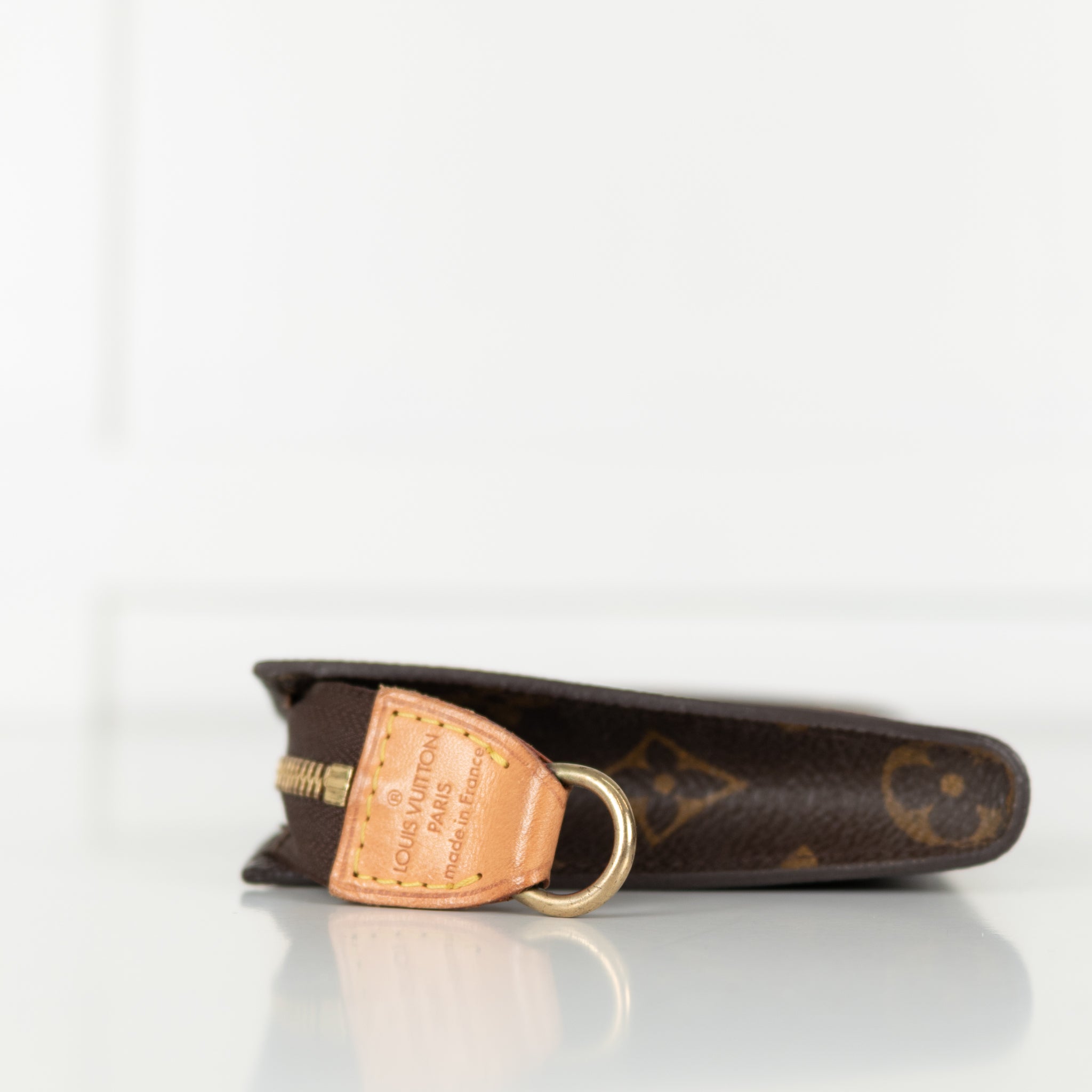 Louis Vuitton small makeup pochette, crafted with brown leather exterior, featuring the iconic LV logo print, with a single gold zip-up front closure. This make-up bag opens into a single light brown leather interior compartment. Accompanied by the original dust bag and original Louis Vuitton box.