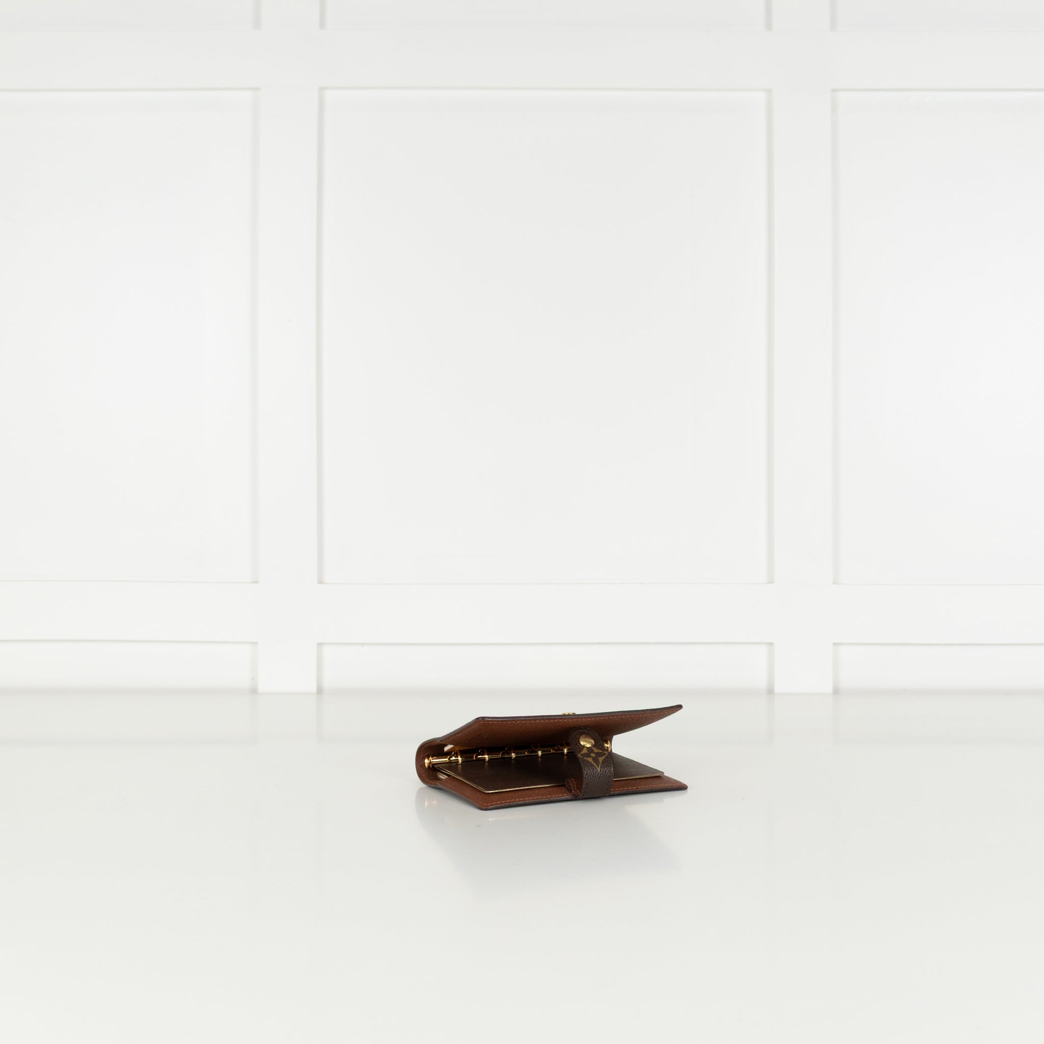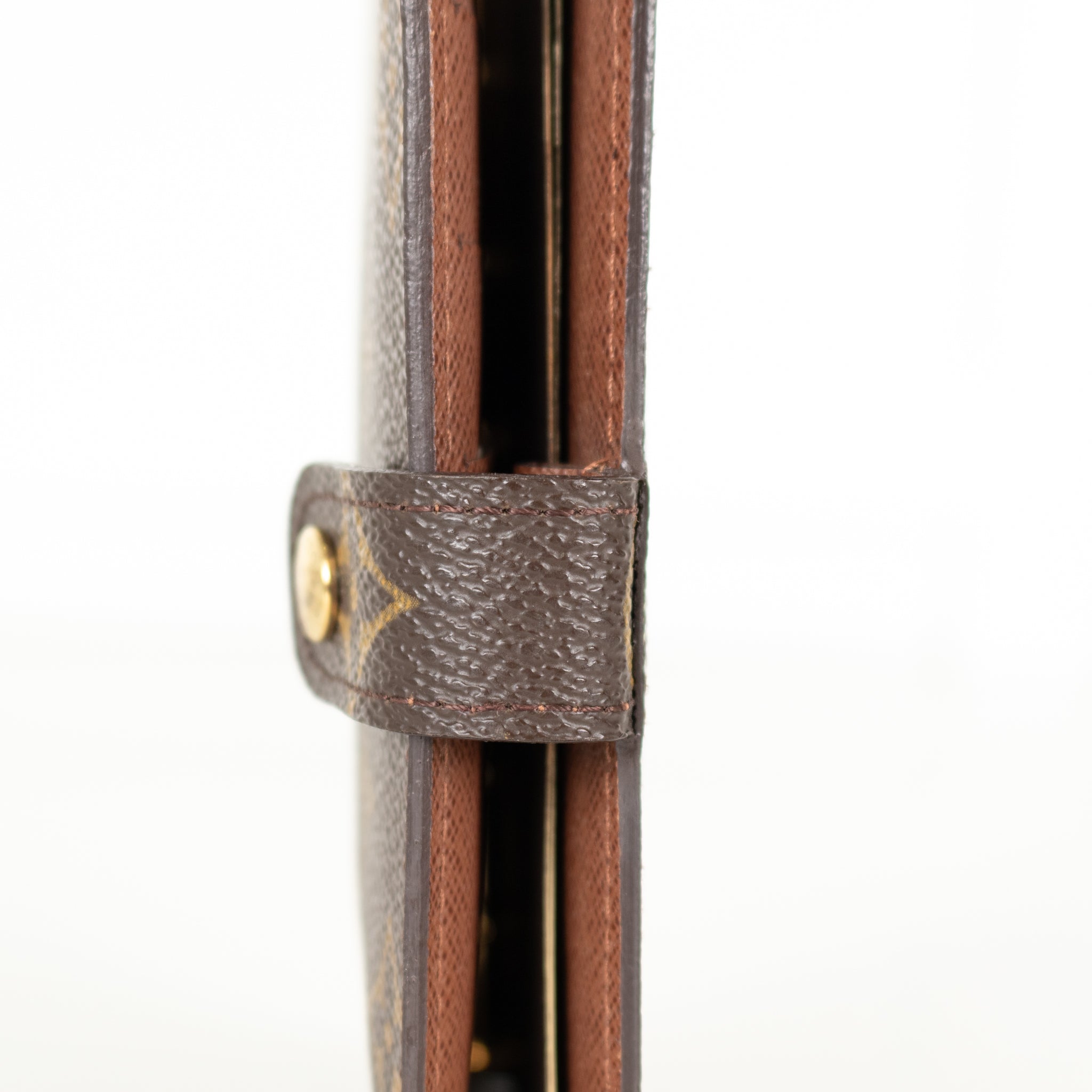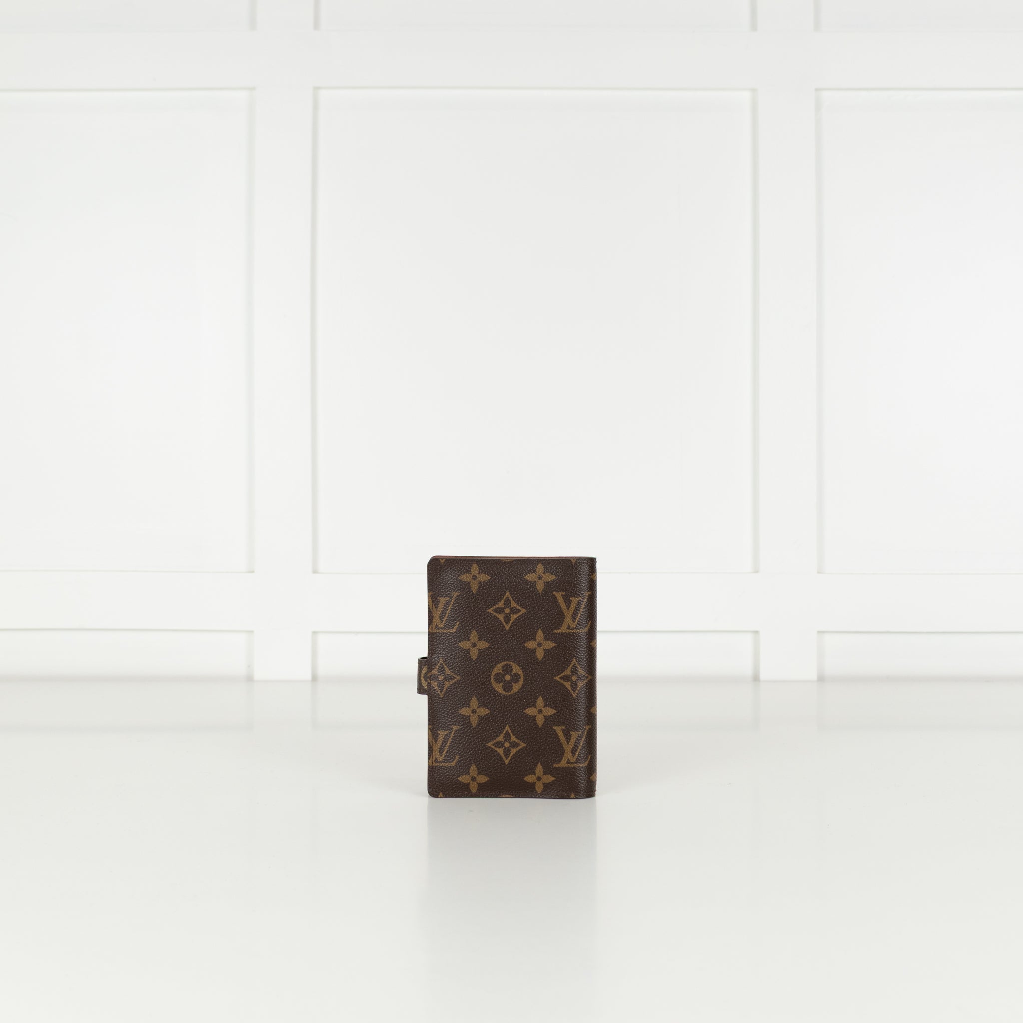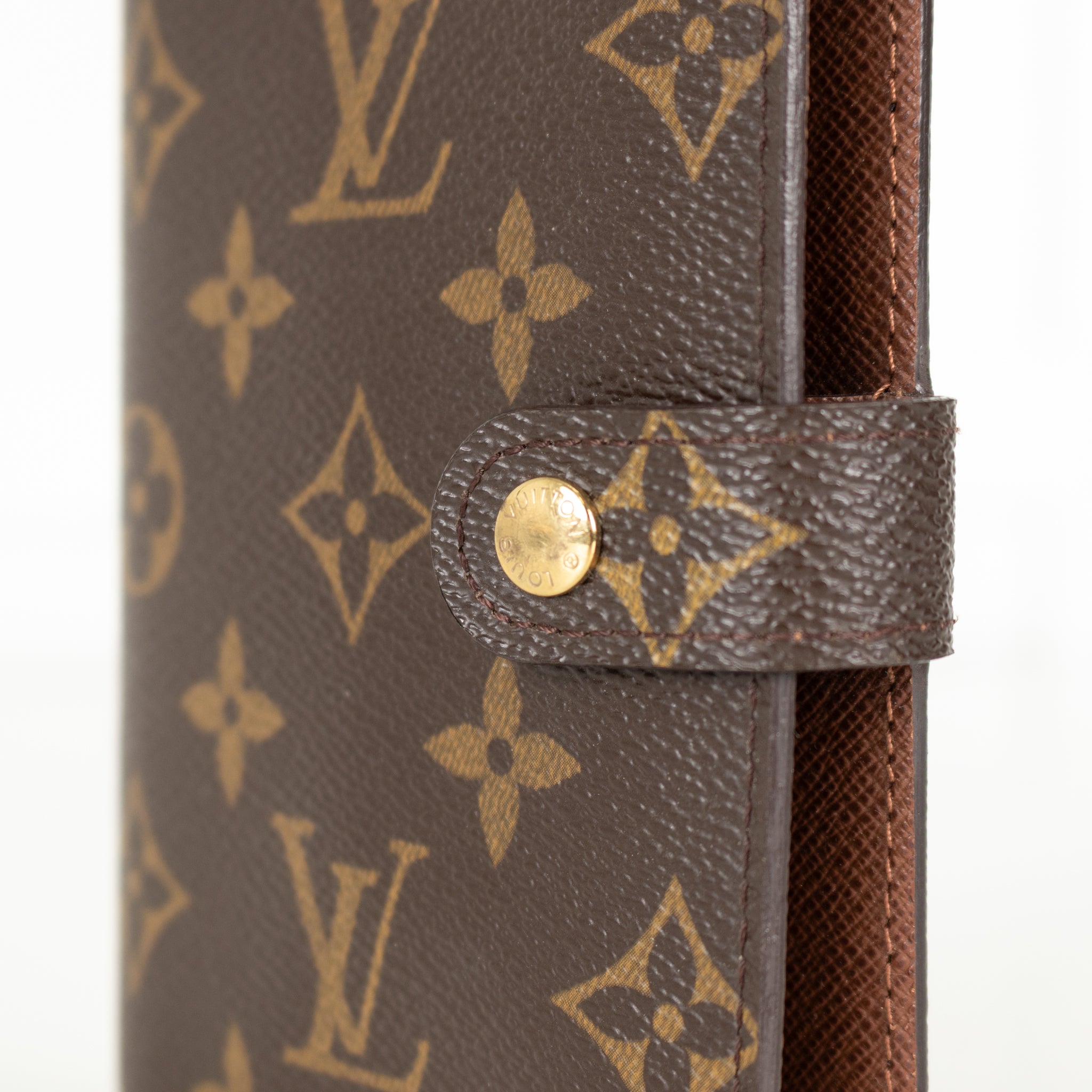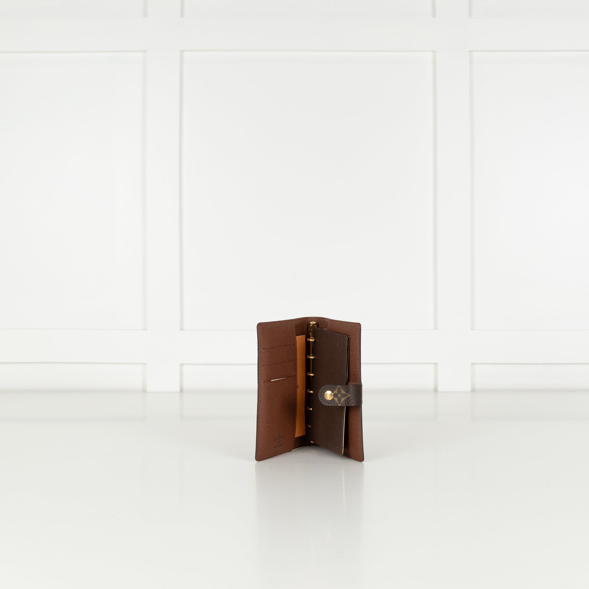 Louis Vuitton small monogram agenda book, crafted with brown leather exterior, featuring the iconic LV logo print, with a single press stud closure, a six-ring binder in the interior, with three card slots, a front pen holder and is accompanied by a miniature address book, dust bag and original Louis Vuitton box.