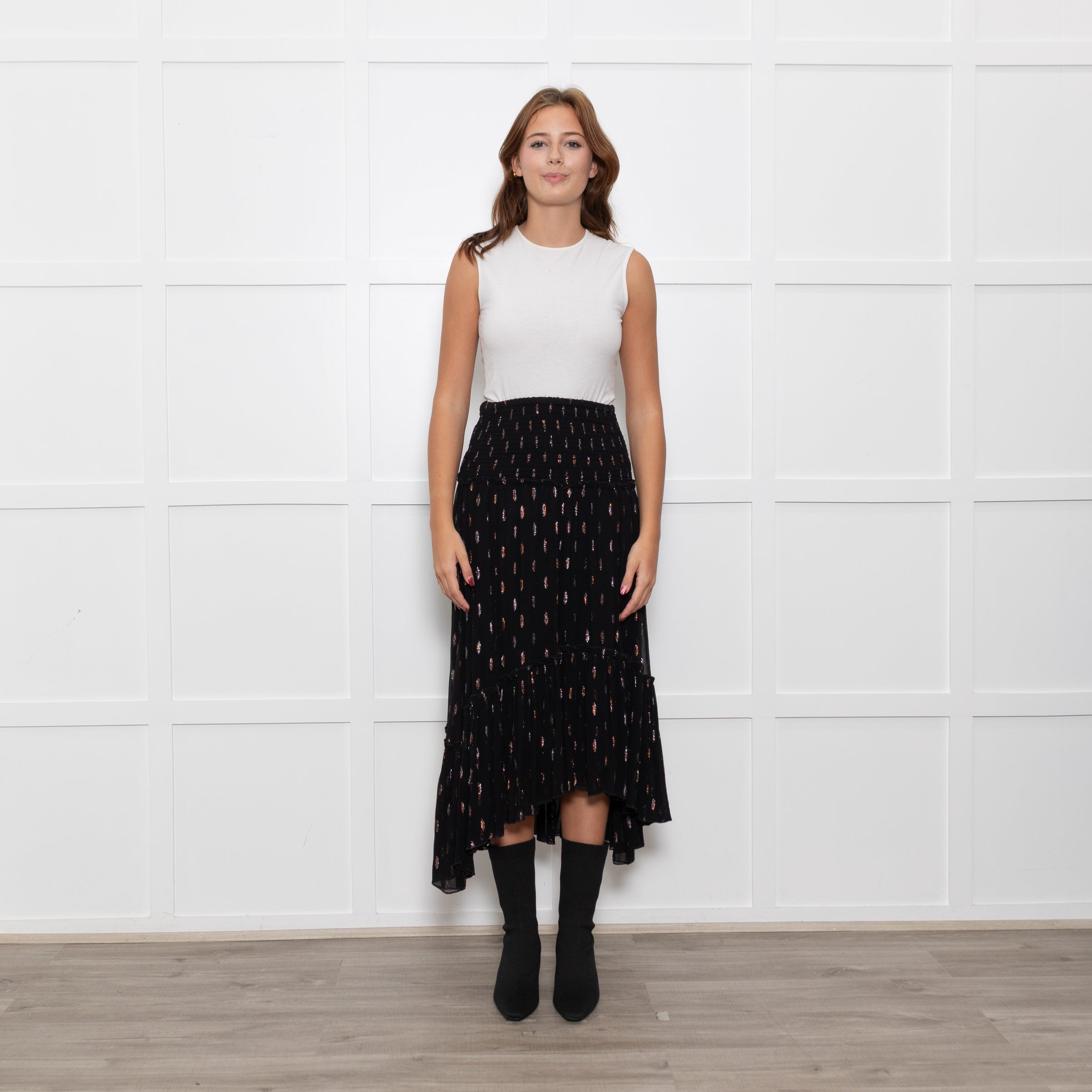 By Iris black flowy frill skirt, featuring a shirred waist with a stunning metallic design.