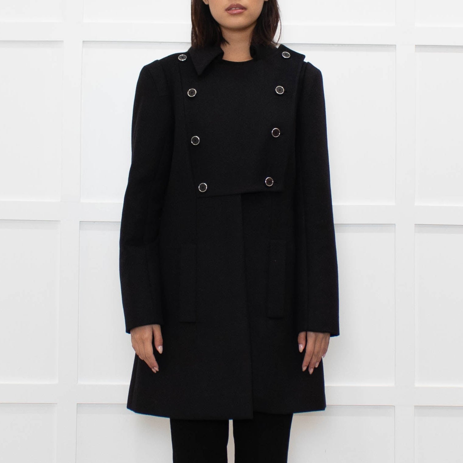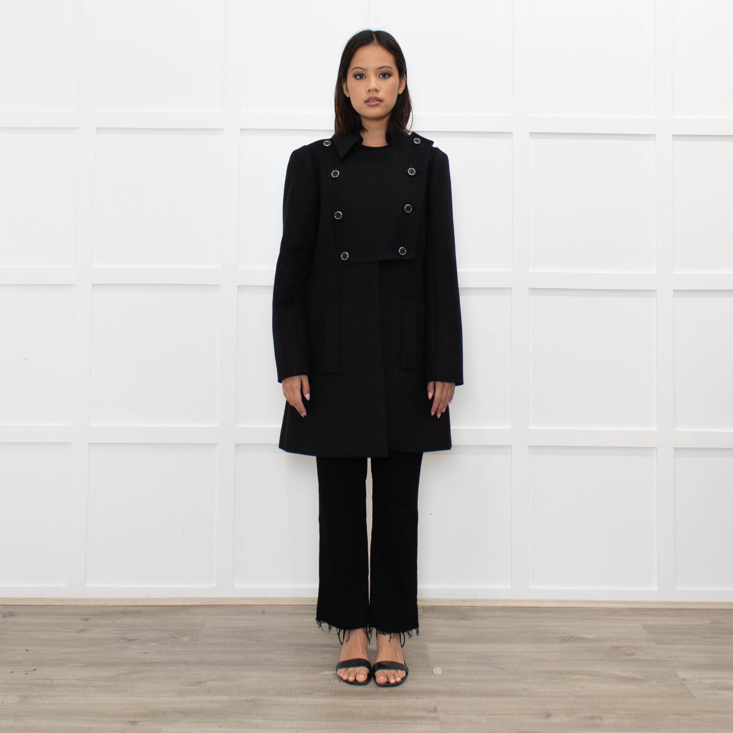Chloe black double-breasted wool and cashmere mix coat with long sleeves, side slip pockets, a pointed collar, and a full lining.