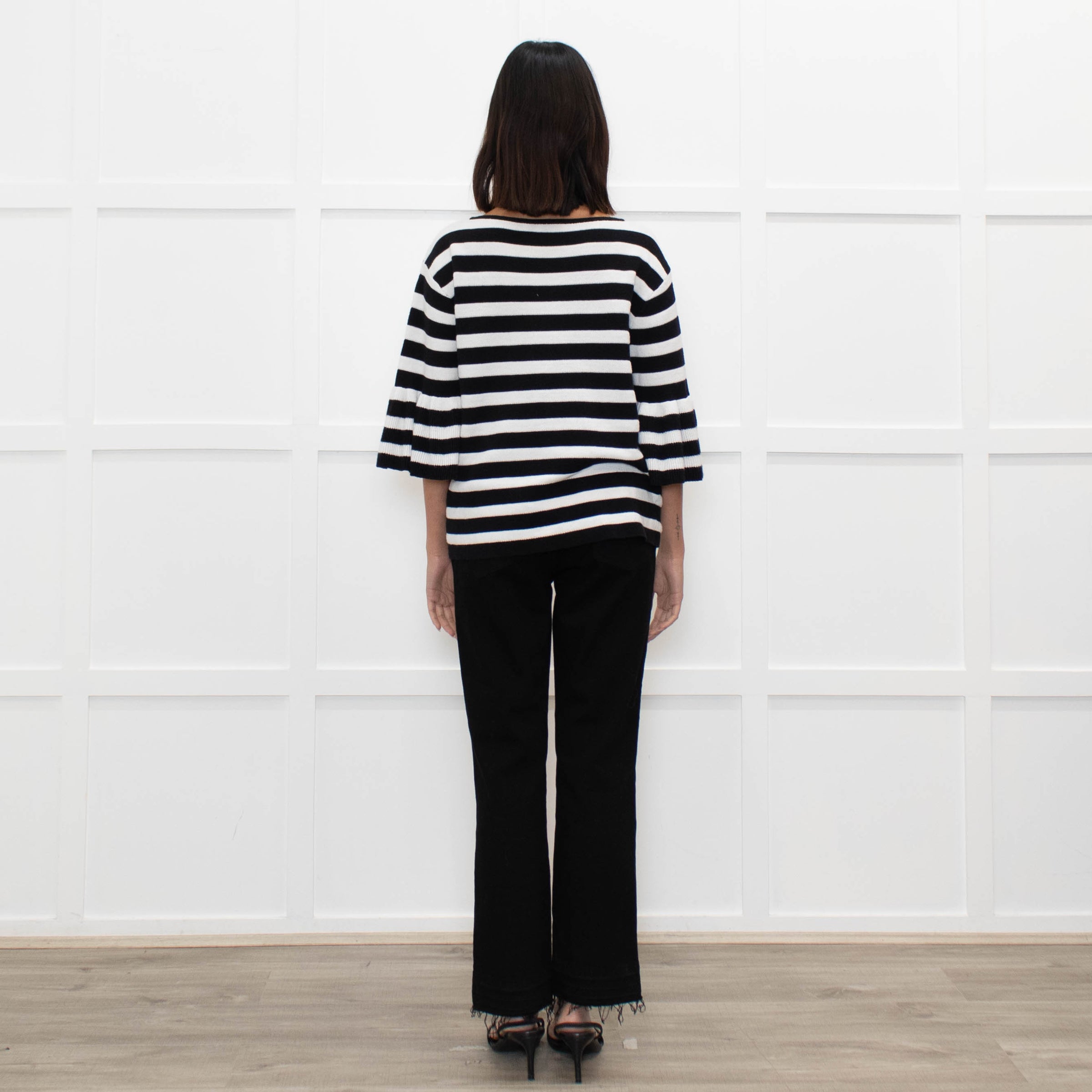 Claudie Pierlot black and white striped top with cropped sleeves, frilled cuffs, a rounded neckline, and embroidered Claudie detailing on the front.