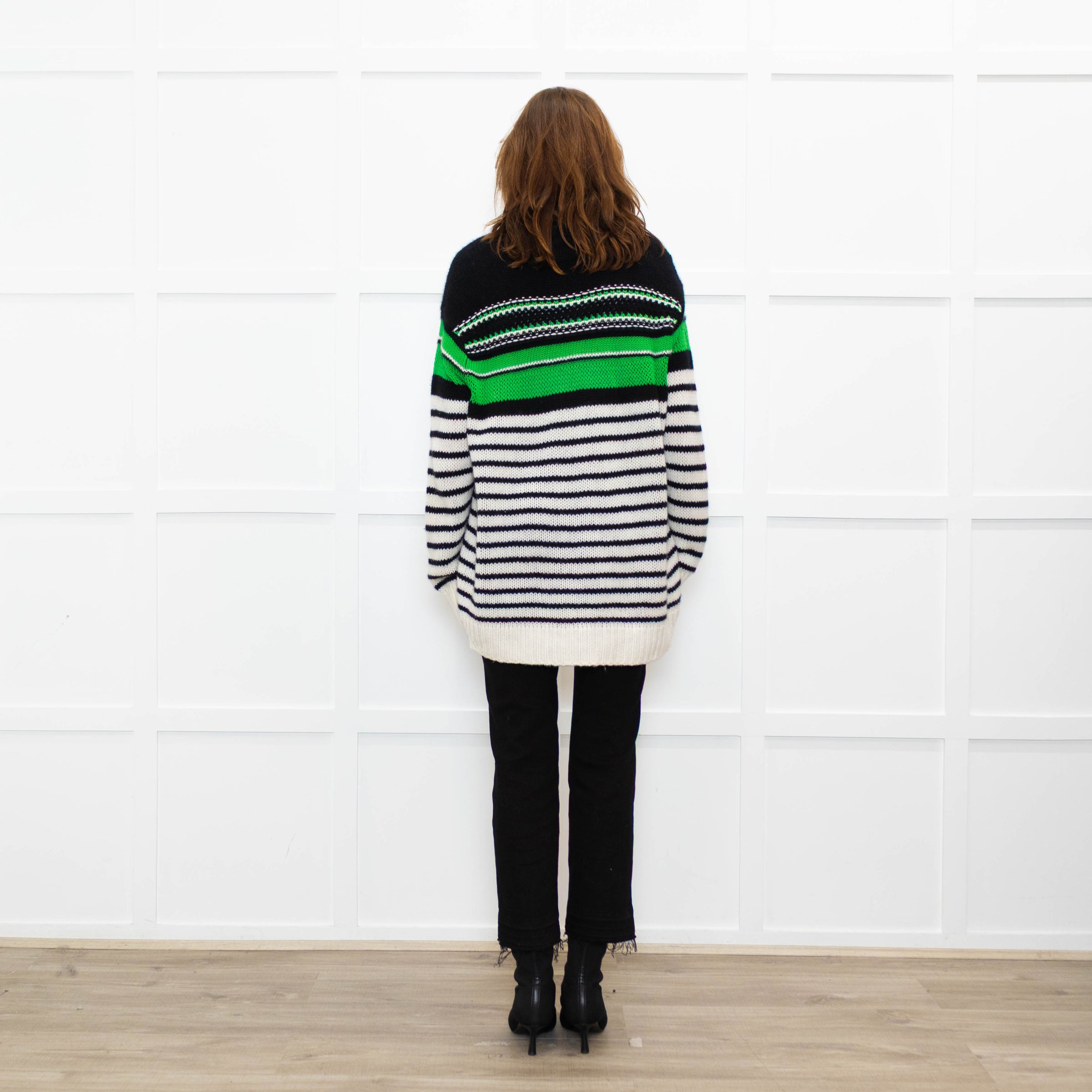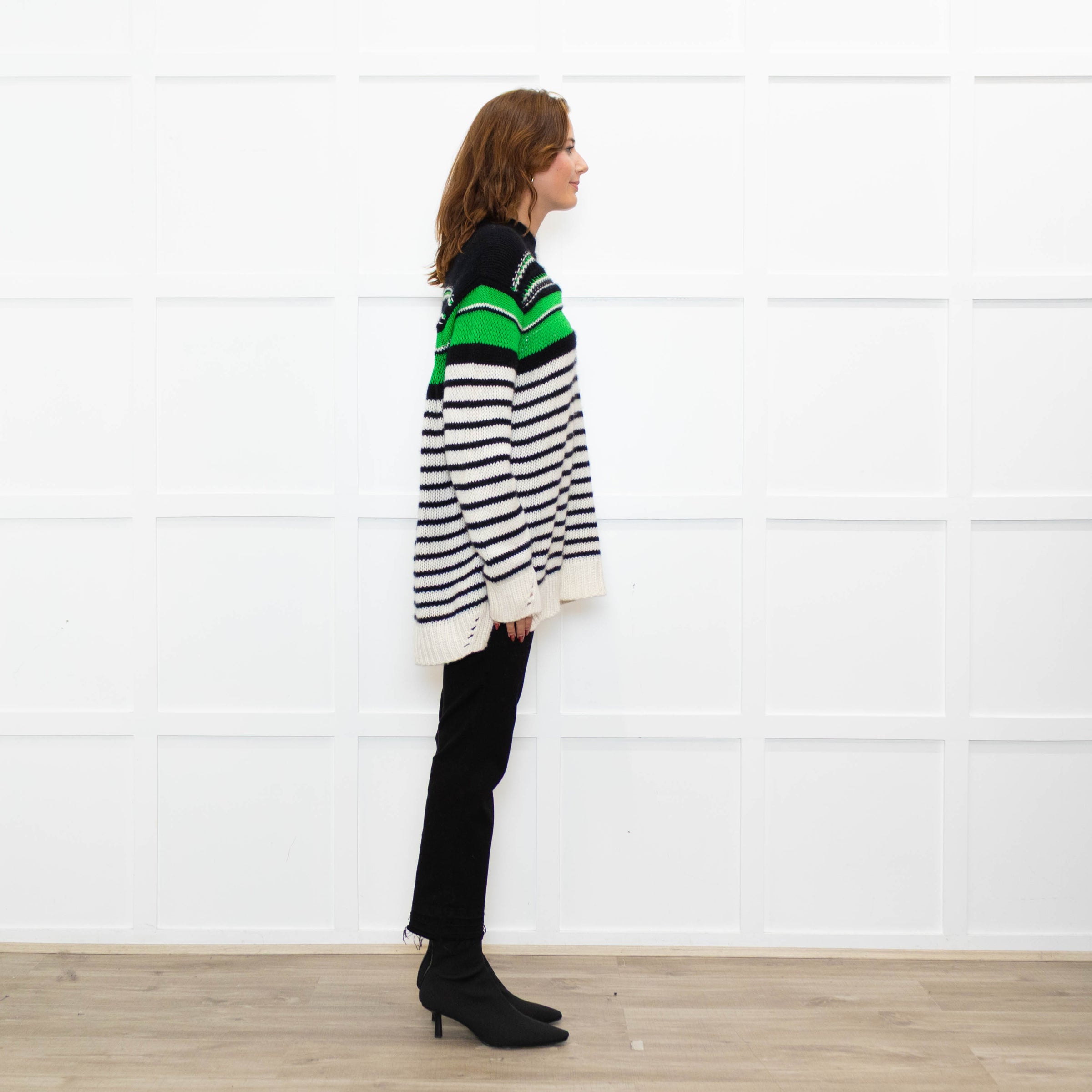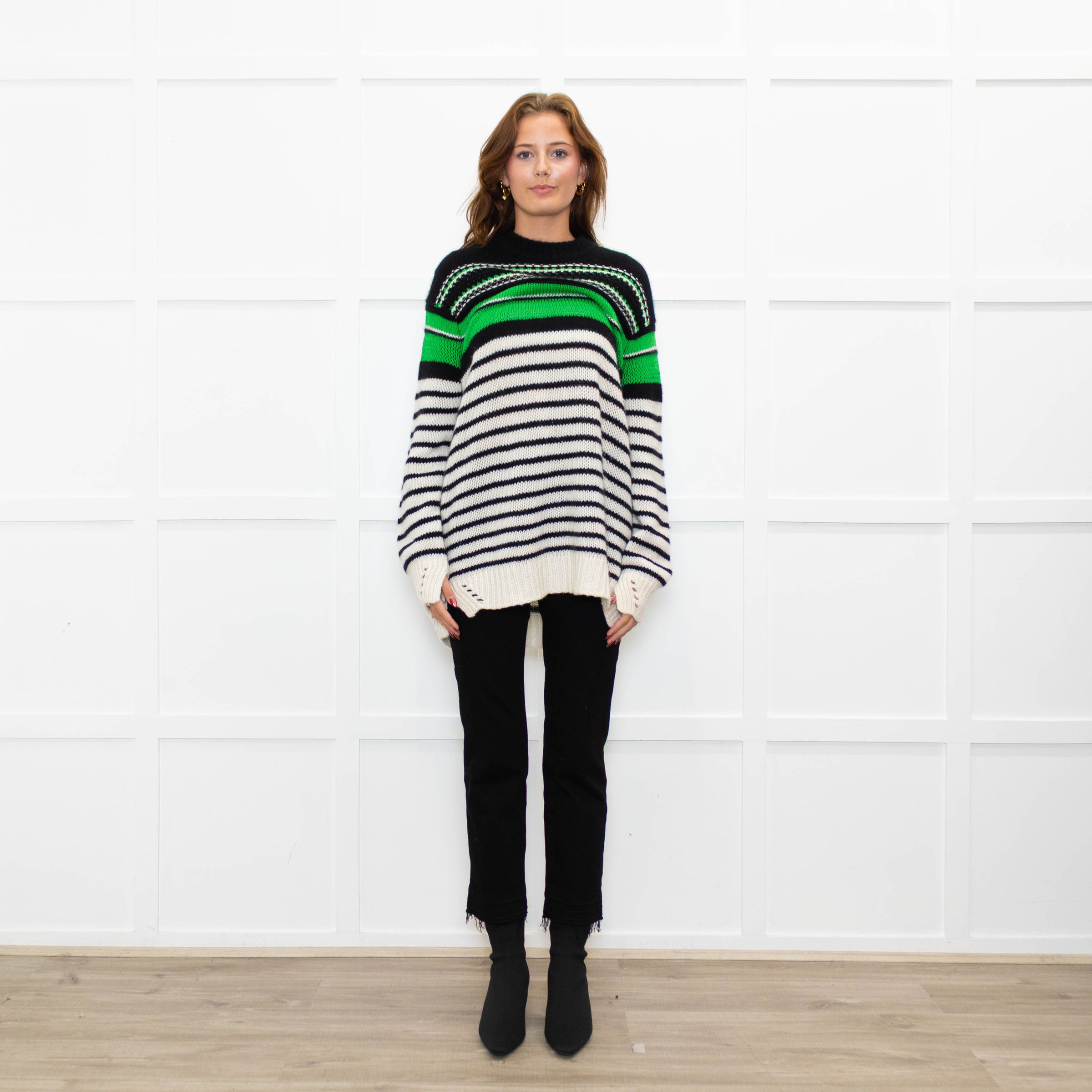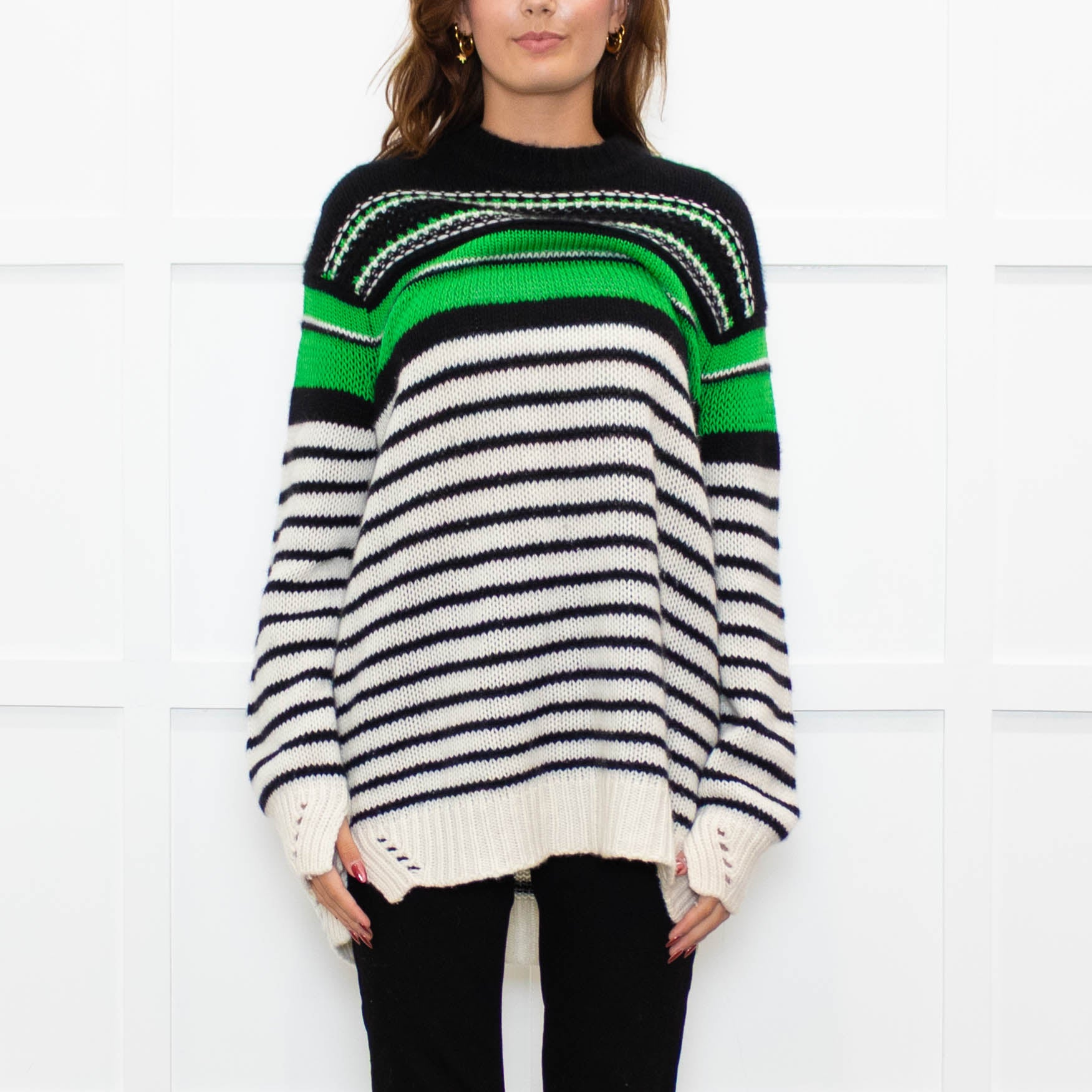 Ermanno Scervino cream, black, and green striped cashmere blend jumper with a rounded neckline, longline cut, long sleeves, and small side splits.