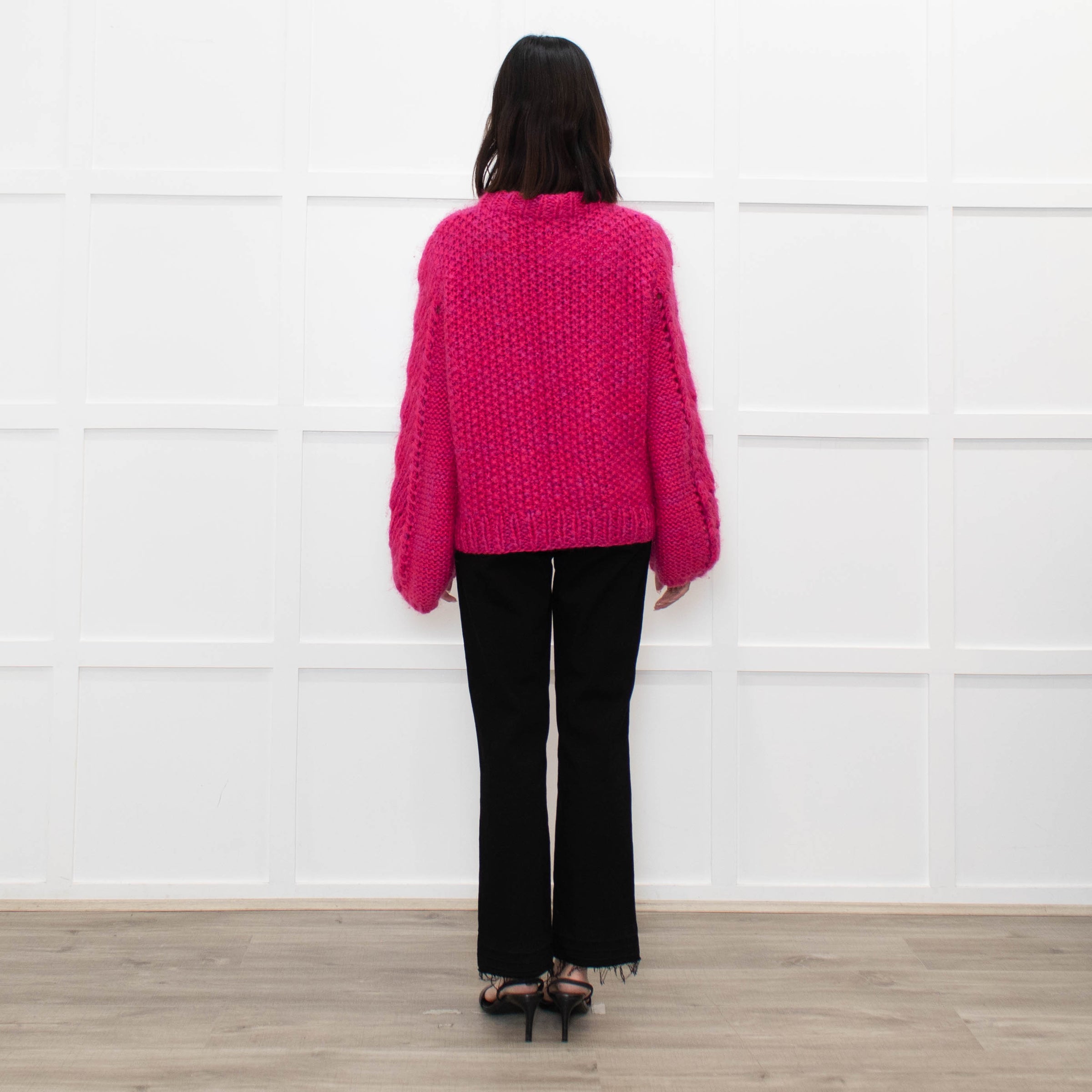 Ganni pink mohair wool blend jumper in a chunky cable knit. Finished with long sleeves, ribbed knit trim, and a rounded neckline.
