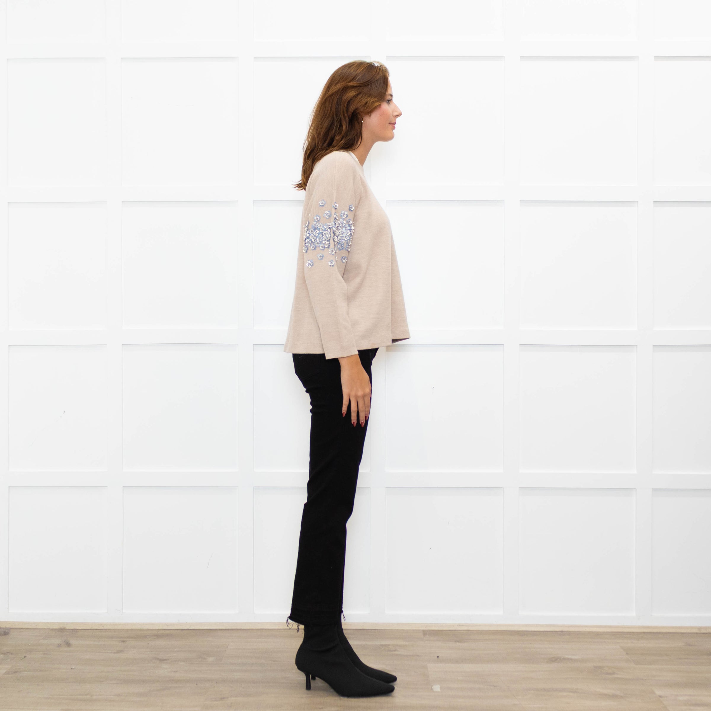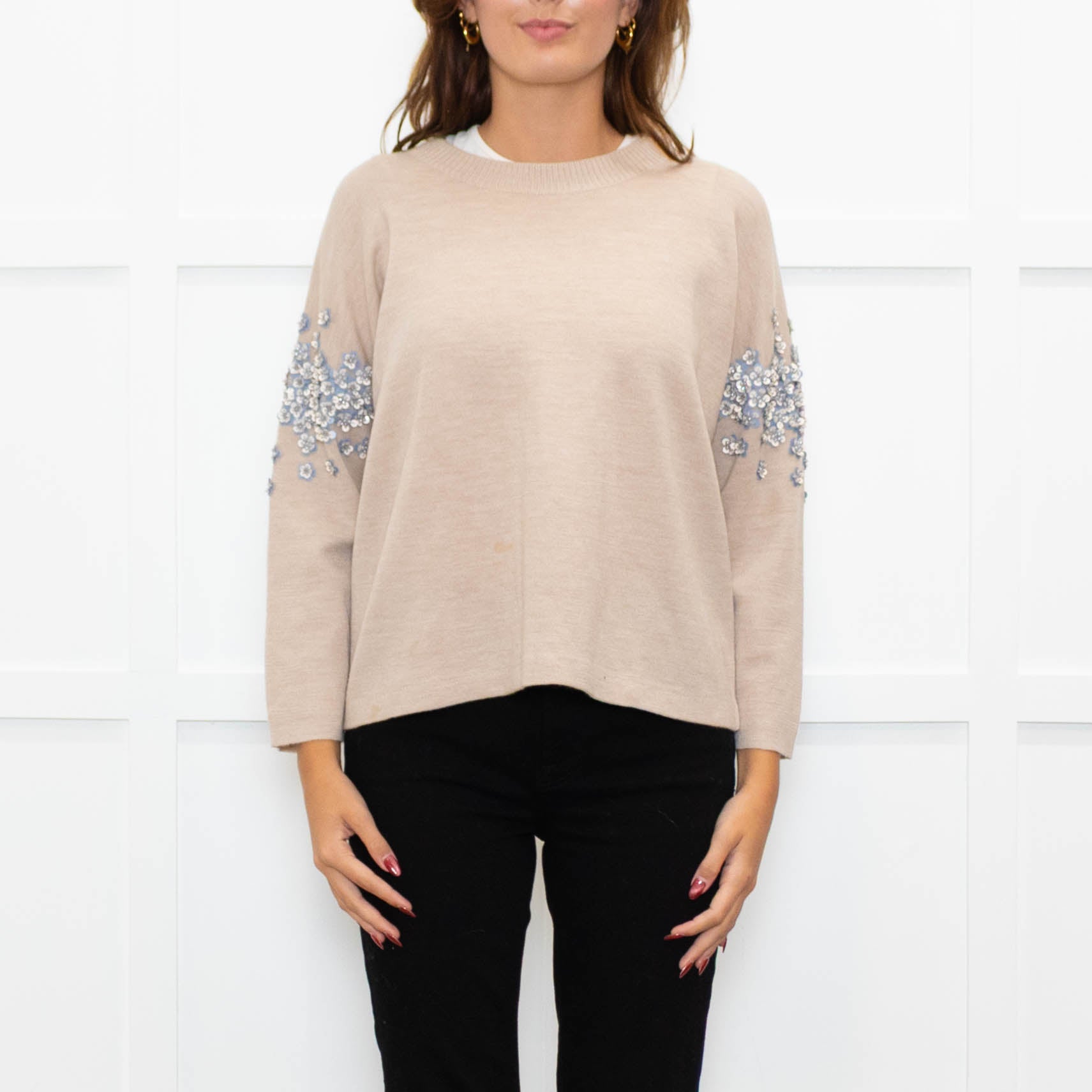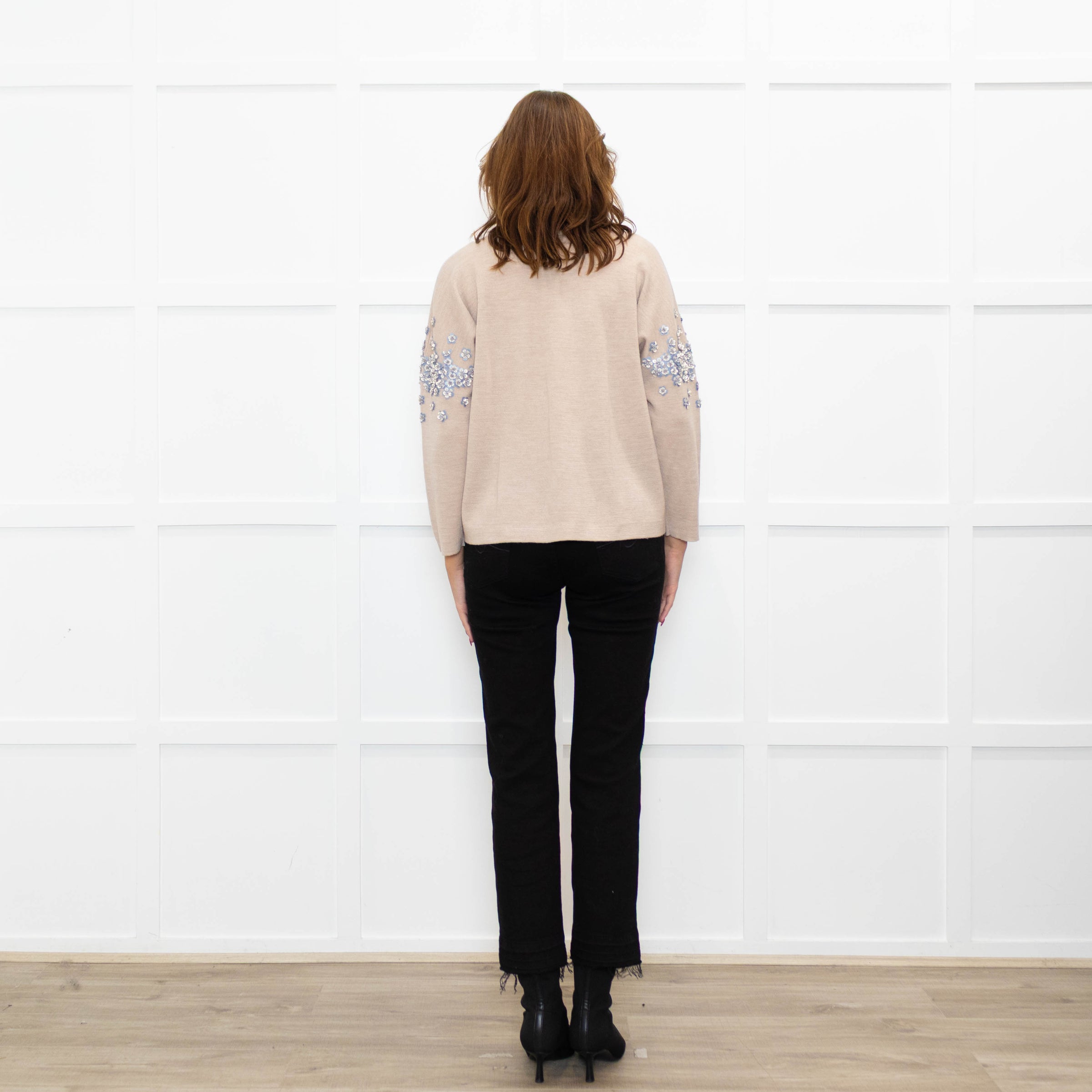 J Crew beige flower embellished sleeve sweater with a rounded neckline and ribbed trims.