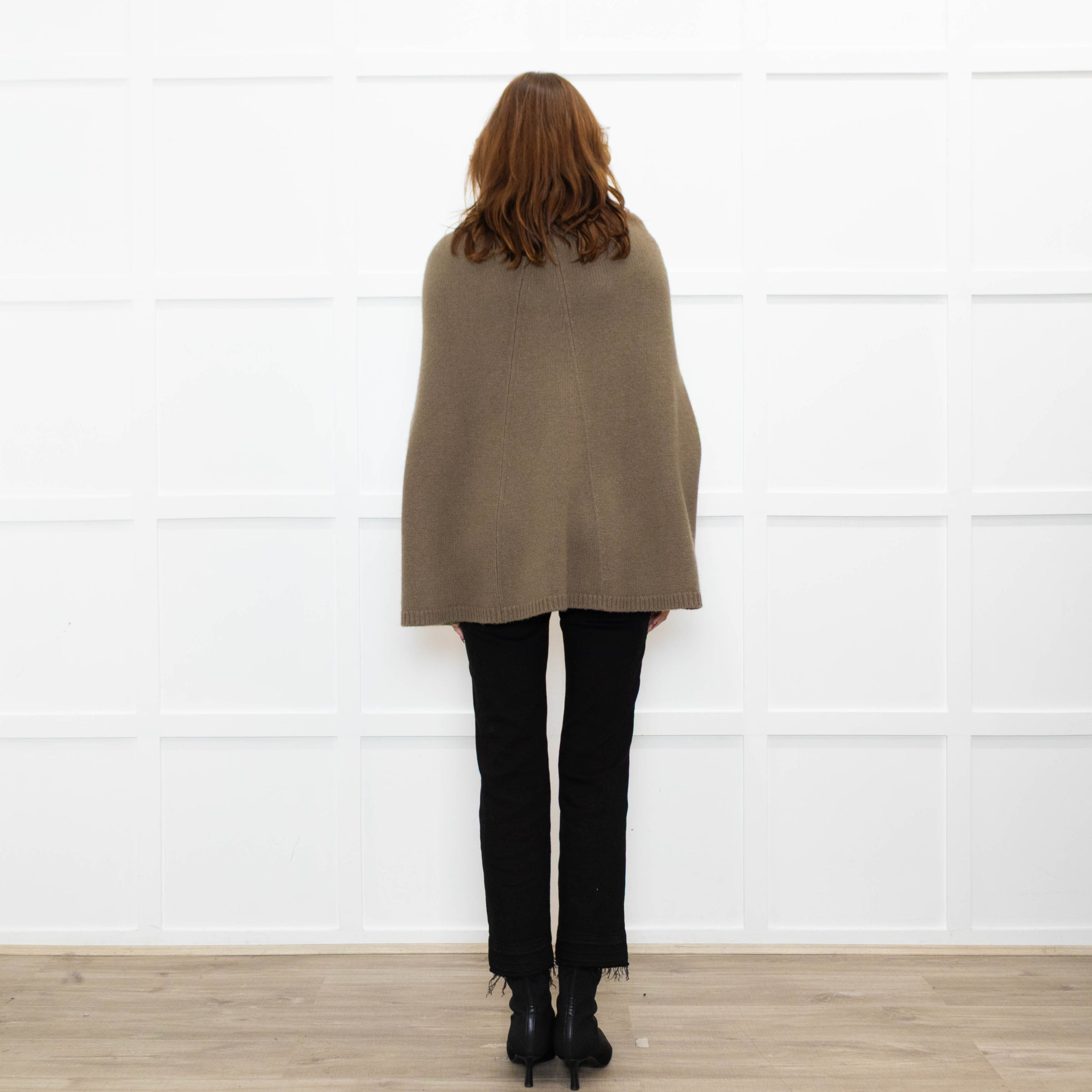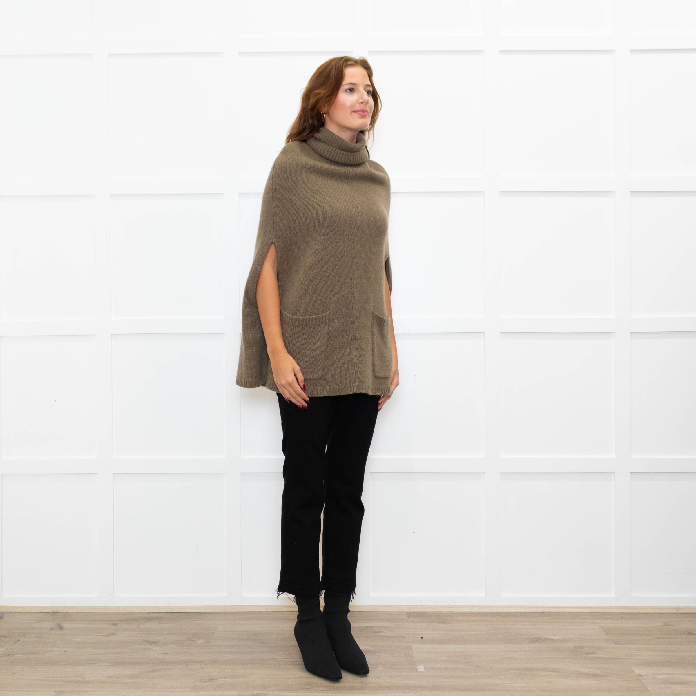 Joseph olive green cashmere high roll neck cape with front patch pockets, and side slits for arm openings.