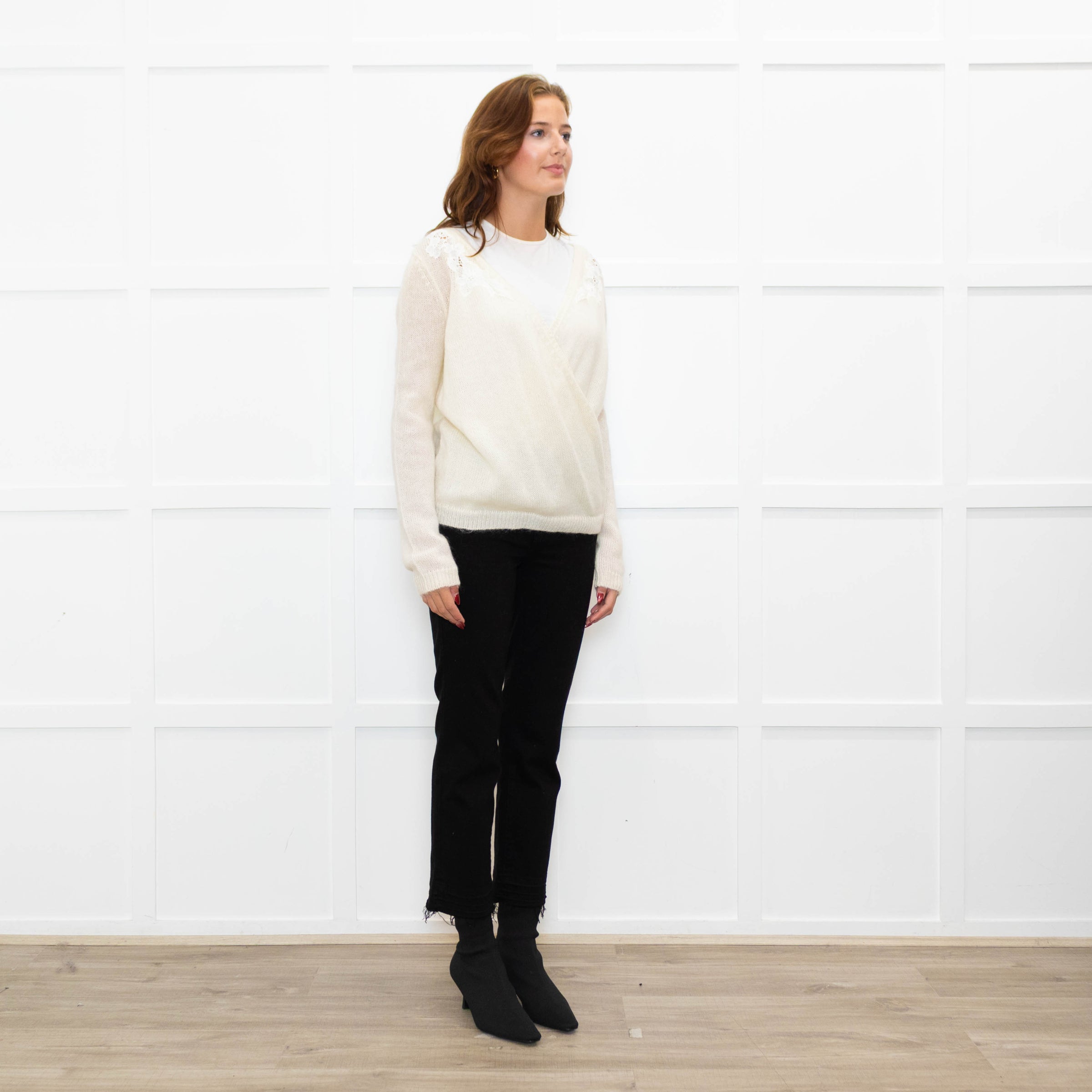 La Maille Sezane cream wrap style jumper with white lace applique detailing, long sleeves, and ribbed trims.
