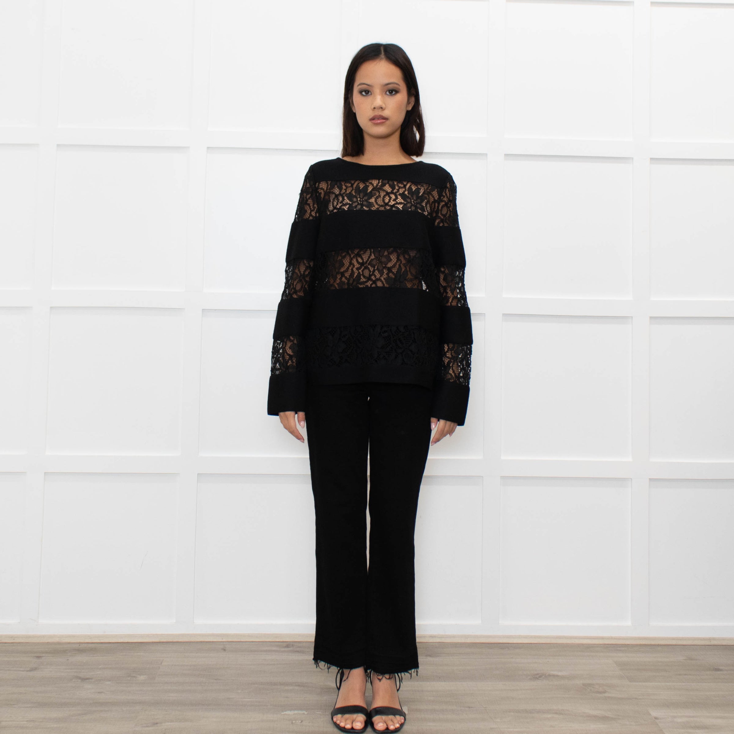 Les Copains long sleeve black top with floral lace Inserts and a small button-up back.
