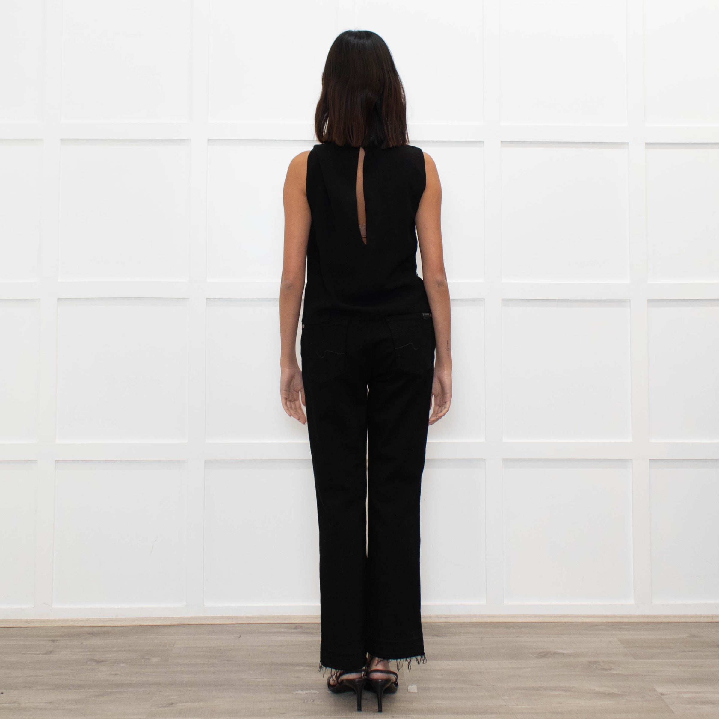 Maje vest top with a black back panel, and a blue sequinned front. Finished with a rounded neckline, sleeveless cut, and button fastener at the back of the neck.
