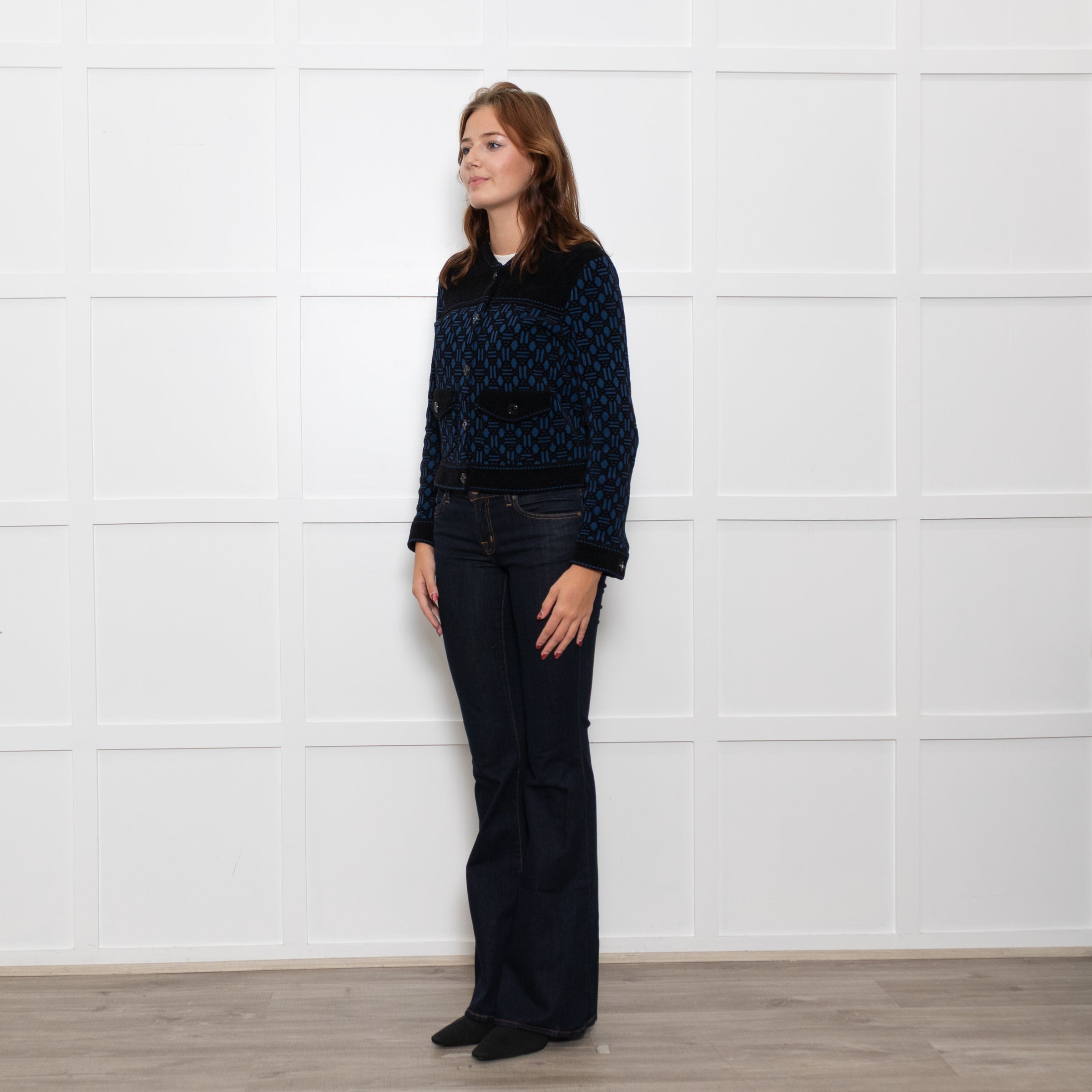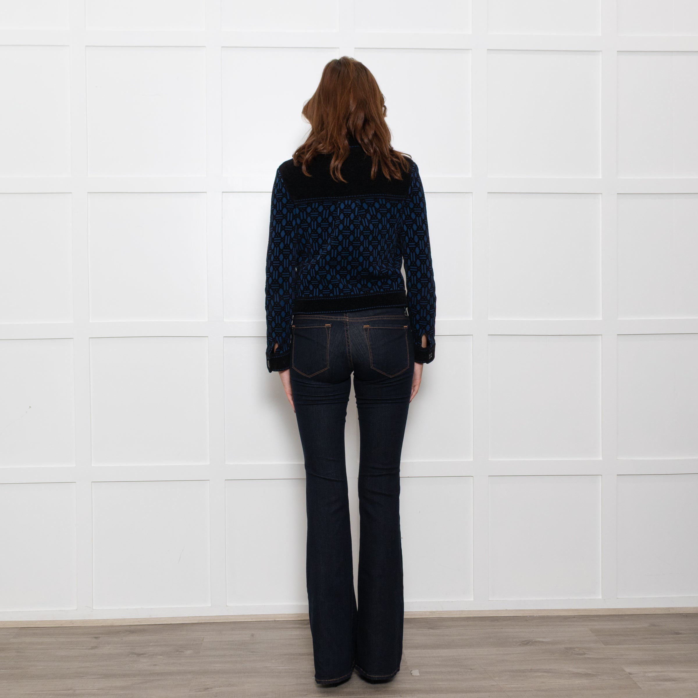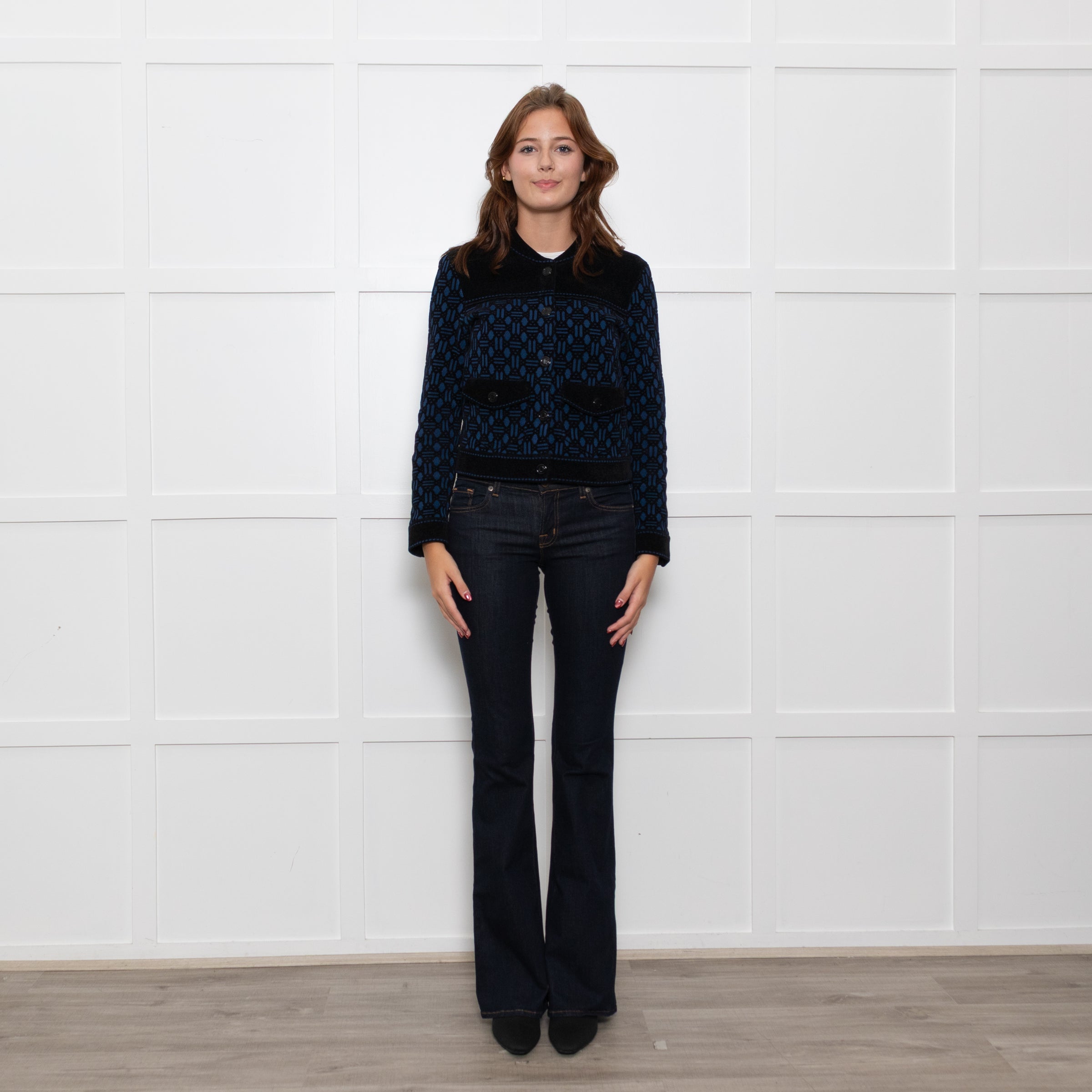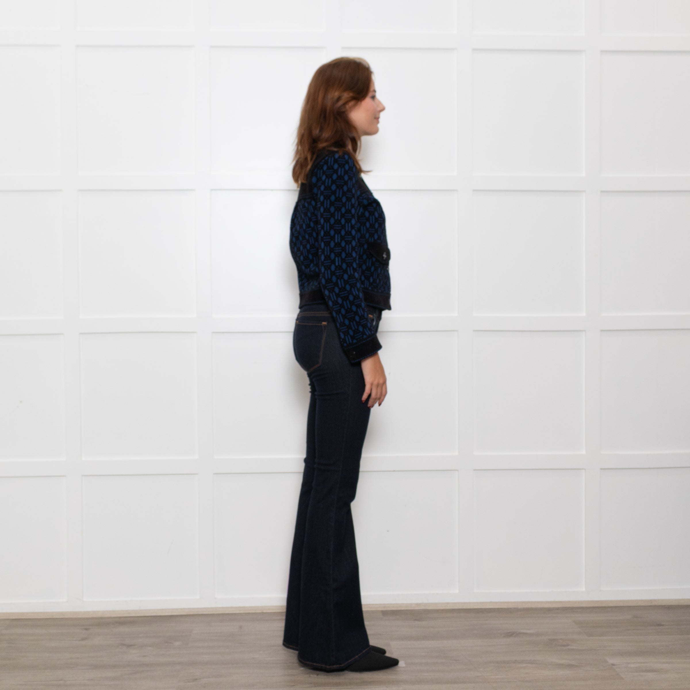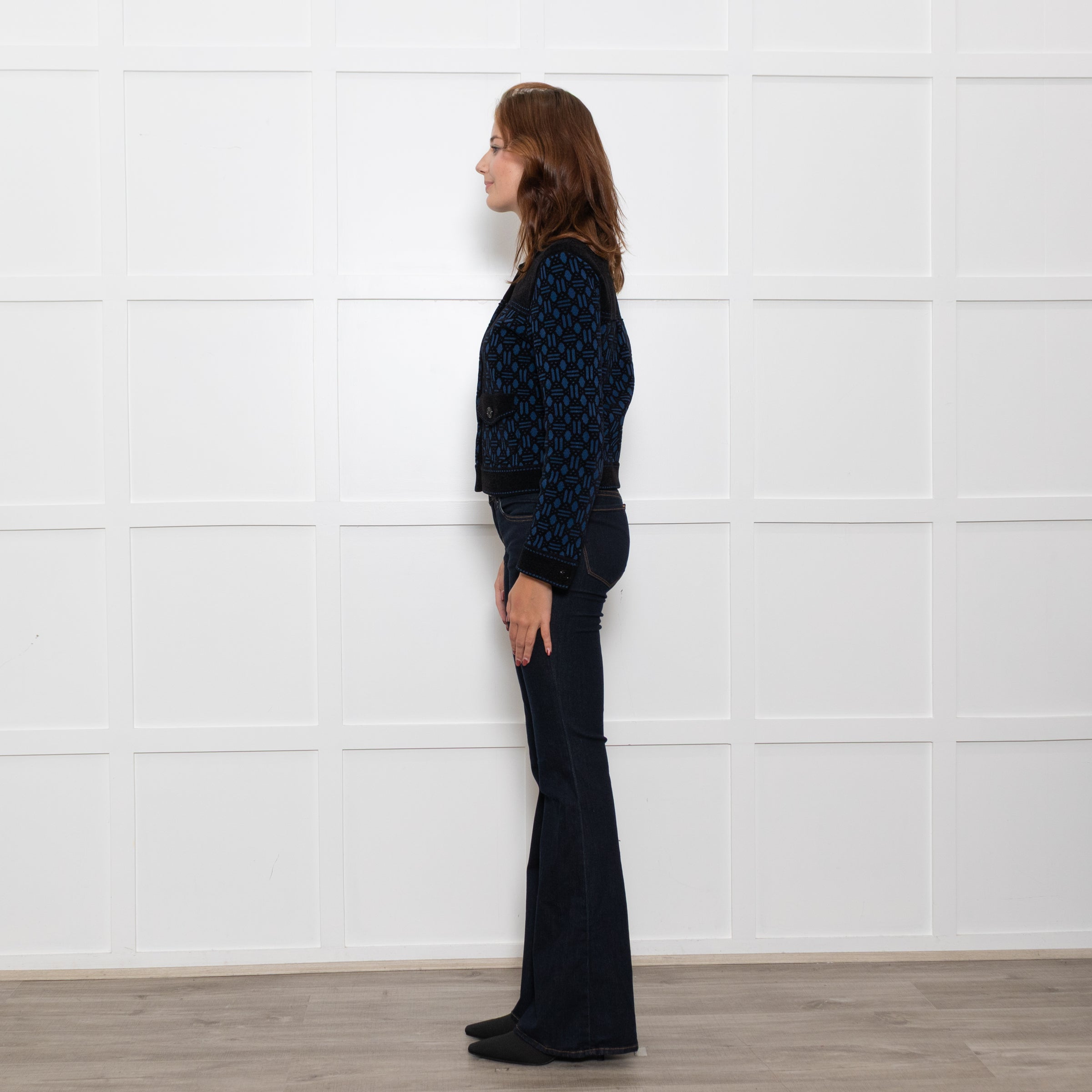Maje black and blue printed short jacket featuring a striking blue pattern design, four-button front with two-button flap pockets for a chic finish.