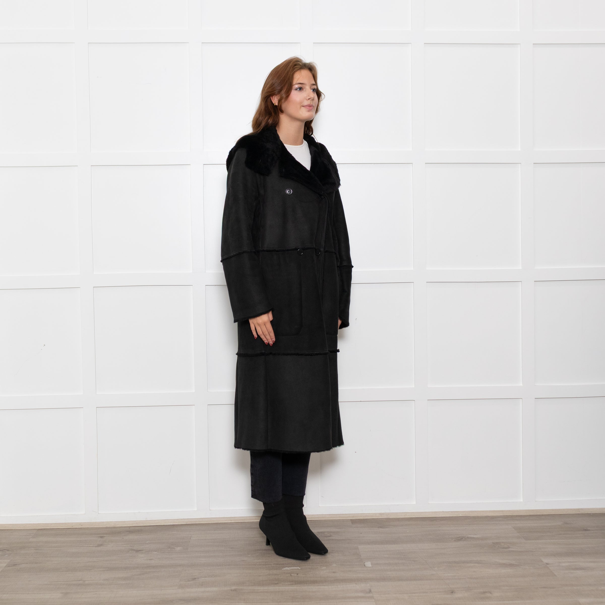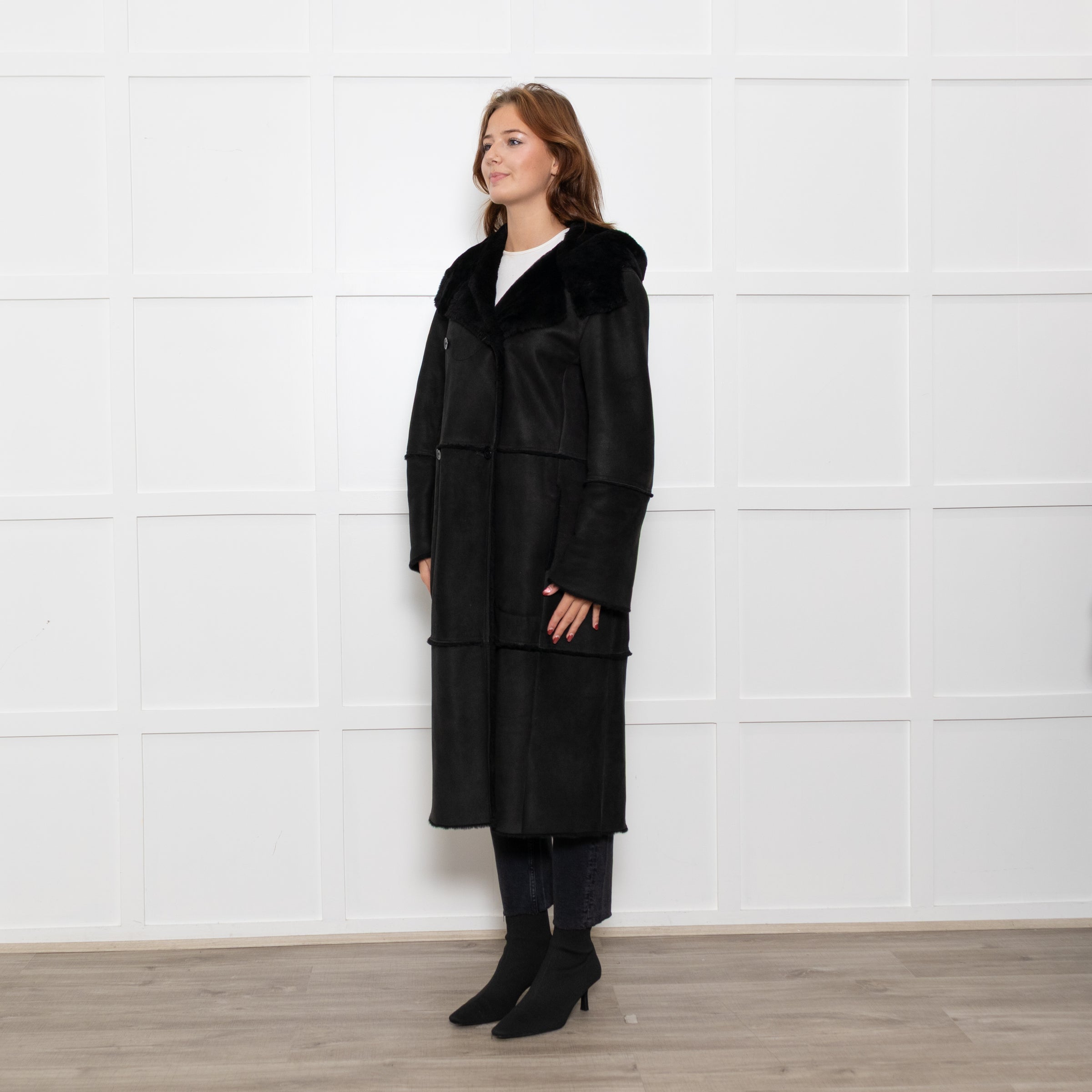 Max Mara black shearling long coat, featuring a warm hood, luxurious fur-style inner lining, and two spacious front pockets. Finished with a button front and additional concealed buttons.